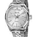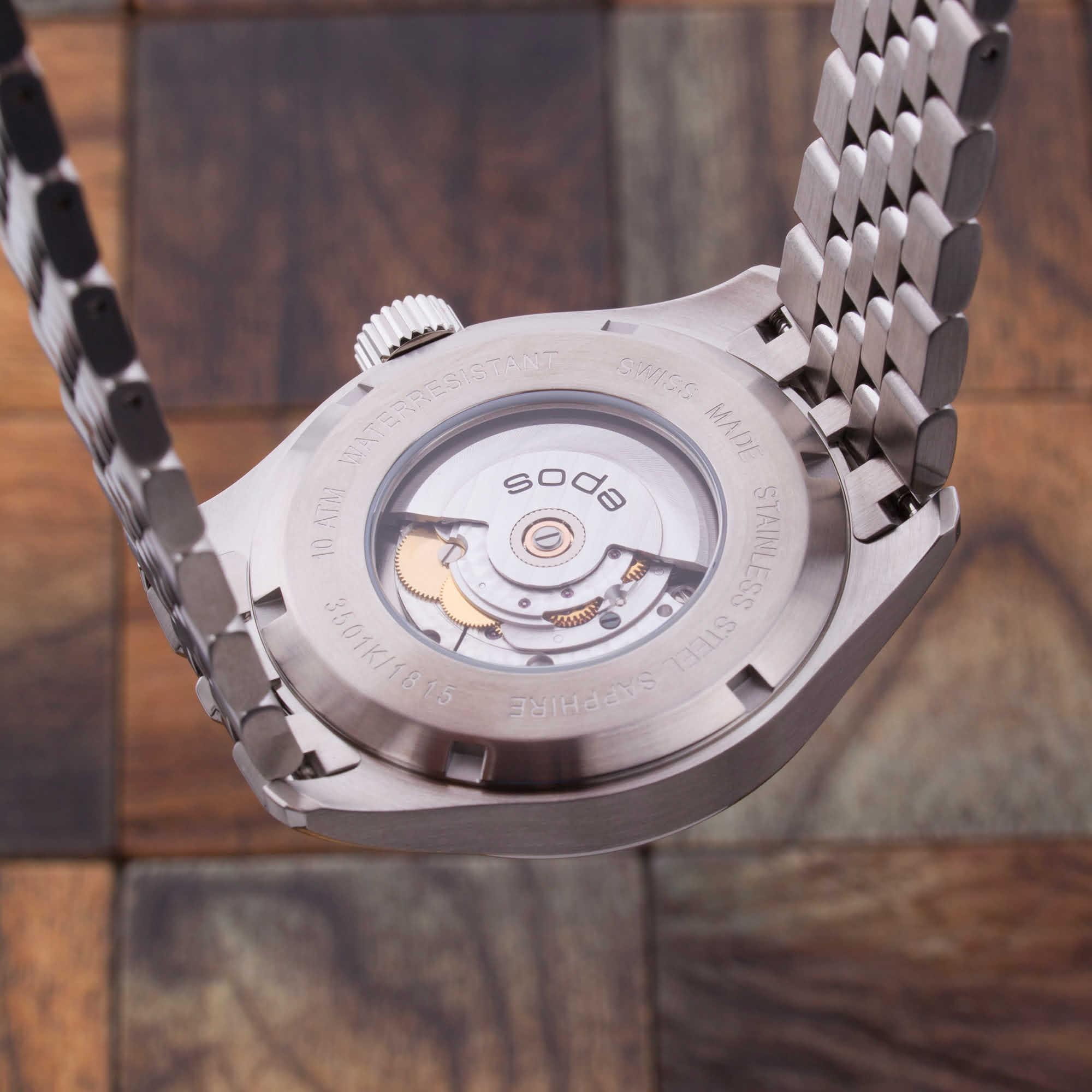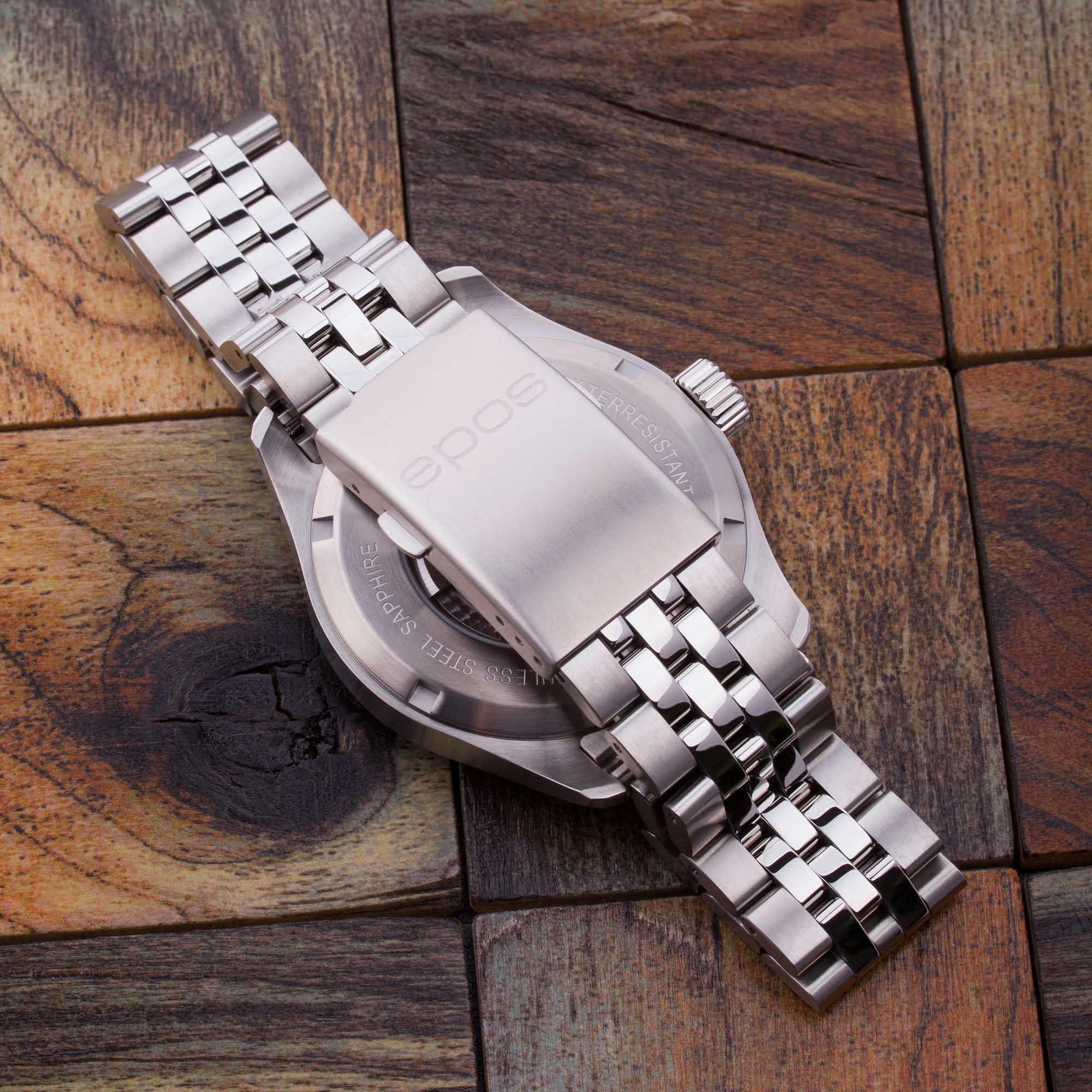 Мужские механические часы с автоподзаводом Epos из коллекции Passion — это сочетание швейцарского мастерства и современного дизайна. Корпус диаметром 41 мм и толщиной 11 мм выполнен из нержавеющей стали 316L. Циферблат серебристого цвета оформлен индексами и дополнен окошками даты и дня недели. Циферблат защищён сапфировым стекломСапфировое стеклоПрочный и надёжный материал из кристалла сапфира синтетического происхождения, характеризующийся особой твёрдостью и устойчивостью к царапинам и повреждениям.. Стрелки и метки с люминесцентным покрытиемЛюминесцентное покрытиеПозволяет считывать показания времени в темноте. Производители наносят на стрелки, часовые индексы, безель или поверхность циферблата светонакопительный состав, дающий холодное свечение., обеспечивающим хорошую читаемость в темноте. Прозрачная задняя крышка позволяет наблюдать за работой механизма. Часы оснащены стальным браслетом на застёжке «бабочка» с кнопкамиЗастёжка "бабочка"Такой вид застёжки дополняется предохранителями, помогающими избежать случайного раскрытия браслета. Обладают изящным исполнением. . Водонепроницаемость 100 м позволяет использовать часы для плавания и повседневного ношения. Гарантия — 24 месяца. Универсальный выбор для ценителя механики и выразительного стиля.