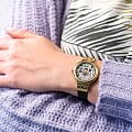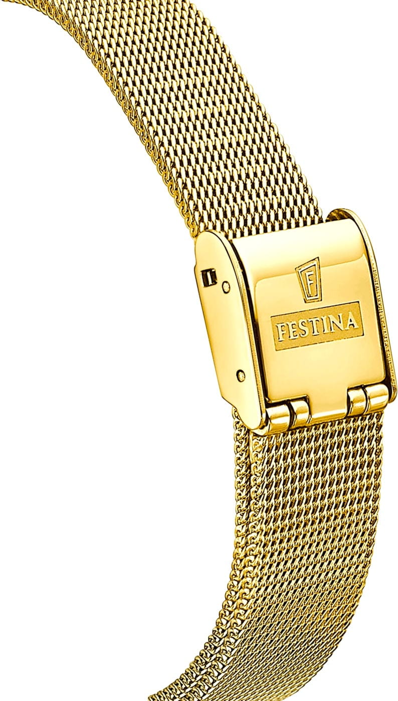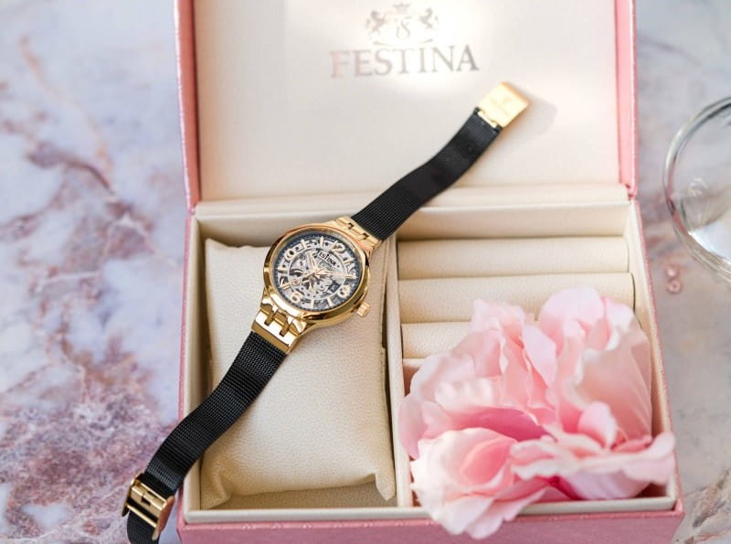 Женские механические часы-скелетоны Festina Automatic F20580/2, механический механизм (автоматический калибр) с высокой точностью. Сапфировое стеклоСапфировое стеклоПрочный и надёжный материал из кристалла сапфира синтетического происхождения, характеризующийся особой твёрдостью и устойчивостью к царапинам и повреждениям. устойчивое к появлению царапин, обладающее высокой прозрачностью. Класс водозащиты: 50 метров, позволит защитить корпус от случайных брызг или капель дождя. Корпус часов изготовлен из стали с PVD-покрытиемPVDУльтратонкое покрытие наносится в технике вакуумного напыления, сочетает в себе нитрид титана особой прочности со слоем золота или оксида хрома. Несёт в себе декоративную или защитную функцию.. Стальной миланского плетения браслет на раскладной застёжкеРаскладная застёжкаТакой тип застёжки используется только на браслетах из металла. Она никогда не раскрывается полностью, происходит разделение на 2 и более частей. Раскладывающая застёжка снизит вероятность потери часов к минимуму. с PVD-покрытиемPVDУльтратонкое покрытие наносится в технике вакуумного напыления, сочетает в себе нитрид титана особой прочности со слоем золота или оксида хрома. Несёт в себе декоративную или защитную функцию.. БезельБезельВнешний ободок, закрепляющий стекло. В спортивных часах так называется поворотное кольцо с делениями на циферблате, выполняет роль таймера – замеряет отрезки времени на шкале. Неподвижный безель – элемент декора. Однонаправленно вращающийся безель на дайверских часах позволяет фиксировать моменты погружения и выныривания на поверхность. с PVD-покрытиемPVDУльтратонкое покрытие наносится в технике вакуумного напыления, сочетает в себе нитрид титана особой прочности со слоем золота или оксида хрома. Несёт в себе декоративную или защитную функцию.. Циферблат с метками в виде штрихов и арабских цифр. Рифленая заводная головка.