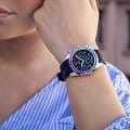 Яркий стиль и функциональность этих часов придутся по душе активной девушке. Часы-хронографХронографФункция позволяет измерять отрезки времени с особой точностью: часы, минуты, секунды. Верным признаком хронографа является наличие на циферблате 3 дополнительных окошек-счётчиков.. Кварцевый механизм с высокой точностью. Минеральное стеклоМинеральное стеклоМинеральное стекло представляет собой искусственно выращенный минерал кварца. Такое стекло отличается особой устойчивостью к повреждениям и царапинам. Уступает по некоторым качествам сапфировому стеклу. устойчивое к появлению царапин, обладающее высокой прозрачностью. Черный циферблат. Стрелки и метки с люминесцентным покрытиемЛюминесцентное покрытиеПозволяет считывать показания времени в темноте. Производители наносят на стрелки, часовые индексы, безель или поверхность циферблата светонакопительный состав, дающий холодное свечение.. БезельБезельВнешний ободок, закрепляющий стекло. В спортивных часах так называется поворотное кольцо с делениями на циферблате, выполняет роль таймера – замеряет отрезки времени на шкале. Неподвижный безель – элемент декора. Однонаправленно вращающийся безель на дайверских часах позволяет фиксировать моменты погружения и выныривания на поверхность. украшен цветными кристаллами. Класс водозащиты: 100 метров, позволит плавать, нырять и заниматься другими водными видами спорта. Корпус часов изготовлен из нержавеющей стали. Каучуковый ремешок с классической застежкой.