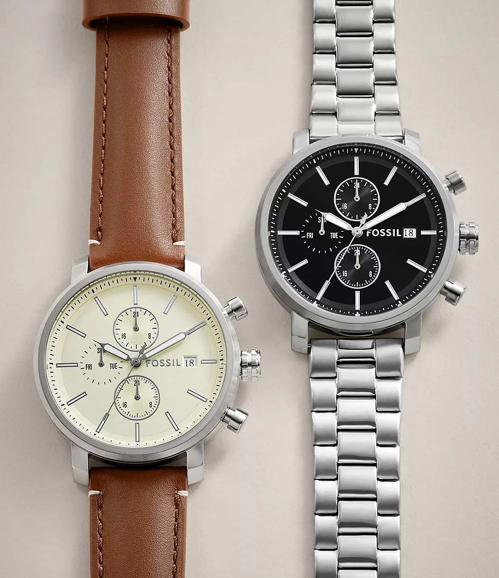 Часы Fossil Rhett BQ2851 идеально подойдут для тех, кто ценит классический стиль, дополненный современными деталями, и ищет аксессуар, способный подчеркнуть их индивидуальность и элегантность. Эти мужские наручные часы производятся в США и оснащены надежным кварцевым механизмом, который обеспечивает точность и стабильность в работе. Корпус из нержавеющей стали диаметром 42 мм гарантирует долговечность и придает часам стильный и современный вид. Циферблат, выполненный по технологии Sunray, создает эффект солнечных лучей, что добавляет глубину и изысканность дизайну. Метки в виде штрихов придают циферблату классический акцент, а рифленая заводная головка облегчает настройку времени. Стрелки и метки с люминесцентным покрытиемЛюминесцентное покрытиеПозволяет считывать показания времени в темноте. Производители наносят на стрелки, часовые индексы, безель или поверхность циферблата светонакопительный состав, дающий холодное свечение. позволяют легко считывать время даже в условиях низкой освещенности. Стальной браслет на раскладной застёжкеРаскладная застёжкаТакой тип застёжки используется только на браслетах из металла. Она никогда не раскрывается полностью, происходит разделение на 2 и более частей. Раскладывающая застёжка снизит вероятность потери часов к минимуму. обеспечивает комфортное ношение и надежную фиксацию на запястье. Водозащита уровня 50WR защищает механизм от случайных брызг, а минеральное стеклоМинеральное стеклоМинеральное стекло представляет собой искусственно выращенный минерал кварца. Такое стекло отличается особой устойчивостью к повреждениям и царапинам. Уступает по некоторым качествам сапфировому стеклу. оберегает циферблат от царапин и повреждений. 12-ти и 24-х часовой формат времени. Второй часовой поясВторой часовой поясФункция, позволяющая отображать время двух часовых поясов одновременно. в 24-х часовом формате.