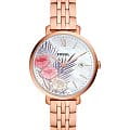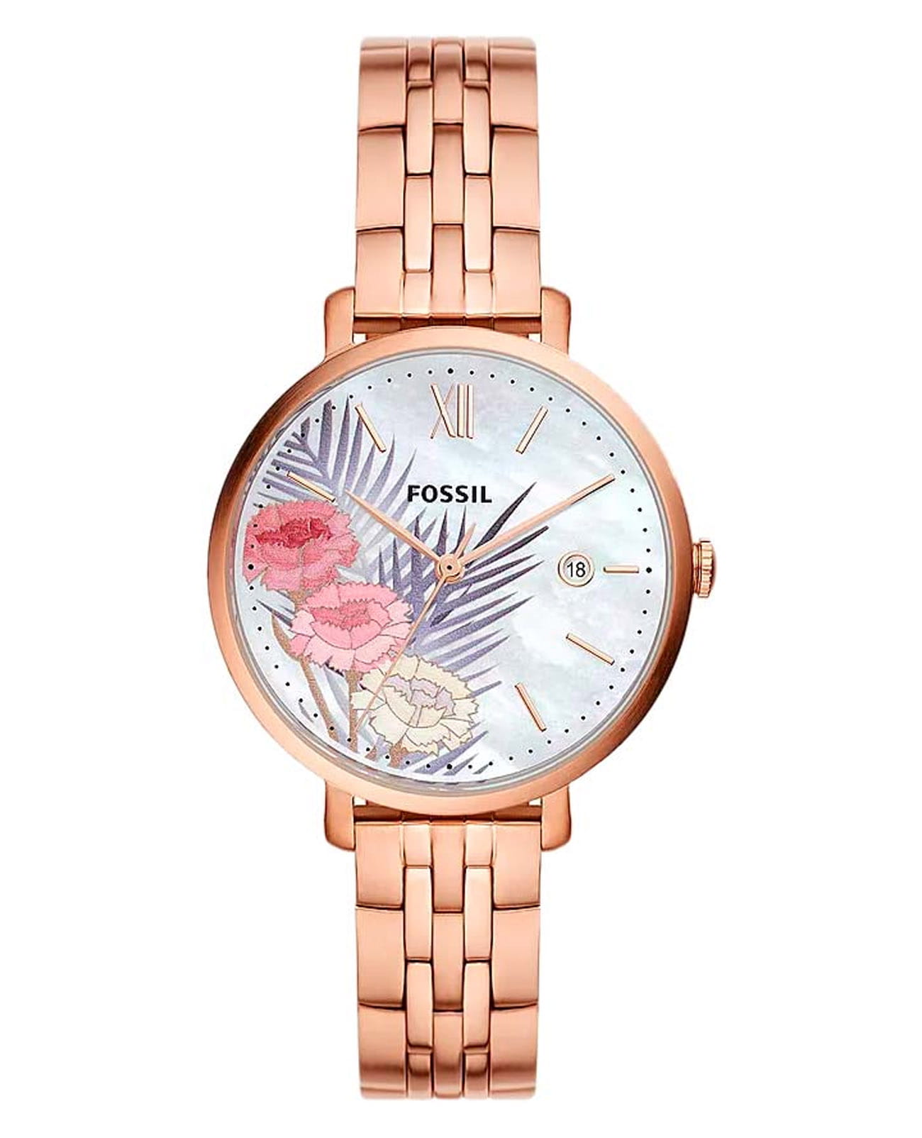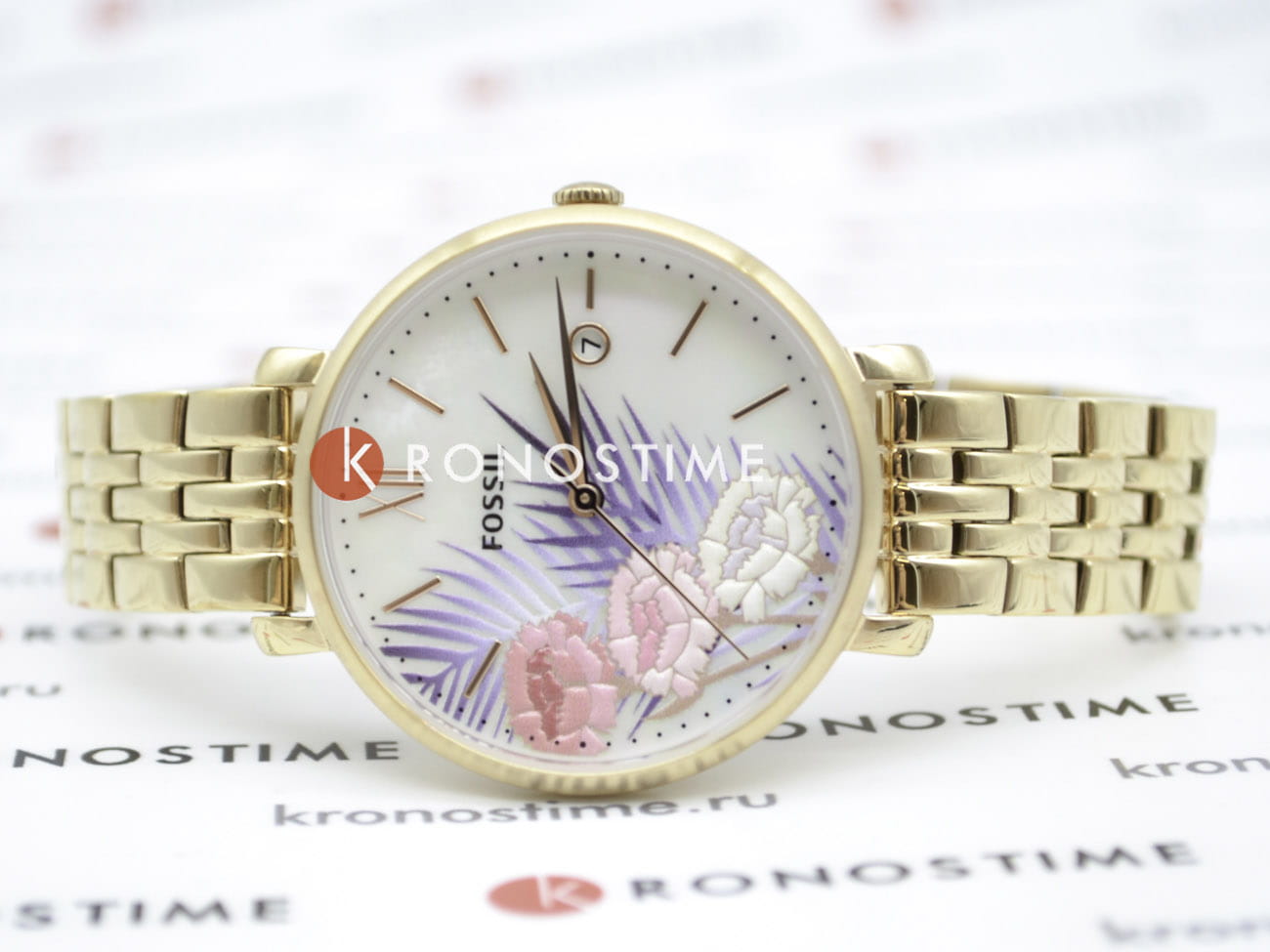 Женские американские часы с минеральным стекломМинеральное стеклоМинеральное стекло представляет собой искусственно выращенный минерал кварца. Такое стекло отличается особой устойчивостью к повреждениям и царапинам. Уступает по некоторым качествам сапфировому стеклу. Fossil Jacqueline ES5275, кварцевый механизм с высокой точностью. Корпус и браслет часов изготовлены из нержавеющей стали с IP-покрытиемIP-покрытиеМетод ионного напыления. Демонстрирует повышенную устойчивость к истиранию, окислению и химическим веществам. Под воздействием высокого давления и температуры около 1500°C молекулы металла надёжно соединяются с частицами корпуса часов.. Перламутровый циферблат украшен объемным изображением цветов. Метки в виде штрихов и римской цифры XII. Окошко даты находится в положении 3 часа. Рифленая заводная головка с защитой. Класс водозащиты: 30 метров, позволит защитить корпус от случайных брызг или капель дождя. Стальной браслет на раскладной застёжкеРаскладная застёжкаТакой тип застёжки используется только на браслетах из металла. Она никогда не раскрывается полностью, происходит разделение на 2 и более частей. Раскладывающая застёжка снизит вероятность потери часов к минимуму..