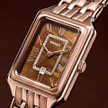 Женские американские часы с минеральным стекломМинеральное стеклоМинеральное стекло представляет собой искусственно выращенный минерал кварца. Такое стекло отличается особой устойчивостью к повреждениям и царапинам. Уступает по некоторым качествам сапфировому стеклу. Fossil Raquel ES5323, кварцевый механизм с высокой точностью. Корпус и браслет часов изготовлены из нержавеющей стали с IP-покрытиемIP-покрытиеМетод ионного напыления. Демонстрирует повышенную устойчивость к истиранию, окислению и химическим веществам. Под воздействием высокого давления и температуры около 1500°C молекулы металла надёжно соединяются с частицами корпуса часов.. Класс водозащиты: 50 метров, позволит защитить корпус от случайных брызг или капель дождя. Стальной браслет на раскладной застёжкеРаскладная застёжкаТакой тип застёжки используется только на браслетах из металла. Она никогда не раскрывается полностью, происходит разделение на 2 и более частей. Раскладывающая застёжка снизит вероятность потери часов к минимуму.. Окошко даты находится в положении 6 часов. Циферблат украшен кристаллами.
