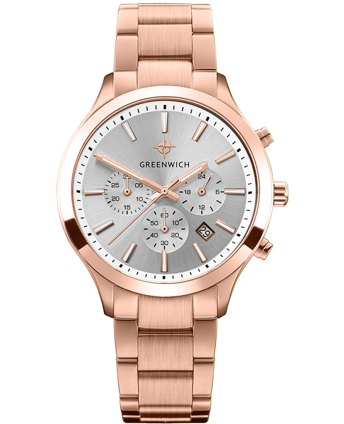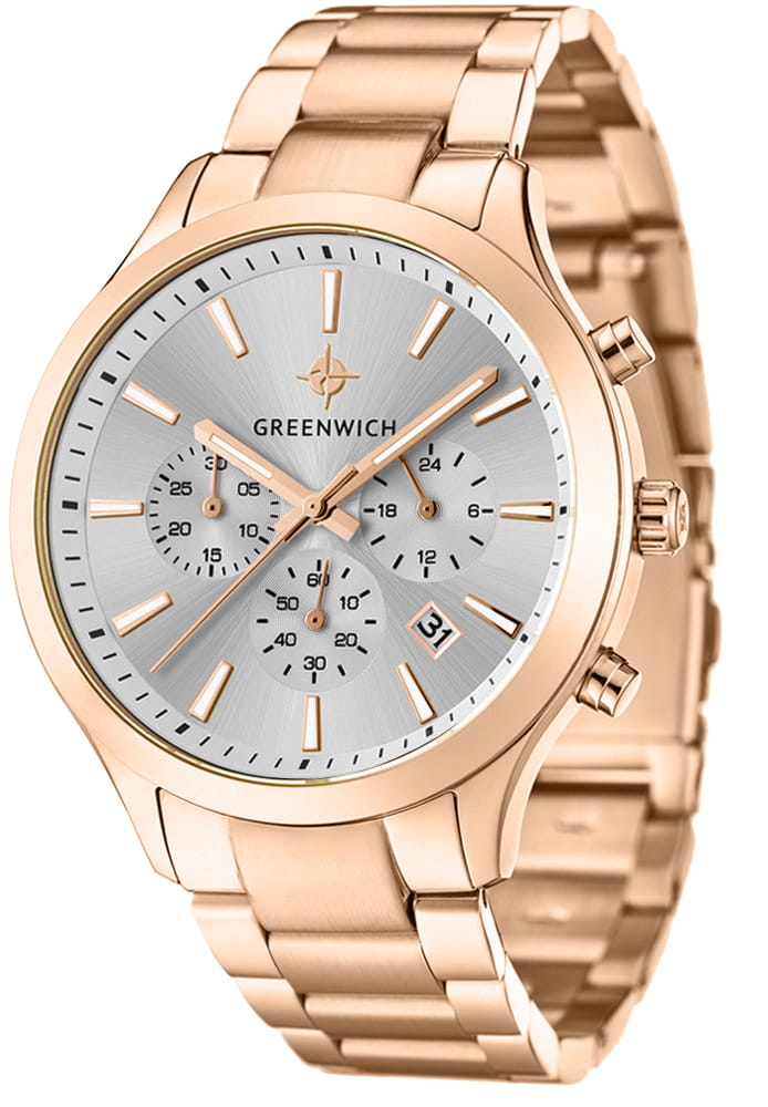 Мужские наручные часы Greenwich 043.40.33 c хронографомХронографФункция позволяет измерять отрезки времени с особой точностью: часы, минуты, секунды. Верным признаком хронографа является наличие на циферблате 3 дополнительных окошек-счётчиков. представляют собой классический вариант для повседневной носки. Циферблат украшается брендовым логотипом, изображающим Розу Ветров. Эмблема мореплавательского духа символизирует удачу, стремление достигнуть поставленной цели. Часы характеризуются традиционными формами, лаконичным исполнением, что делает модель элегантным дополнением к деловому костюму. Надёжный корпус из нержавеющей стали с PVD-покрытиемPVDУльтратонкое покрытие наносится в технике вакуумного напыления, сочетает в себе нитрид титана особой прочности со слоем золота или оксида хрома. Несёт в себе декоративную или защитную функцию.. спасает японский механизм от повреждений и ударов. Минеральное стеклоМинеральное стеклоМинеральное стекло представляет собой искусственно выращенный минерал кварца. Такое стекло отличается особой устойчивостью к повреждениям и царапинам. Уступает по некоторым качествам сапфировому стеклу. отличается устойчивостью к образованию царапин на поверхности. Стрелки и метки с люминесцентным покрытиемЛюминесцентное покрытиеПозволяет считывать показания времени в темноте. Производители наносят на стрелки, часовые индексы, безель или поверхность циферблата светонакопительный состав, дающий холодное свечение.. Окошко даты находится в положении между 4 и 5 часов. Стальной браслет с PVD-покрытиемPVDУльтратонкое покрытие наносится в технике вакуумного напыления, сочетает в себе нитрид титана особой прочности со слоем золота или оксида хрома. Несёт в себе декоративную или защитную функцию.. на раскладной застёжкеРаскладная застёжкаТакой тип застёжки используется только на браслетах из металла. Она никогда не раскрывается полностью, происходит разделение на 2 и более частей. Раскладывающая застёжка снизит вероятность потери часов к минимуму..