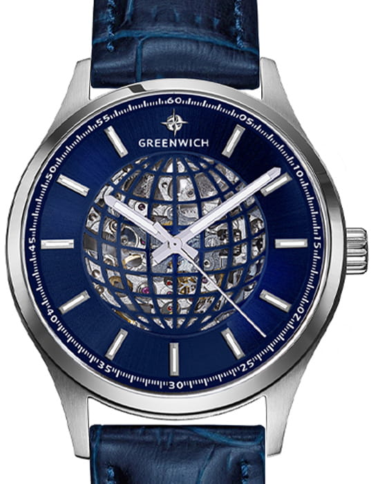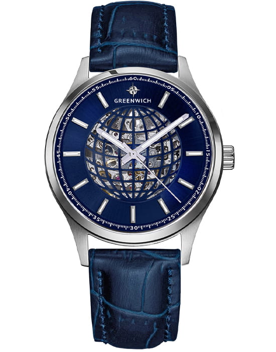 Мужские механические часы с минеральным стекломМинеральное стеклоМинеральное стекло представляет собой искусственно выращенный минерал кварца. Такое стекло отличается особой устойчивостью к повреждениям и царапинам. Уступает по некоторым качествам сапфировому стеклу. Greenwich Globe GW 056.16.36. Корпус часов изготовлен из стали. Стрелки с люминесцентным покрытиемЛюминесцентное покрытиеПозволяет считывать показания времени в темноте. Производители наносят на стрелки, часовые индексы, безель или поверхность циферблата светонакопительный состав, дающий холодное свечение.. Класс водозащиты: 100 метров, позволит плавать, нырять и заниматься другими водными видами спорта. Кожаный ремешок на стандартной застёжке.