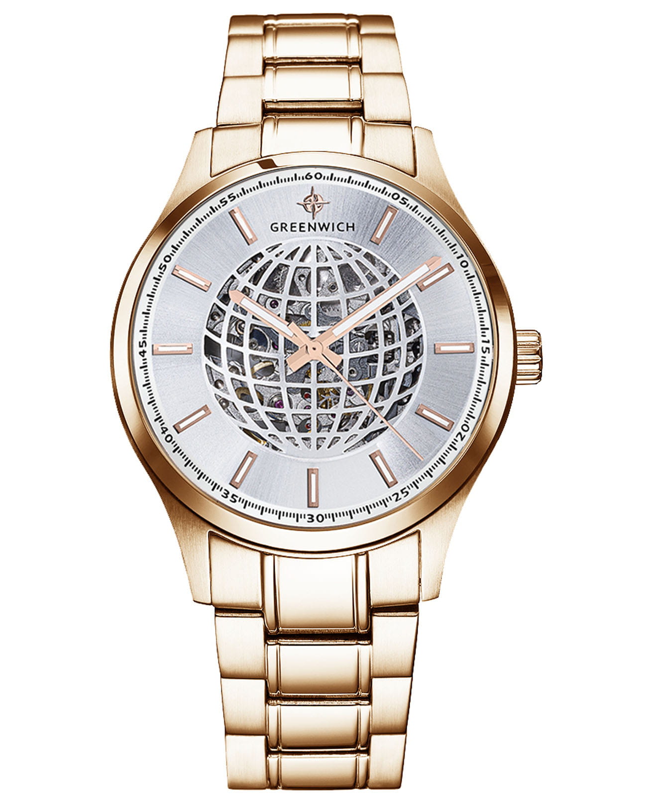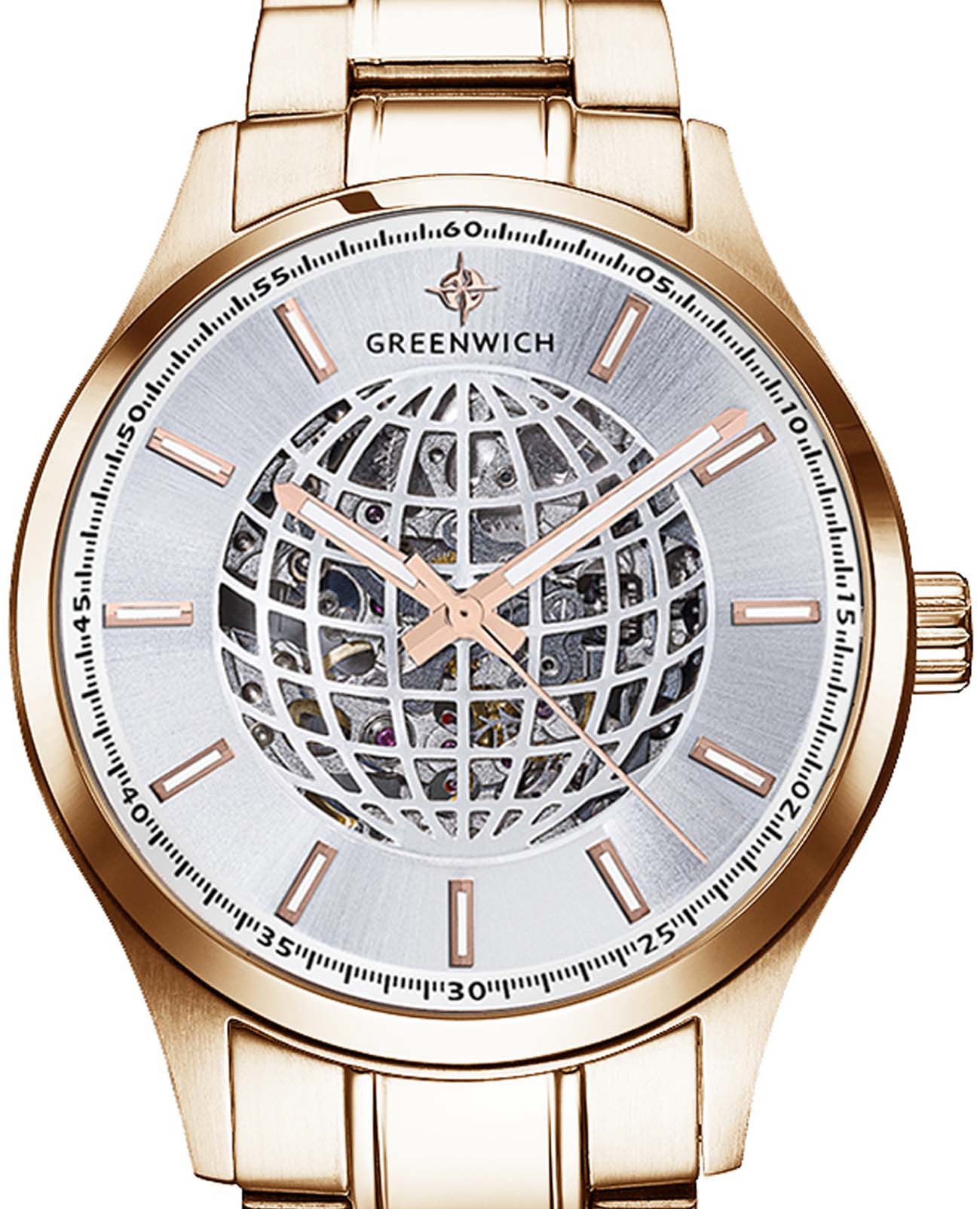 Мужские механические часы с минеральным стекломМинеральное стеклоМинеральное стекло представляет собой искусственно выращенный минерал кварца. Такое стекло отличается особой устойчивостью к повреждениям и царапинам. Уступает по некоторым качествам сапфировому стеклу. Greenwich Globe GW 056.40.33. Корпус часов изготовлен из стали с PVD-покрытиемPVDУльтратонкое покрытие наносится в технике вакуумного напыления, сочетает в себе нитрид титана особой прочности со слоем золота или оксида хрома. Несёт в себе декоративную или защитную функцию.. Стрелки с люминесцентным покрытиемЛюминесцентное покрытиеПозволяет считывать показания времени в темноте. Производители наносят на стрелки, часовые индексы, безель или поверхность циферблата светонакопительный состав, дающий холодное свечение.. Класс водозащиты: 100 метров, позволит плавать, нырять и заниматься другими водными видами спорта. Стальной браслет на раскладной застёжкеРаскладная застёжкаТакой тип застёжки используется только на браслетах из металла. Она никогда не раскрывается полностью, происходит разделение на 2 и более частей. Раскладывающая застёжка снизит вероятность потери часов к минимуму. с PVD-покрытиемPVDУльтратонкое покрытие наносится в технике вакуумного напыления, сочетает в себе нитрид титана особой прочности со слоем золота или оксида хрома. Несёт в себе декоративную или защитную функцию..