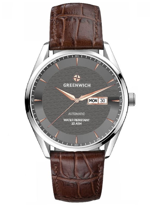 Мужские часы с минеральным стекломМинеральное стеклоМинеральное стекло представляет собой искусственно выращенный минерал кварца. Такое стекло отличается особой устойчивостью к повреждениям и царапинам. Уступает по некоторым качествам сапфировому стеклу. Greenwich Good Luck Classic GW 074.12.34, представляют собой классический вариант для повседневной носки. В центральной части циферблата — отличительная черта моделей этой серии: гильоше, объемные линии которого напоминают волны. Обратите внимание на форму пластины, где крепятся накладные риски: она сделана в форме латинской буквы G, первой буквы в названии бренда. Часы характеризуются традиционными формами, лаконичным исполнением, что делает модель элегантным дополнением к деловому костюму. Сквозь прозрачную заднюю крышку вы увидите детали механизма TMI с декорированным ротором: на нем выгравировано изображение символа английских моряков — парусника. Ремешок коричневого цвета выполнен из натуральной кожи с прошивкой в тон. Дизайн, актуальный для любого современного образа, и надежность используемых материалов делают автоматические часы Greenwich удобным и стильным аксессуаром на каждый день.
