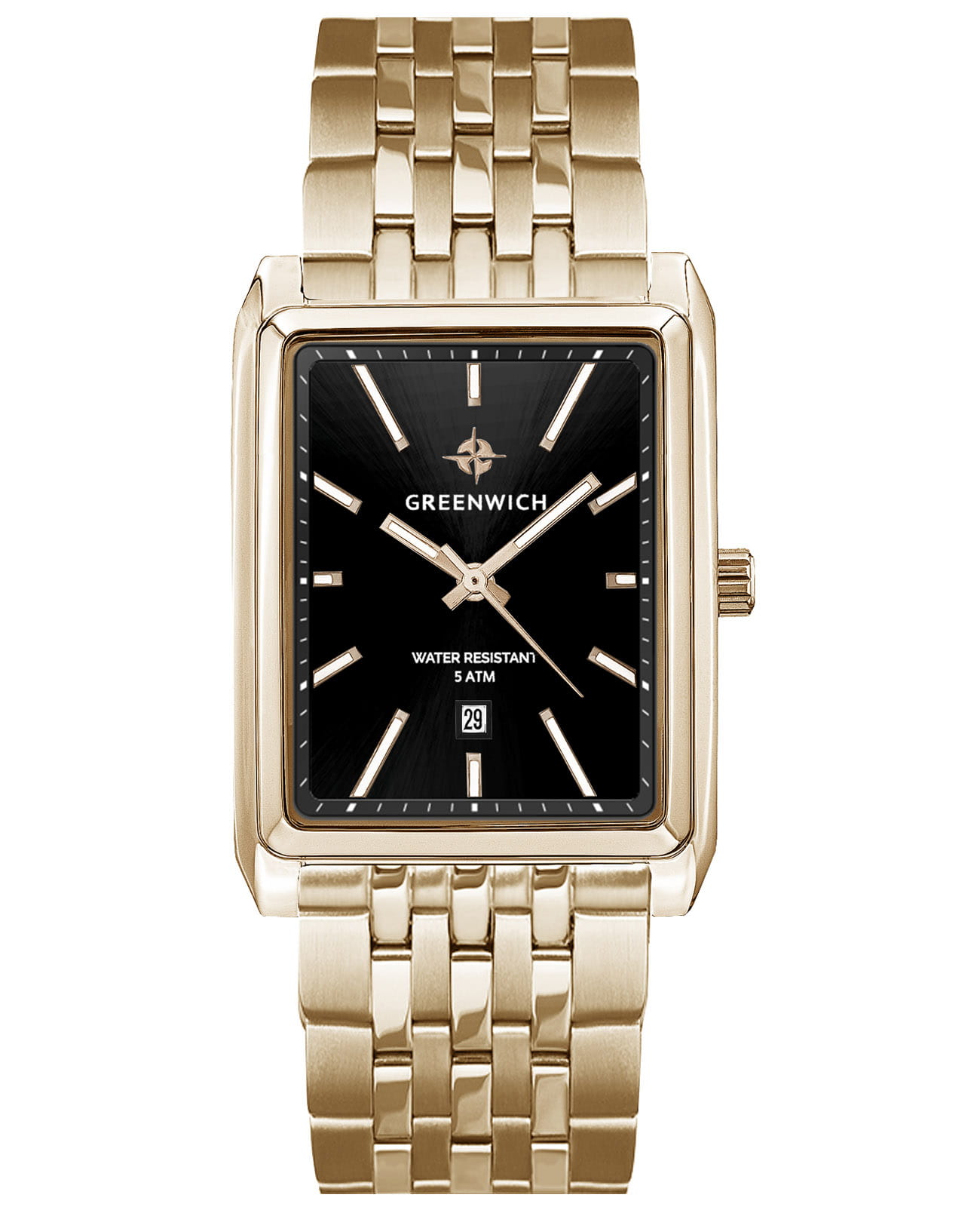 Часы Greenwich GW 541.40.11 из коллекции Galeon — элегантная мужская модель, сочетающая классический дизайн и современные технологии. Корпус размером 33 x 40 мм выполнен из нержавеющей стали с PVD-покрытиемPVDУльтратонкое покрытие наносится в технике вакуумного напыления, сочетает в себе нитрид титана особой прочности со слоем золота или оксида хрома. Несёт в себе декоративную или защитную функцию. розового золота. Чёрный циферблат с полировкой «солнечные лучи» оснащён крупными стрелками с люминесцентным покрытием для удобного считывания времени в условиях низкой освещённости и защищён минеральным стекломМинеральное стеклоМинеральное стекло представляет собой искусственно выращенный минерал кварца. Такое стекло отличается особой устойчивостью к повреждениям и царапинам. Уступает по некоторым качествам сапфировому стеклу.. Модель оснащена кварцевым механизмом Miyota, обеспечивающим высокую точность хода. На циферблате расположено окно даты в позиции «6 часов». Водозащита до 5 ATM (50 метров) делает часы подходящими для повседневного использования, включая умывание и случайные брызги. Металлический браслет с раскладной застёжкойРаскладная застёжкаТакой тип застёжки используется только на браслетах из металла. Она никогда не раскрывается полностью, происходит разделение на 2 и более частей. Раскладывающая застёжка снизит вероятность потери часов к минимуму. и PVD-покрытиемPVDУльтратонкое покрытие наносится в технике вакуумного напыления, сочетает в себе нитрид титана особой прочности со слоем золота или оксида хрома. Несёт в себе декоративную или защитную функцию. розового золота обеспечивает комфортное ношение и надёжную фиксацию на запястье. Эта модель гармонично сочетает традиционный стиль и современные элементы, подходя как для деловых встреч, так и для повседневного ношения.