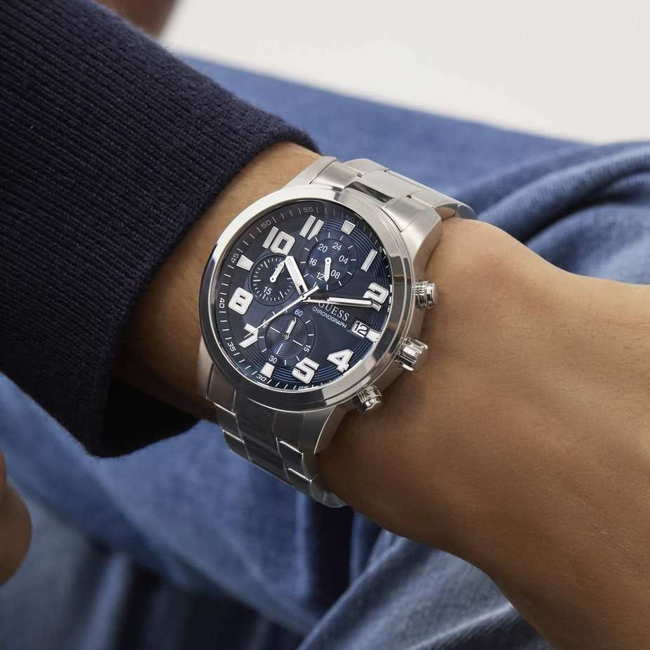 Часы Guess GW0917G1 — это стильный и функциональный аксессуар, который поможет вам всегда быть в курсе времени, независимо от обстоятельств. Эти мужские часы оснащены надежным кварцевым механизмом и имеют круглый стальной корпус диаметром 44 мм и толщиной 13 мм. Синий циферблат, выполненный по технологии Sunray, создает эффект солнечных лучей, добавляя глубину и элегантность дизайну. Циферблат оснащен метками в виде арабских цифр и поддерживает 12-ти и 24-х часовой формат времени, а окошко даты с днем недели, расположенное в позиции 3 часа, добавляет практичности. Отдельные циферблаты для отображения даты и дня недели делают использование часов особенно удобным. Люминесцентное покрытиеЛюминесцентное покрытиеПозволяет считывать показания времени в темноте. Производители наносят на стрелки, часовые индексы, безель или поверхность циферблата светонакопительный состав, дающий холодное свечение. на стрелках обеспечивает отличную видимость в темноте. Рифленая заводная головка обеспечивает дополнительный комфорт в эксплуатации. Стальной браслет с раскладной застежкойРаскладная застёжкаТакой тип застёжки используется только на браслетах из металла. Она никогда не раскрывается полностью, происходит разделение на 2 и более частей. Раскладывающая застёжка снизит вероятность потери часов к минимуму. гарантирует комфортное ношение и надежную фиксацию. Минеральное стеклоМинеральное стеклоМинеральное стекло представляет собой искусственно выращенный минерал кварца. Такое стекло отличается особой устойчивостью к повреждениям и царапинам. Уступает по некоторым качествам сапфировому стеклу. защищает циферблат от царапин и повреждений, а водозащита 50WR позволяет не беспокоиться о случайном попадании воды. Эти часы станут отличным дополнением вашего образа, подчеркивая ваш вкус и внимание к деталям.