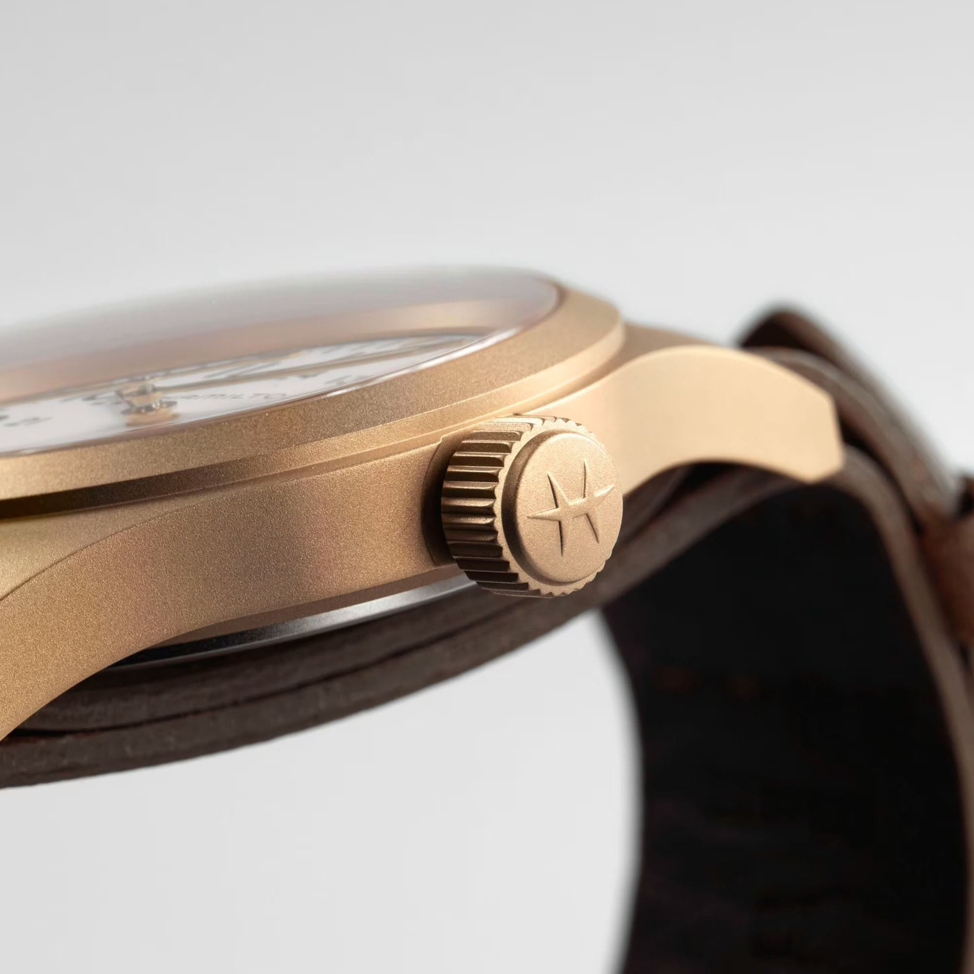 Мужские механические швейцарские часы Hamilton Khaki Field Mechanical Bronze H69459510, механический механизм (автоматический калибр) с высокой точностью. Сапфировое стеклоСапфировое стеклоПрочный и надёжный материал из кристалла сапфира синтетического происхождения, характеризующийся особой твёрдостью и устойчивостью к царапинам и повреждениям. устойчивое к появлению царапин, обладающее высокой прозрачностью. Класс водозащиты: 50 метров, позволит защитить корпус от случайных брызг или капель дождя. Корпус часов изготовлен из титана и бронзы. Ремешок NATOРемешок NATOРемешок NATO — это прочный, универсальный и сменный часовой ремешок, изначально созданный для военных. Он изготовлен из нейлона или другого прочного материала и имеет уникальную конструкцию, которая позволяет часам оставаться на запястье даже в случае поломки одной из прикрепляющих точек. из мягкой кожи.