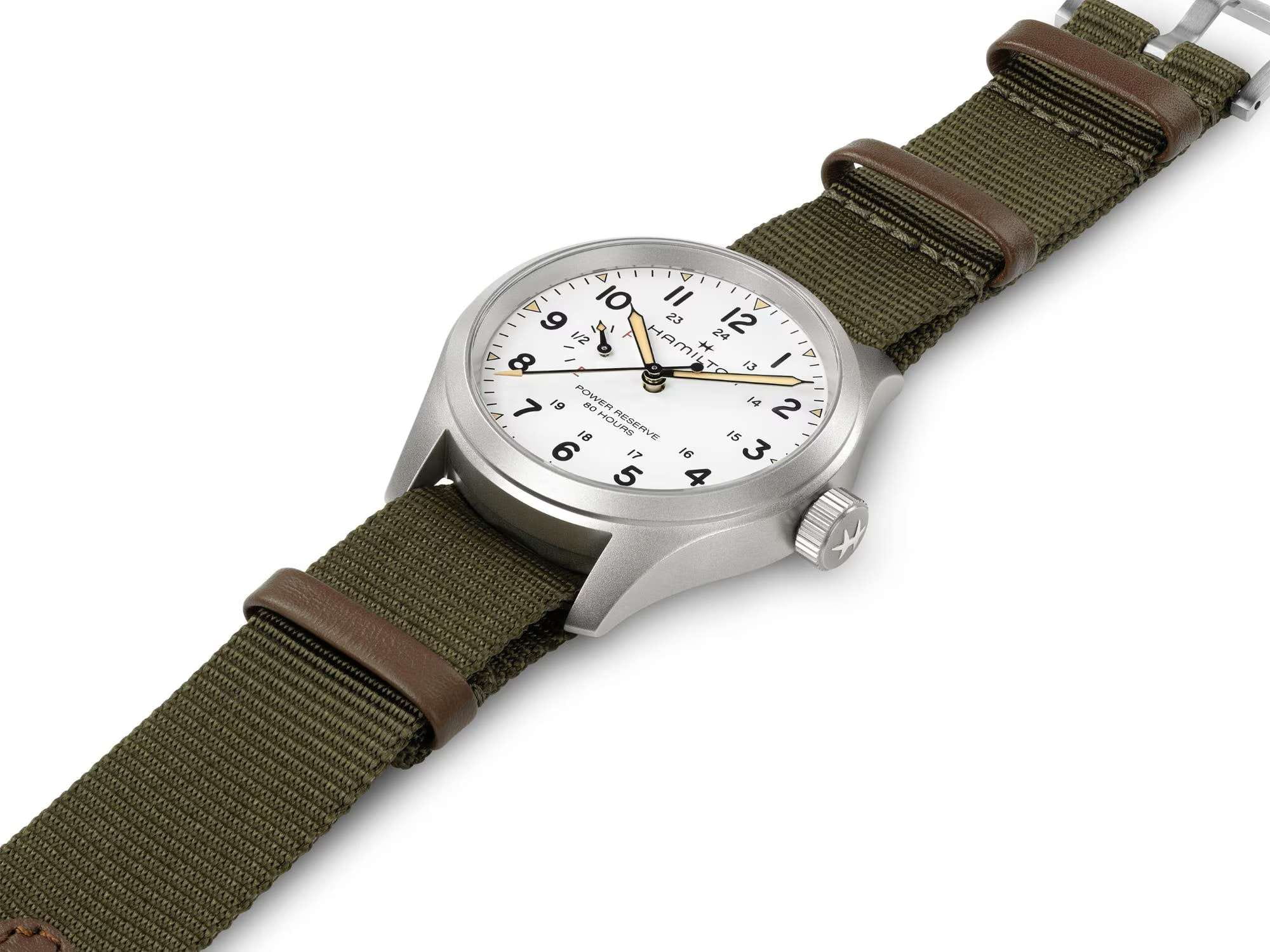 Мужские наручные часы Hamilton Khaki Field Mechanical Power Reserve 40mm H69509910 сочетают в себе спортивный стиль и элегантный дизайн. Модель обладает круглым корпусом диаметром 40 мм, изготовленным из нержавеющей стали, что обеспечивает высокую устойчивость к внешним воздействиям. Изысканный ремешок выполнен из ткани со стандартной застежкой, гарантирующей комфортное ношение и безопасность. Лаконичный циферблат оснащен крупными цифрами и стрелками с люминесцентным покрытиемЛюминесцентное покрытиеПозволяет считывать показания времени в темноте. Производители наносят на стрелки, часовые индексы, безель или поверхность циферблата светонакопительный состав, дающий холодное свечение. Super-LumiNova®, обеспечивающим превосходную видимость в темноте. Для защиты используется сапфировое стеклоСапфировое стеклоПрочный и надёжный материал из кристалла сапфира синтетического происхождения, характеризующийся особой твёрдостью и устойчивостью к царапинам и повреждениям., которое эффективно противостоит царапинам и имеет антибликовое покрытиеАнтибликовое покрытиеСлой оксида металла в 0,13-0,3 микрон, благодаря которому стекло часов не бликует и не отражает свет. Антибликовое покрытие уменьшает отражение света в 10 раз, обеспечивая отличную читаемость показателей циферблата.. Часы работают с помощью механизма H-23. Механизм с пружиной баланса Nivachron™Nivachron™Специально разработанный инновационный сплав Nivachron™ повышает устойчивость часов к воздействию магнитных полей. гарантирует точность хода, устойчивость к магнитным полям. На циферблате также буквы «F» для обозначения полного заряда и «E» для обозначения пустого заряда, что подчеркивает эту исключительную и практичную функцию. Водонепроницаемость часов достигает 10 атмосфер (100 метров), делающая их подходящими для повседневного использования и активного отдыха. Это сочетание высокой прочности, точности и изысканного дизайна для уверенных в себе мужчин.