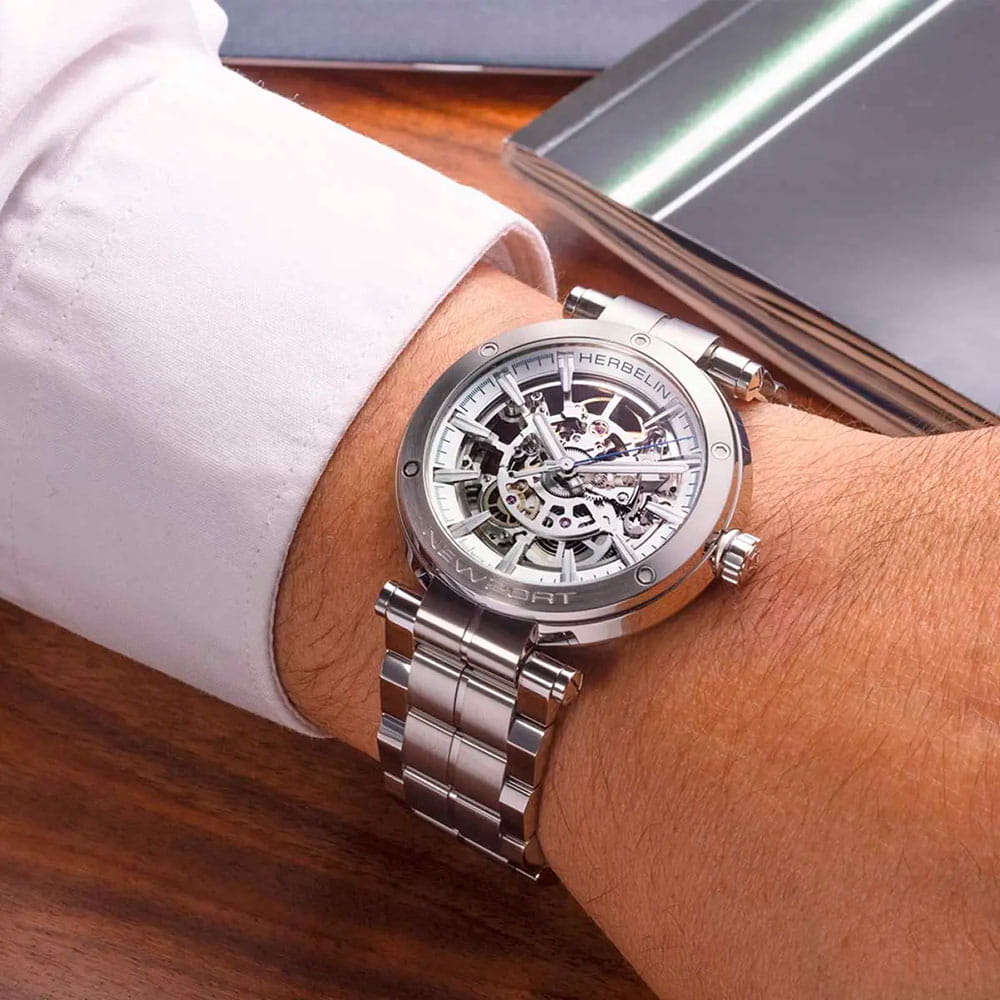 Мужские механические часы с автоподзаводом Herbelin Newport 1868BSQ12 – отражающий идеальное сочетание современного дизайна, надёжности и функциональности. Элегантный облик станет превосходным завершением образа, наделив его индивидуальным характером. Корпус из нержавеющей стали серебристого цвета, диаметром 42 мм, идеально сбалансирован и элегантен. Сапфировое стеклоСапфировое стеклоПрочный и надёжный материал из кристалла сапфира синтетического происхождения, характеризующийся особой твёрдостью и устойчивостью к царапинам и повреждениям. защищает циферблат от царапин и устойчивое к механическим повреждениям. БезельБезельВнешний ободок, закрепляющий стекло. В спортивных часах так называется поворотное кольцо с делениями на циферблате, выполняет роль таймера – замеряет отрезки времени на шкале. Неподвижный безель – элемент декора. Однонаправленно вращающийся безель на дайверских часах позволяет фиксировать моменты погружения и выныривания на поверхность. украшен винтами. Стрелки и метки с люминесцентным покрытиемЛюминесцентное покрытиеПозволяет считывать показания времени в темноте. Производители наносят на стрелки, часовые индексы, безель или поверхность циферблата светонакопительный состав, дающий холодное свечение.. Стальной браслет на застёжке-бабочке с кнопкамиЗастёжка "бабочка"Такой вид застёжки дополняется предохранителями, помогающими избежать случайного раскрытия браслета. Обладают изящным исполнением. обеспечивает комфортное ношение. Прозрачная задняя крышка. Водозащита 100 метров позволит плавать, нырять и заниматься другими водными видами спорта. Эта модель – отличный выбор для тех, кто ищет сочетание стиля, качества и функциональности. Часы станут не только полезным аксессуаром, но и выразительным элементом вашего имиджа.
