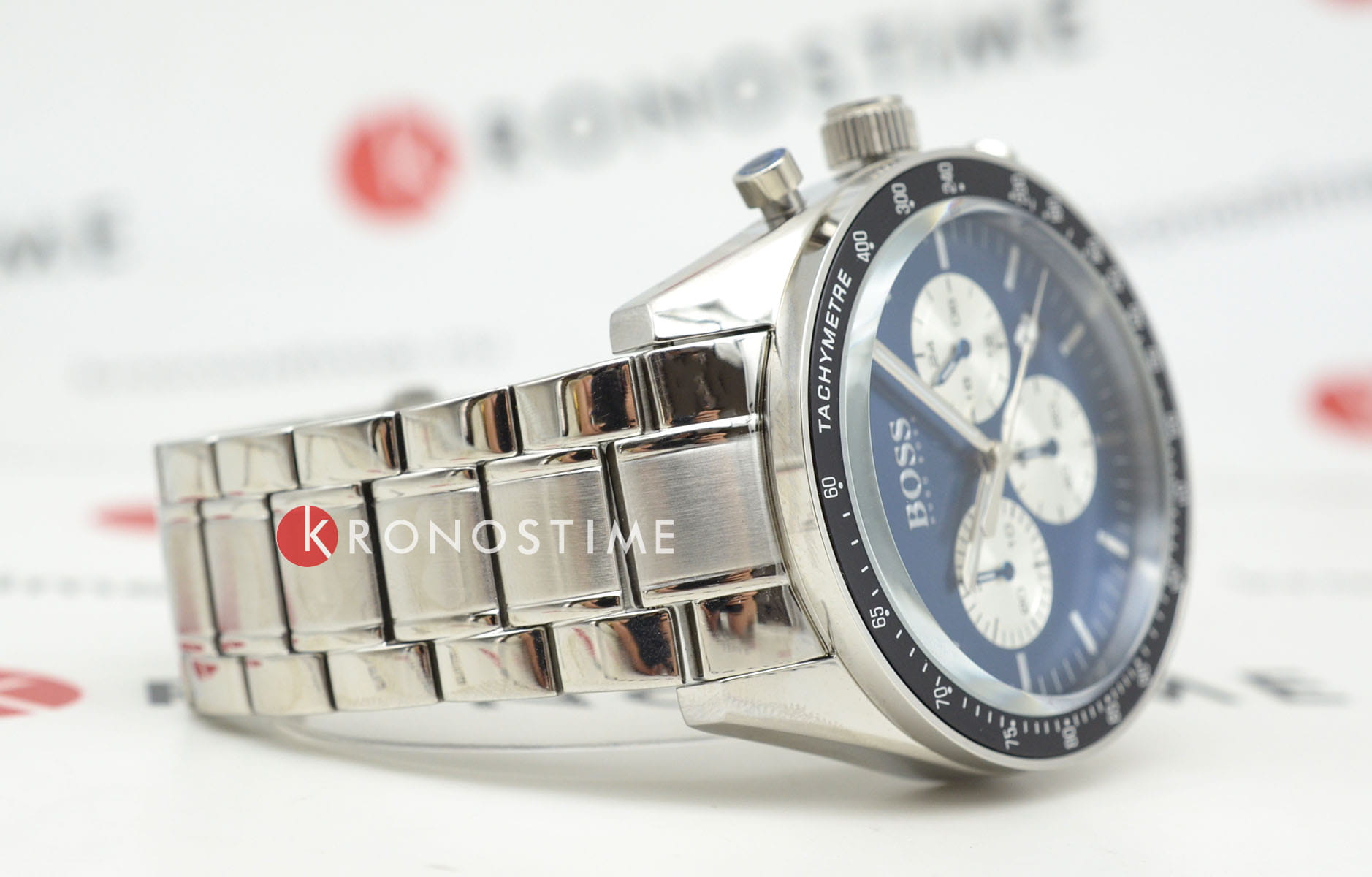Мужские кварцевые часы Hugo Boss Trophy HB1513630 представляют собой стильную модель с корпусом диаметром 44 мм из нержавеющей стали с неподвижным безелемБезельВнешний ободок, закрепляющий стекло. В спортивных часах так называется поворотное кольцо с делениями на циферблате, выполняет роль таймера – замеряет отрезки времени на шкале. Неподвижный безель – элемент декора. Однонаправленно вращающийся безель на дайверских часах позволяет фиксировать моменты погружения и выныривания на поверхность. с IP-покрытиемIP-покрытиеМетод ионного напыления. Демонстрирует повышенную устойчивость к истиранию, окислению и химическим веществам. Под воздействием высокого давления и температуры около 1500°C молекулы металла надёжно соединяются с частицами корпуса часов., дополненным синим изысканным циферблатом. Модель оснащена высокоточным кварцевым механизмом с функцией хронографаХронографФункция позволяет измерять отрезки времени с особой точностью: часы, минуты, секунды. Верным признаком хронографа является наличие на циферблате 3 дополнительных окошек-счётчиков., включая 60-минутный счетчик, а также индикацию даты. Циферблат защищен устойчивым к царапинам минеральным стекломМинеральное стеклоМинеральное стекло представляет собой искусственно выращенный минерал кварца. Такое стекло отличается особой устойчивостью к повреждениям и царапинам. Уступает по некоторым качествам сапфировому стеклу., а водонепроницаемость 5 ATM (50 метров) обеспечивает защиту от брызг и дождя. Стальной браслет с раскладной застежкойРаскладная застёжкаТакой тип застёжки используется только на браслетах из металла. Она никогда не раскрывается полностью, происходит разделение на 2 и более частей. Раскладывающая застёжка снизит вероятность потери часов к минимуму. обеспечивает надежную посадку на запястье, а тахиметрическая шкалаТахиметрРазмеченная шкала, располагается на ободке или безеле часов. Тахиметр позволяет рассчитать скорость на определённом участке пути, расстояние измеряется в километрах или милях. позволяет производить расчеты скорости. Люминесцентное покрытиеЛюминесцентное покрытиеПозволяет считывать показания времени в темноте. Производители наносят на стрелки, часовые индексы, безель или поверхность циферблата светонакопительный состав, дающий холодное свечение. обеспечивает отличную видимость в темноте.Точность хода составляет ±15 секунд в месяц, что соответствует стандартам кварцевых механизмов. Дизайн модели сочетает спортивную функциональность с элегантным стилем, характерным для коллекции Trophy.