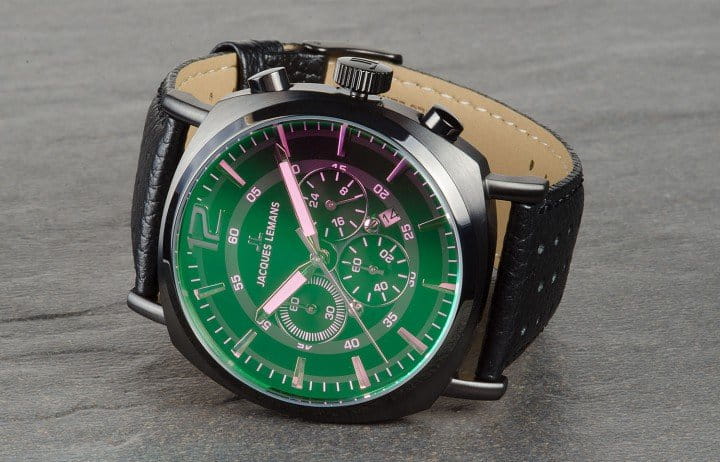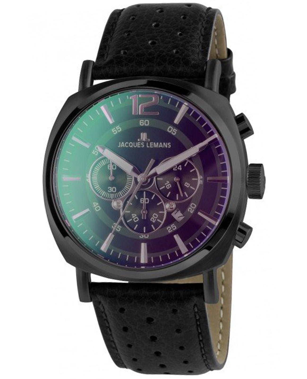 Мужские наручные часы c хронографомХронографФункция позволяет измерять отрезки времени с особой точностью: часы, минуты, секунды. Верным признаком хронографа является наличие на циферблате 3 дополнительных окошек-счётчиков. Jacques Lemans Sport 1-1645N, кварцевый механизм с высокой точностью. Класс водозащиты: 100 метров, позволит плавать, нырять и заниматься другими водными видами спорта. Корпус часов изготовлен из стали с PVD-покрытиемPVDУльтратонкое покрытие наносится в технике вакуумного напыления, сочетает в себе нитрид титана особой прочности со слоем золота или оксида хрома. Несёт в себе декоративную или защитную функцию.. На широком черном циферблате с полировкой в виде солнечных лучей размещены индикатор 24-х часов, минутный и секундный накопители, окошко даты. Хорошо читаемые стрелки часов и минут с люминесцентным покрытиемЛюминесцентное покрытиеПозволяет считывать показания времени в темноте. Производители наносят на стрелки, часовые индексы, безель или поверхность циферблата светонакопительный состав, дающий холодное свечение., что позволяет легко определить время даже в темноте. В модели установлено ударопрочное минеральное стеклоМинеральное стеклоМинеральное стекло представляет собой искусственно выращенный минерал кварца. Такое стекло отличается особой устойчивостью к повреждениям и царапинам. Уступает по некоторым качествам сапфировому стеклу.-хамелеон Crystex. Завинчивающаяся задняя крышка помогает обеспечить повышенную водостойкость 10 атмосфер. Ремешок черного цвета из натуральной кожи с перфорацией подчеркивает спортивный характер модели, а прошивка продлевает срок его службы.