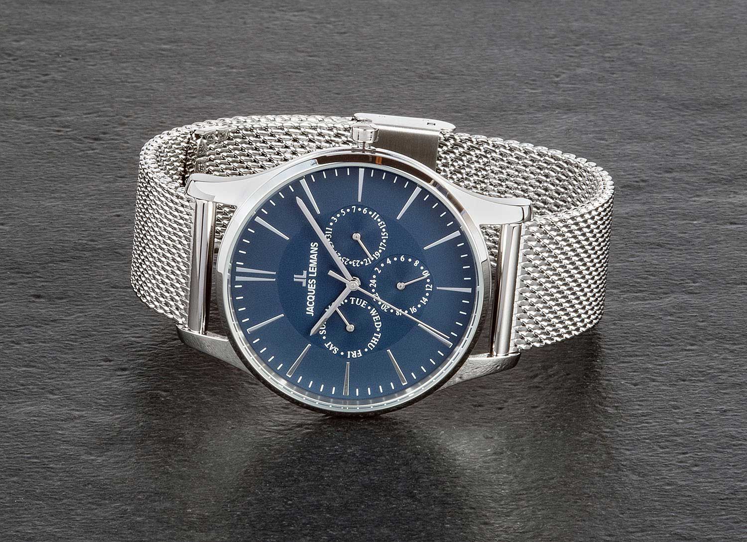 Наручные часы Jacques Lemans призваны ставить на первое место индивидуальный стиль владельца, классическая элегантность придётся по вкусу каждому. Брендовые часы привлекают минималистичным дизайном, отсутствие вычурности и обилия декорирующих элементов делают модель лучшим решением для ежедневного применения. Аксессуар можно носить с деловыми костюмами и повседневной одеждой, он органично сочетается как с классическими брюками, так и с рваными джинсами. Это настоящее часовое искусство высокого качества, часы считаются актуальным вариантом на все времена и с идеальной точностью показывают время благодаря надёжному японскому механизму.