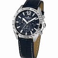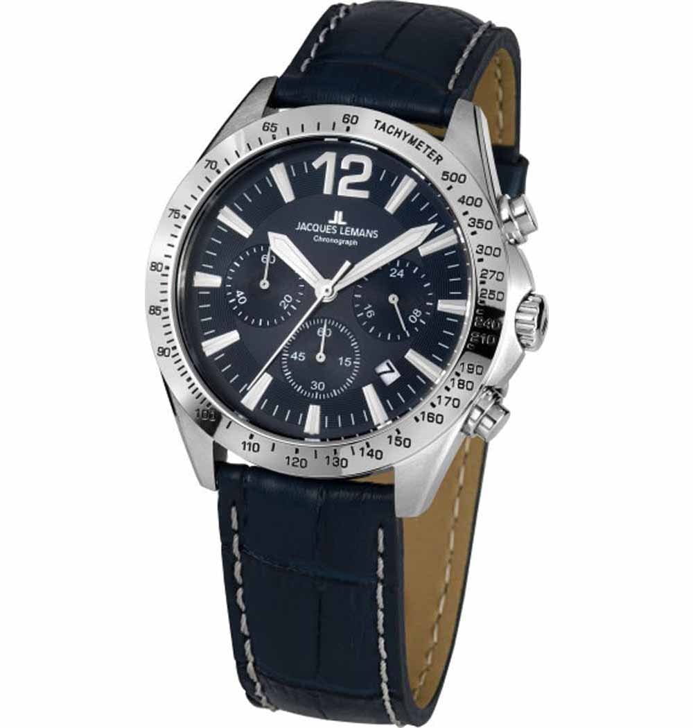 Юбилейная коллекция от Jacques Lemans - спортивный хронограф. Часы выполнены в спортивном  стиле не смотря на это, подойдут к любому повседневному гардеробу. Кварцевый механизм заключен в круглый корпус из высокопрочной стали. Синий циферблат, стальные стрелки. Часы удерживаются на руке ремешком из натуральной кожи. Водонепроницаемость часов до 100 метров.