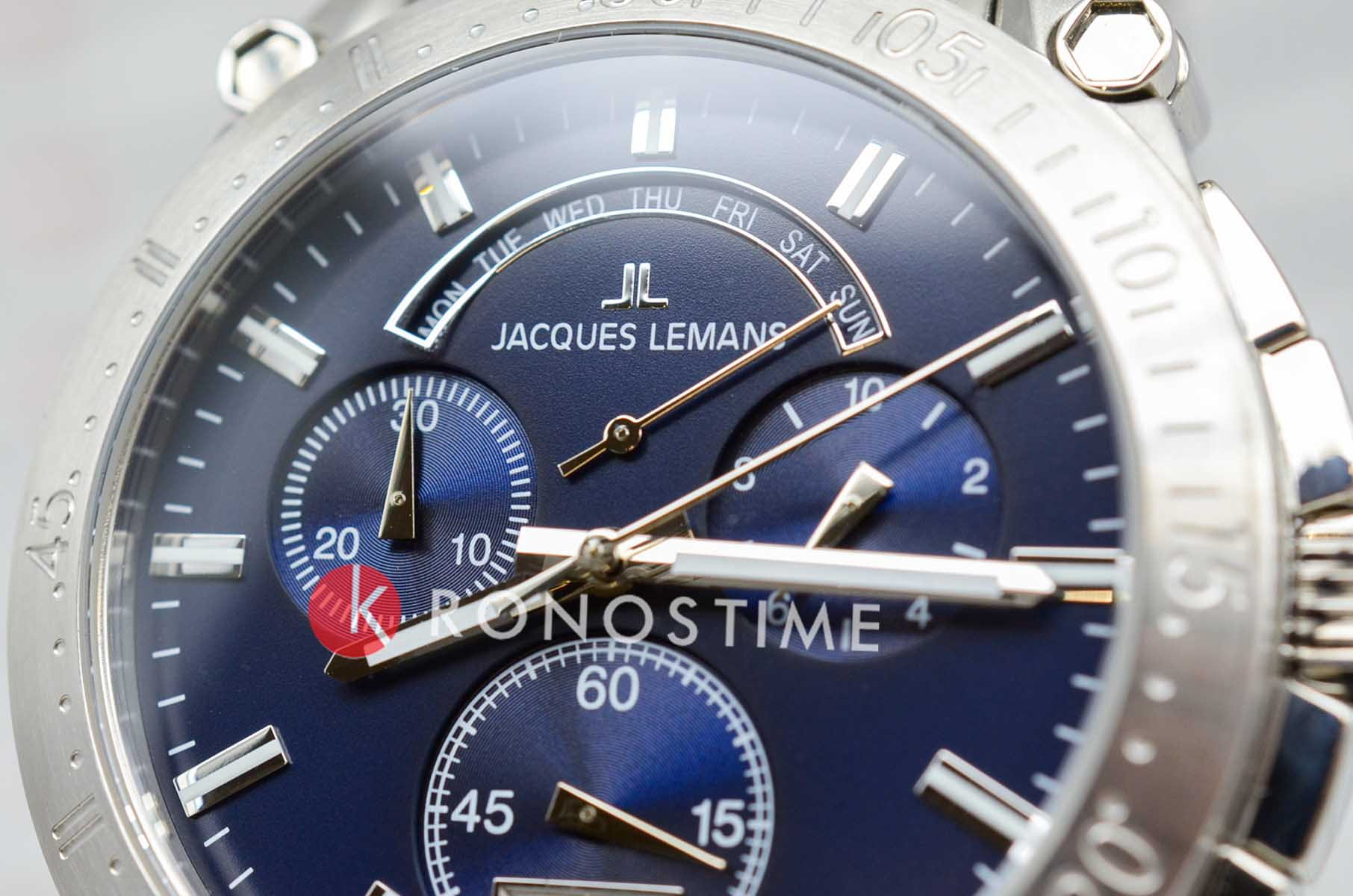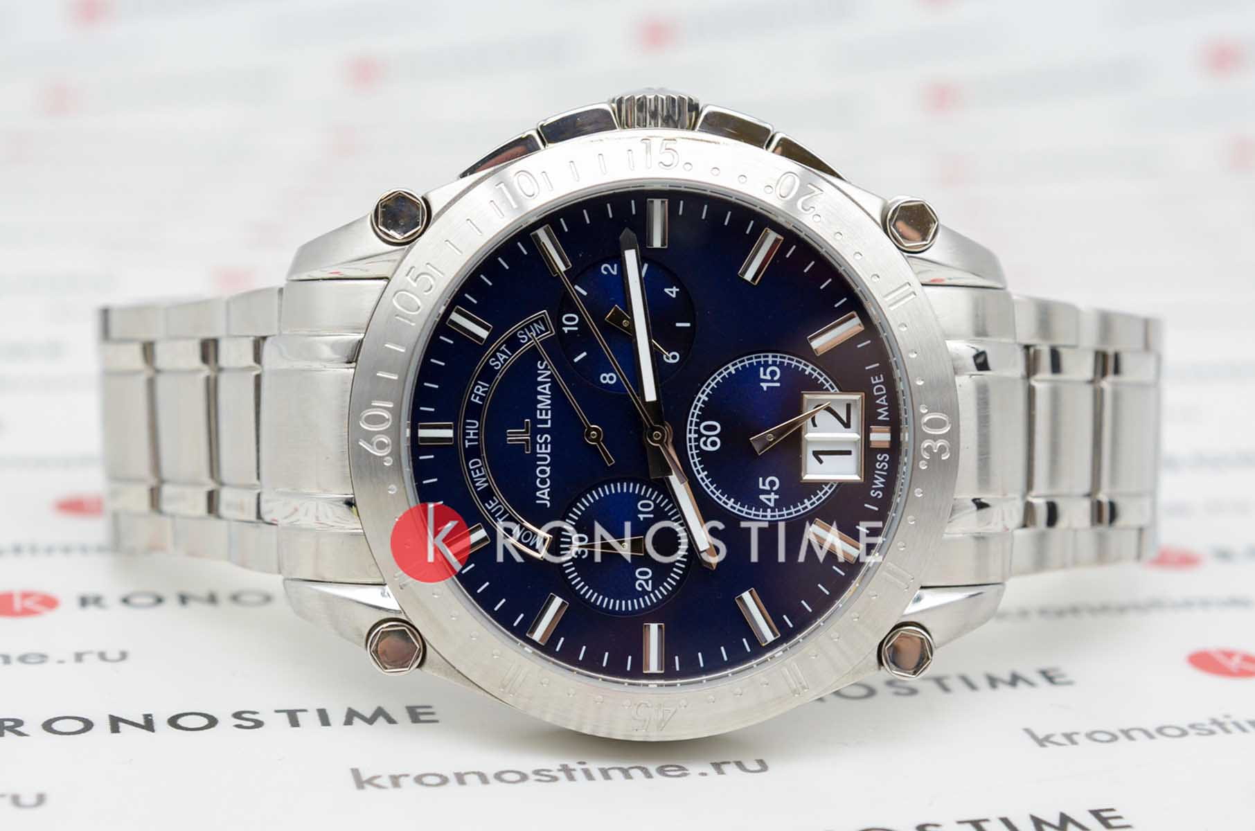Мужские часы-хронографХронографФункция позволяет измерять отрезки времени с особой точностью: часы, минуты, секунды. Верным признаком хронографа является наличие на циферблате 3 дополнительных окошек-счётчиков. Jacques Lemans 1-2198E – лаконичная красота и изысканная элегантность. Оригинальная модель с классическим оформлением станет превосходным завершением образа, наделив его индивидуальным характером. Корпус выполнен из нержавеющей стали, диаметром 44 мм, что обеспечивает долговечность и утончённый внешний вид. Ударопрочное минеральное стеклоМинеральное стеклоМинеральное стекло представляет собой искусственно выращенный минерал кварца. Такое стекло отличается особой устойчивостью к повреждениям и царапинам. Уступает по некоторым качествам сапфировому стеклу. с сапфировым напылением защищает циферблат от царапин. Стальной браслет на раскладной застёжкеРаскладная застёжкаТакой тип застёжки используется только на браслетах из металла. Она никогда не раскрывается полностью, происходит разделение на 2 и более частей. Раскладывающая застёжка снизит вероятность потери часов к минимуму. обеспечивает комфортное ношение. Водозащита 100 метров позволит плавать, нырять и заниматься другими водными видами спорта. Стрелки и метки с люминесцентным покрытиемЛюминесцентное покрытиеПозволяет считывать показания времени в темноте. Производители наносят на стрелки, часовые индексы, безель или поверхность циферблата светонакопительный состав, дающий холодное свечение. позволяющие легко определять время даже в темноте. Окошко даты находится в положении 6 часов. Широкое окошко дня недели в положении 12 часов позволяет показывать название дня недели. Это аксессуар для мужчины, который ценит классический стиль и функциональность.