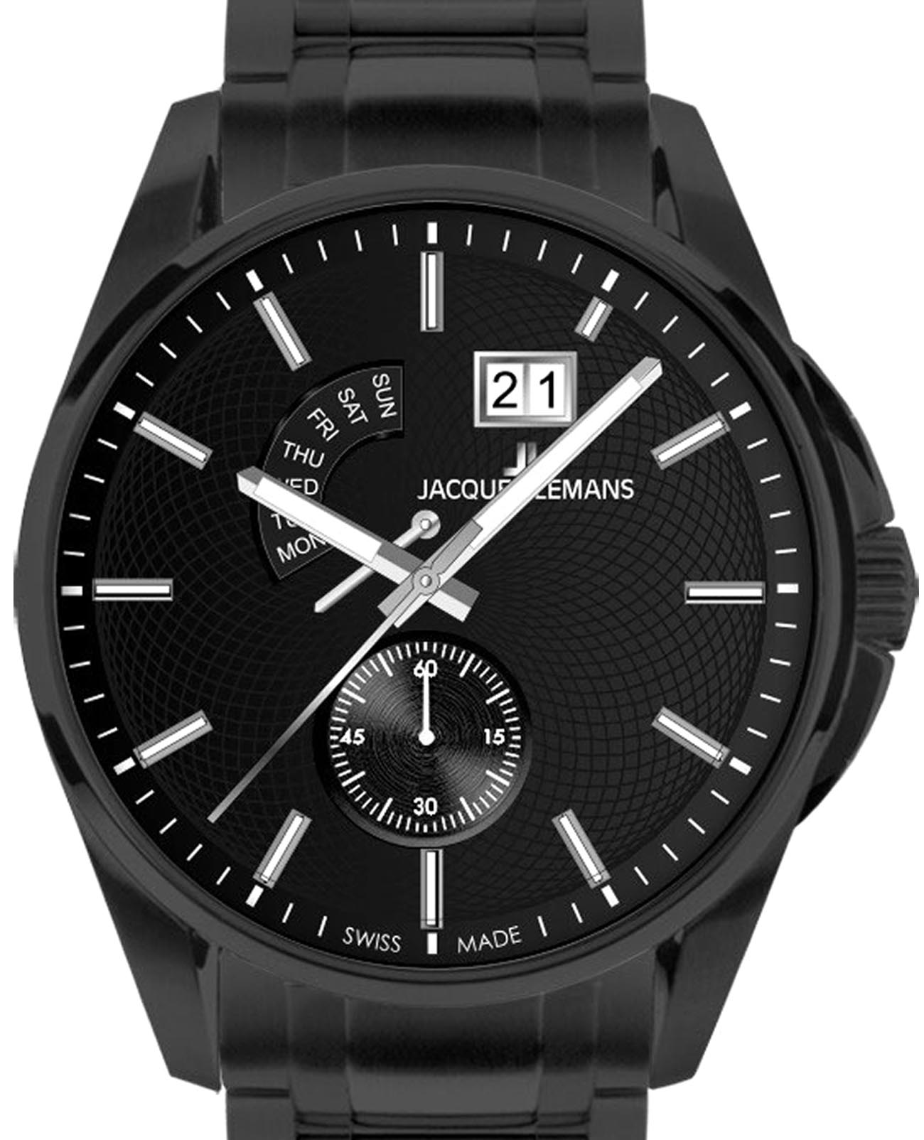 Мужские часы Jacques Lemans 1-2199S – лаконичная красота и изысканная элегантность. Оригинальная модель с классическим оформлением станет превосходным завершением образа, наделив его индивидуальным характером. Корпус выполнен из нержавеющей стали с PVD-покрытиемPVDУльтратонкое покрытие наносится в технике вакуумного напыления, сочетает в себе нитрид титана особой прочности со слоем золота или оксида хрома. Несёт в себе декоративную или защитную функцию. черного цвета, диаметром 44 мм, что обеспечивает долговечность и утончённый внешний вид. Минеральное стеклоМинеральное стеклоМинеральное стекло представляет собой искусственно выращенный минерал кварца. Такое стекло отличается особой устойчивостью к повреждениям и царапинам. Уступает по некоторым качествам сапфировому стеклу. с сапфировым напылением защищает циферблат от царапин. Окошко даты находится в положении 1 час. Широкое окошко дня недели в положении 11-12 часов позволяет показывать название дня недели. Стальной браслет с PVD-покрытиемPVDУльтратонкое покрытие наносится в технике вакуумного напыления, сочетает в себе нитрид титана особой прочности со слоем золота или оксида хрома. Несёт в себе декоративную или защитную функцию. на раскладной застёжкеРаскладная застёжкаТакой тип застёжки используется только на браслетах из металла. Она никогда не раскрывается полностью, происходит разделение на 2 и более частей. Раскладывающая застёжка снизит вероятность потери часов к минимуму. обеспечивает комфортное ношение. Водозащита 100 метров позволит плавать, нырять и заниматься другими водными видами спорта. Стрелки и метки с люминесцентным покрытиемЛюминесцентное покрытиеПозволяет считывать показания времени в темноте. Производители наносят на стрелки, часовые индексы, безель или поверхность циферблата светонакопительный состав, дающий холодное свечение. позволяющие легко определять время даже в темноте. Это аксессуар для мужчины, который ценит классический стиль и функциональность.