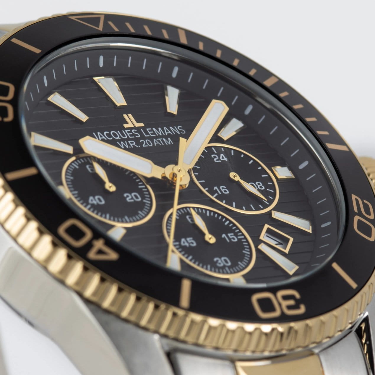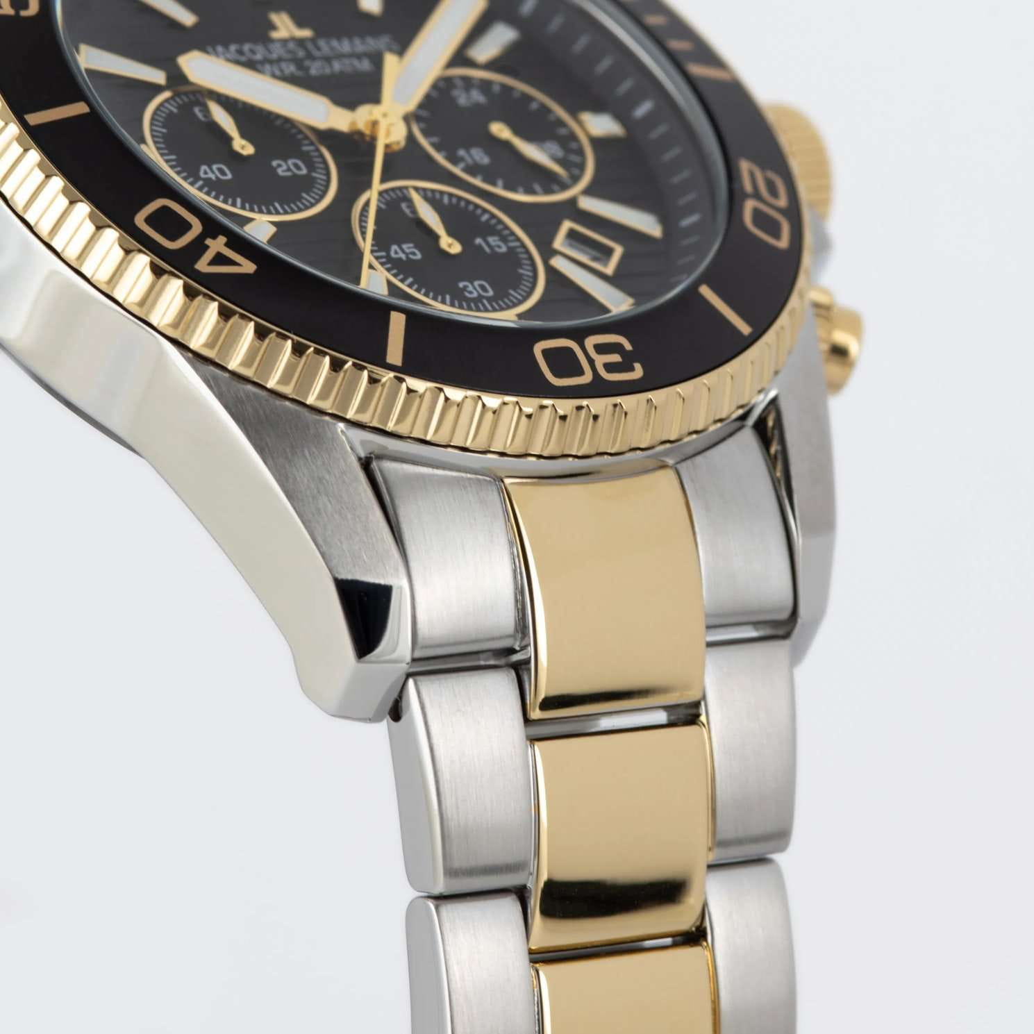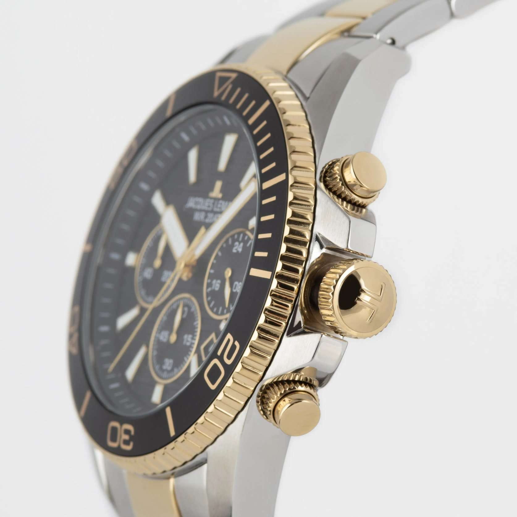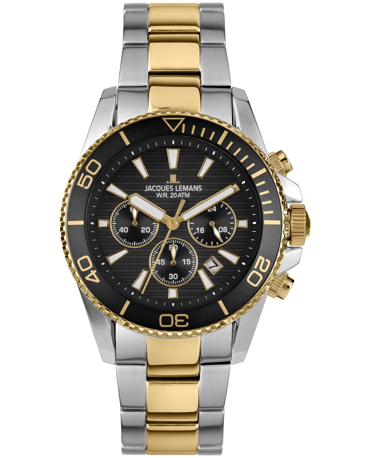 Мужские кварцевые часы-хронографХронографФункция позволяет измерять отрезки времени с особой точностью: часы, минуты, секунды. Верным признаком хронографа является наличие на циферблате 3 дополнительных окошек-счётчиков. с секундомеромСекундомерСекундоме́р — прибор, способный измерять интервалы времени с точностью до долей секунды. Jacques Lemans 1-2206L– лаконичная красота и изысканная элегантность. Оригинальная модель с классическим оформлением станет превосходным завершением образа, наделив его индивидуальным характером. Корпус выполнен из нержавеющей стали серебристого цвета, диаметром 44 мм, что обеспечивает долговечность и утончённый внешний вид. Минеральное стеклоМинеральное стеклоМинеральное стекло представляет собой искусственно выращенный минерал кварца. Такое стекло отличается особой устойчивостью к повреждениям и царапинам. Уступает по некоторым качествам сапфировому стеклу. повышенной прочности Crystex защищает циферблат от царапин. Поворотный безельБезельВнешний ободок, закрепляющий стекло. В спортивных часах так называется поворотное кольцо с делениями на циферблате, выполняет роль таймера – замеряет отрезки времени на шкале. Неподвижный безель – элемент декора. Однонаправленно вращающийся безель на дайверских часах позволяет фиксировать моменты погружения и выныривания на поверхность. с PVD-покрытиемPVDУльтратонкое покрытие наносится в технике вакуумного напыления, сочетает в себе нитрид титана особой прочности со слоем золота или оксида хрома. Несёт в себе декоративную или защитную функцию.. Стальной браслет с частичным PVD-покрытиемPVDУльтратонкое покрытие наносится в технике вакуумного напыления, сочетает в себе нитрид титана особой прочности со слоем золота или оксида хрома. Несёт в себе декоративную или защитную функцию. на раскладной застёжке с фиксаторомРаскладная застёжкаТакой тип застёжки используется только на браслетах из металла. Она никогда не раскрывается полностью, происходит разделение на 2 и более частей. Раскладывающая застёжка снизит вероятность потери часов к минимуму. обеспечивает комфортное ношение Водозащита 200 метров позволит плавать, нырять и заниматься другими водными видами спорта. Стрелки и метки с люминесцентным покрытиемЛюминесцентное покрытиеПозволяет считывать показания времени в темноте. Производители наносят на стрелки, часовые индексы, безель или поверхность циферблата светонакопительный состав, дающий холодное свечение. позволяющие легко определять время даже в темноте. 12-ти и 24-х часовой формат времени. Окошко даты находится в положении между 4 и 5 часами. Рифленая заводная головка с защитой. Это аксессуар для мужчины, который ценит классический стиль и функциональность.