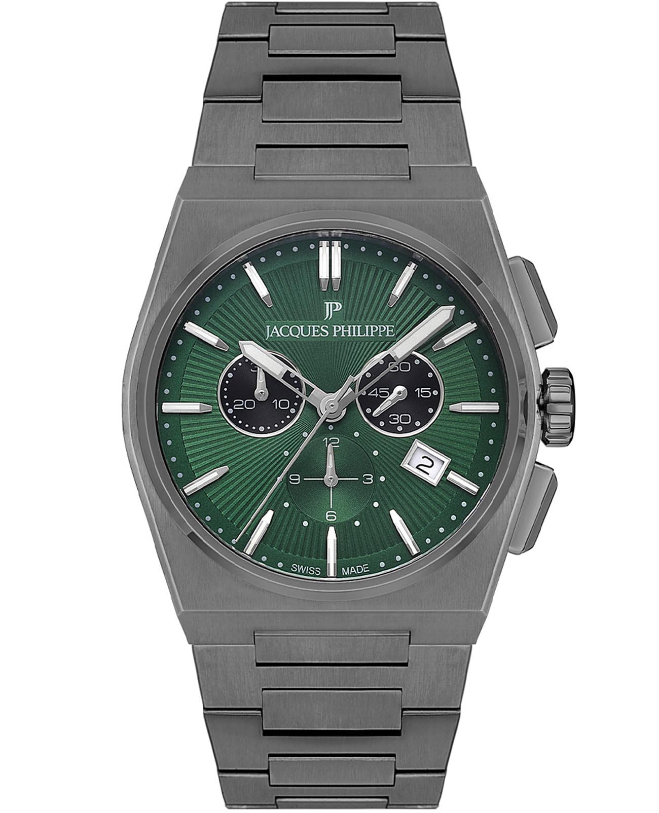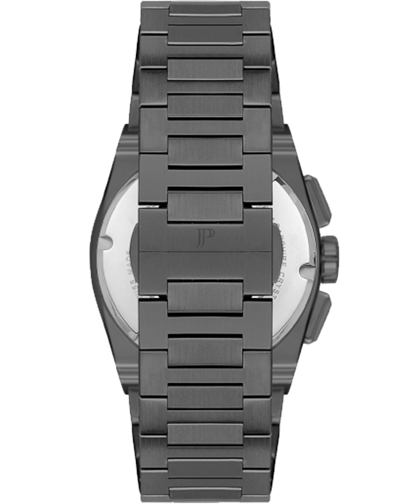 Швейцарские мужские часы-хронографХронографФункция позволяет измерять отрезки времени с особой точностью: часы, минуты, секунды. Верным признаком хронографа является наличие на циферблате 3 дополнительных окошек-счётчиков. с секундомеромСекундомерСекундоме́р — прибор, способный измерять интервалы времени с точностью до долей секунды. Jacques Philippe Aurora JPQGC4183X7, кварцевый механизм с высокой точностью. Сапфировое стеклоСапфировое стеклоПрочный и надёжный материал из кристалла сапфира синтетического происхождения, характеризующийся особой твёрдостью и устойчивостью к царапинам и повреждениям. устойчивое к появлению царапин, обладающее высокой прозрачностью. Корпус часов изготовлен из нержавеющей стали с IP-покрытиемIP-покрытиеМетод ионного напыления. Демонстрирует повышенную устойчивость к истиранию, окислению и химическим веществам. Под воздействием высокого давления и температуры около 1500°C молекулы металла надёжно соединяются с частицами корпуса часов.. На циферблате три дополнительных индикатора. Окошко даты находится в положении 4 часа. Стрелки с люминесцентным покрытиемЛюминесцентное покрытиеПозволяет считывать показания времени в темноте. Производители наносят на стрелки, часовые индексы, безель или поверхность циферблата светонакопительный состав, дающий холодное свечение.. Класс водозащиты: 50 метров, позволит защитить корпус от случайных брызг или капель дождя. Стальной браслет с IP-покрытиемIP-покрытиеМетод ионного напыления. Демонстрирует повышенную устойчивость к истиранию, окислению и химическим веществам. Под воздействием высокого давления и температуры около 1500°C молекулы металла надёжно соединяются с частицами корпуса часов. на застёжке «бабочка» с кнопкамиЗастёжка "бабочка"Такой вид застёжки дополняется предохранителями, помогающими избежать случайного раскрытия браслета. Обладают изящным исполнением. .