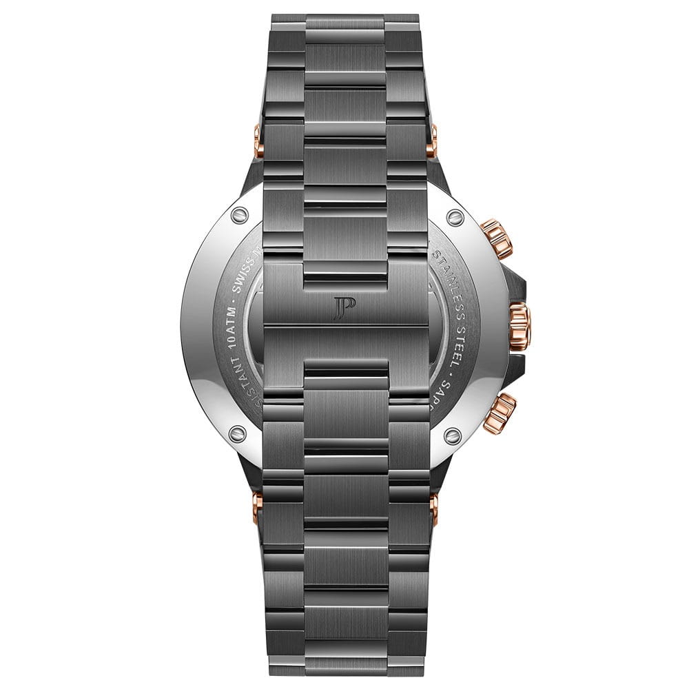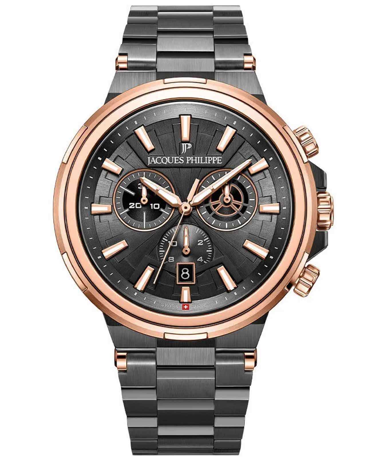 Jacques Philippe Corus JPQGC443347 — стильные швейцарские часы с функцией хронографаХронографФункция позволяет измерять отрезки времени с особой точностью: часы, минуты, секунды. Верным признаком хронографа является наличие на циферблате 3 дополнительных окошек-счётчиков. и секундомераСекундомерСекундоме́р — прибор, способный измерять интервалы времени с точностью до долей секунды., которые сочетают в себе элегантность и современный функционал. Модель оснащена точным кварцевым механизмом и надежным корпусом из нержавеющей стали 316L с черным IP-покрытиемIP-покрытиеМетод ионного напыления. Демонстрирует повышенную устойчивость к истиранию, окислению и химическим веществам. Под воздействием высокого давления и температуры около 1500°C молекулы металла надёжно соединяются с частицами корпуса часов., что гарантирует долговечность и устойчивость к механическим воздействиям. БезельБезельВнешний ободок, закрепляющий стекло. В спортивных часах так называется поворотное кольцо с делениями на циферблате, выполняет роль таймера – замеряет отрезки времени на шкале. Неподвижный безель – элемент декора. Однонаправленно вращающийся безель на дайверских часах позволяет фиксировать моменты погружения и выныривания на поверхность. с розово-золотистым IP-покрытиемIP-покрытиеМетод ионного напыления. Демонстрирует повышенную устойчивость к истиранию, окислению и химическим веществам. Под воздействием высокого давления и температуры около 1500°C молекулы металла надёжно соединяются с частицами корпуса часов., придающим изделию дополнительную прочность и стильный внешний вид. Сапфировое стеклоСапфировое стеклоПрочный и надёжный материал из кристалла сапфира синтетического происхождения, характеризующийся особой твёрдостью и устойчивостью к царапинам и повреждениям. отличается высокой прозрачностью и устойчивостью к царапинам, сохраняя безупречный внешний вид часов даже при активном использовании. Черный циферблат украшен тремя дополнительными индикаторами и удобным окошком даты в положении «4 часа», а стрелки с люминесцентным покрытиемЛюминесцентное покрытиеПозволяет считывать показания времени в темноте. Производители наносят на стрелки, часовые индексы, безель или поверхность циферблата светонакопительный состав, дающий холодное свечение. обеспечивают отличную читаемость в любое время суток. Браслет из нержавеющей стали 316 с черным IP-покрытиемIP-покрытиеМетод ионного напыления. Демонстрирует повышенную устойчивость к истиранию, окислению и химическим веществам. Под воздействием высокого давления и температуры около 1500°C молекулы металла надёжно соединяются с частицами корпуса часов. оснащен удобной застежкой «бабочка»Застёжка "бабочка"Такой вид застёжки дополняется предохранителями, помогающими избежать случайного раскрытия браслета. Обладают изящным исполнением. , что обеспечивает комфорт и надежность при носке. Класс водозащиты 10 ATM (100 метров) позволяет не снимать часы во время мытья рук или прогулок под дождем.