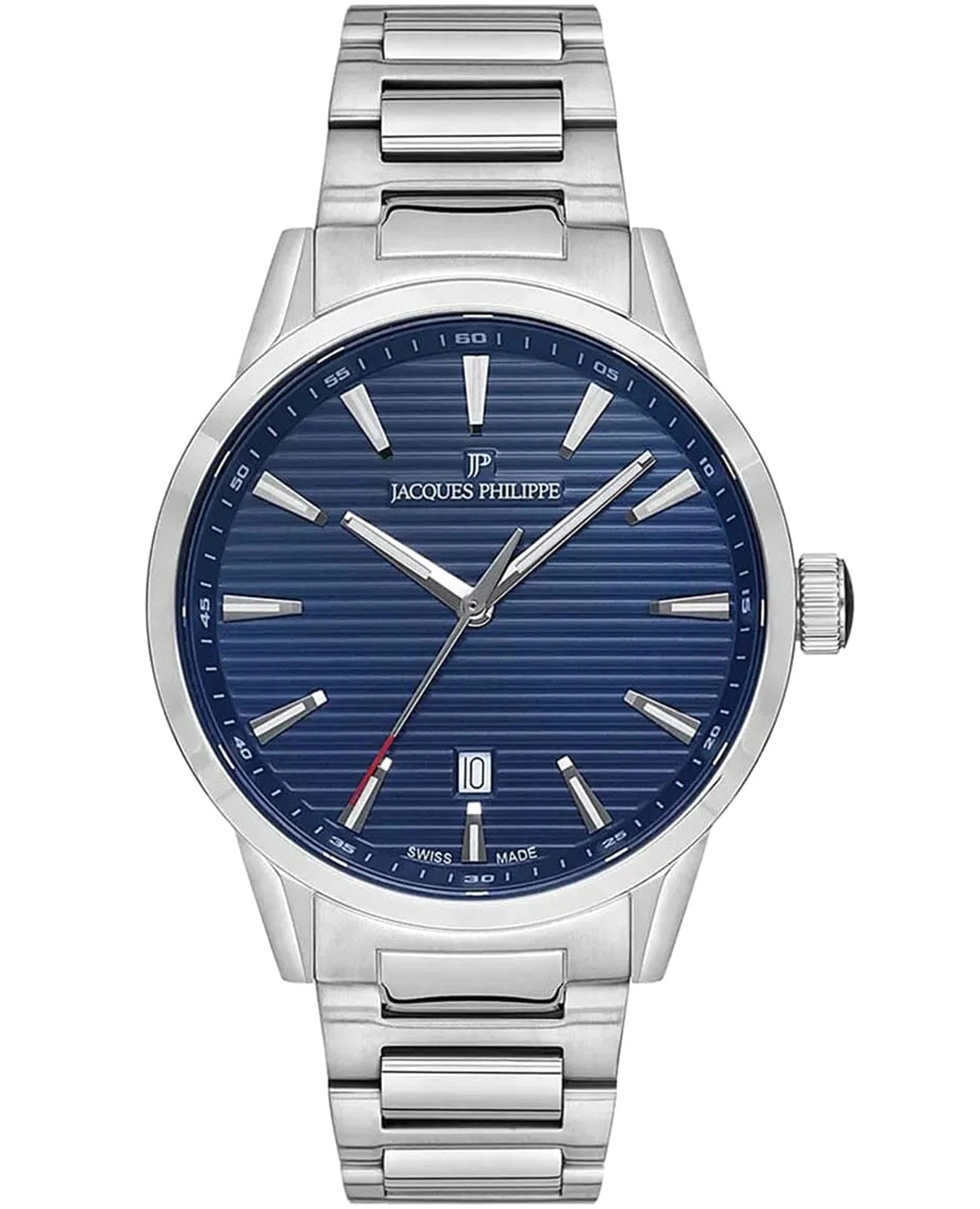 Швейцарские мужские часы Jacques Philippe Aspect JPQGS091336N кварцевый механизм с высокой точностью. Прочное сапфировое стеклоСапфировое стеклоПрочный и надёжный материал из кристалла сапфира синтетического происхождения, характеризующийся особой твёрдостью и устойчивостью к царапинам и повреждениям. устойчивое к появлению царапин, обладающее высокой прозрачностью. Циферблат синего цвета украшен классическими стрелками и метками с люминесцентным покрытиемЛюминесцентное покрытиеПозволяет считывать показания времени в темноте. Производители наносят на стрелки, часовые индексы, безель или поверхность циферблата светонакопительный состав, дающий холодное свечение., гармонично дополняющим общий дизайн модели. Элегантный корпус изготовлен из нержавеющей стали, диаметром 41 мм, что делает их устойчивыми к внешним воздействиям и придает благородный вид. Стальной браслет на раскладной застёжке с фиксаторомРаскладная застёжкаТакой тип застёжки используется только на браслетах из металла. Она никогда не раскрывается полностью, происходит разделение на 2 и более частей. Раскладывающая застёжка снизит вероятность потери часов к минимуму. обеспечивает комфортное и безопасное ношение. Окошко даты находится в положении 6 часов. Класс водозащиты: 50 метров позволит защитить корпус от случайных брызг или капель дождя. Эти часы станут идеальным выбором для мужчин, ценящих стиль, качество и функциональность.