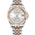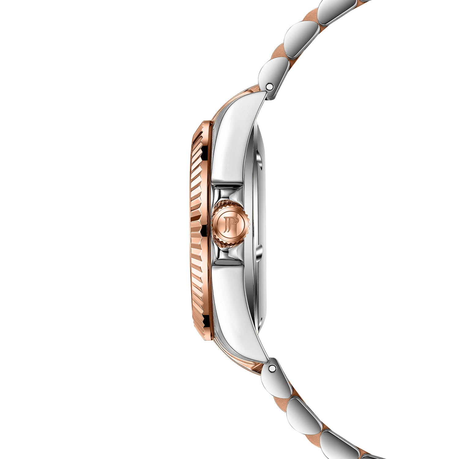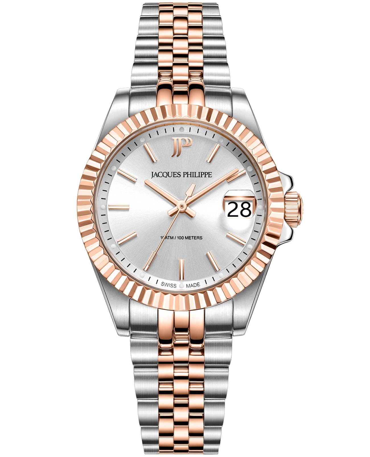 Швейцарские женские часы Jacques Philippe Adastra JPQLS587328RG кварцевый механизм с высокой точностью. Прочное сапфировое стеклоСапфировое стеклоПрочный и надёжный материал из кристалла сапфира синтетического происхождения, характеризующийся особой твёрдостью и устойчивостью к царапинам и повреждениям. устойчивое к царапинам и механическим повреждениям. Циферблат серебристого цвета украшен классическими стрелками и метками гармонично дополняющие общий дизайн модели. Элегантный корпус изготовлен из нержавеющей стали, диаметром 32 мм, что делает их устойчивыми к внешним воздействиям и придает благородный вид. Стальной браслет с частичным IP-покрытиемIP-покрытиеМетод ионного напыления. Демонстрирует повышенную устойчивость к истиранию, окислению и химическим веществам. Под воздействием высокого давления и температуры около 1500°C молекулы металла надёжно соединяются с частицами корпуса часов. на застёжке-бабочке с кнопкамиЗастёжка "бабочка"Такой вид застёжки дополняется предохранителями, помогающими избежать случайного раскрытия браслета. Обладают изящным исполнением. обеспечивает комфортное и безопасное ношение. Неподвижный рифленый безельБезельВнешний ободок, закрепляющий стекло. В спортивных часах так называется поворотное кольцо с делениями на циферблате, выполняет роль таймера – замеряет отрезки времени на шкале. Неподвижный безель – элемент декора. Однонаправленно вращающийся безель на дайверских часах позволяет фиксировать моменты погружения и выныривания на поверхность. с IP-покрытиемIP-покрытиеМетод ионного напыления. Демонстрирует повышенную устойчивость к истиранию, окислению и химическим веществам. Под воздействием высокого давления и температуры около 1500°C молекулы металла надёжно соединяются с частицами корпуса часов. цвета розового золота. Окошко даты находится в положении 3 часа. Класс водозащиты: 100 метров позволит плавать, нырять и заниматься другими водными видами спорта. Эти часы станут идеальным выбором для женщин, ценящих стиль, качество и функциональность.