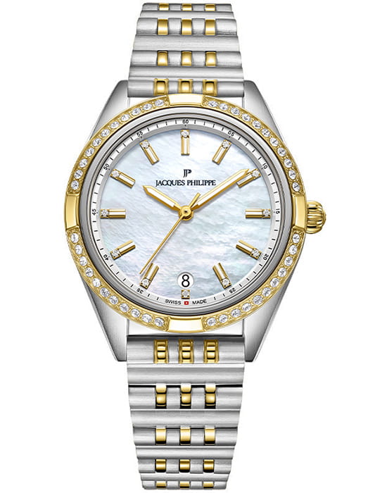 Jacques Philippe Radiante JPQLS687388YG — изящная женская модель коллекции Radiante с кварцевым механизмом, сочетающая классический стиль и практичность. Корпус диаметром 33 мм выполнен из нержавеющей стали и полированными поверхностями, безельБезельВнешний ободок, закрепляющий стекло. В спортивных часах так называется поворотное кольцо с делениями на циферблате, выполняет роль таймера – замеряет отрезки времени на шкале. Неподвижный безель – элемент декора. Однонаправленно вращающийся безель на дайверских часах позволяет фиксировать моменты погружения и выныривания на поверхность. с PVDPVDУльтратонкое покрытие наносится в технике вакуумного напыления, сочетает в себе нитрид титана особой прочности со слоем золота или оксида хрома. Несёт в себе декоративную или защитную функцию. инкрустирован кристаллами, что придаёт часам утончённый блеск. Водозащита до 5 атм (50 м) позволяет носить модель в повседневных условиях. Выпуклое сапфировое стеклоСапфировое стеклоПрочный и надёжный материал из кристалла сапфира синтетического происхождения, характеризующийся особой твёрдостью и устойчивостью к царапинам и повреждениям. обеспечивает защиту от царапин и сохраняет высокую прозрачность, делая циферблат легко читаемым. Модель оснащена точным швейцарским кварцевым механизмом с индикацией часов, минут и секунд. Циферблат оформлен в лаконичном стиле с аккуратными метками, а браслет из нержавеющей стали с частичным PVDPVDУльтратонкое покрытие наносится в технике вакуумного напыления, сочетает в себе нитрид титана особой прочности со слоем золота или оксида хрома. Несёт в себе декоративную или защитную функцию.-покрытием гармонично завершает образ, подчёркивая универсальность и элегантность этих часов.