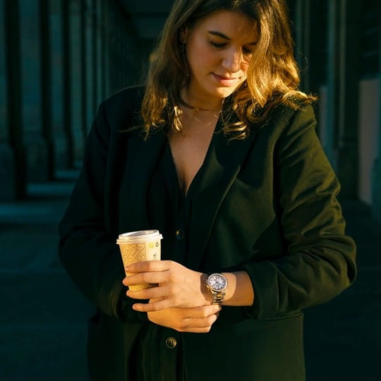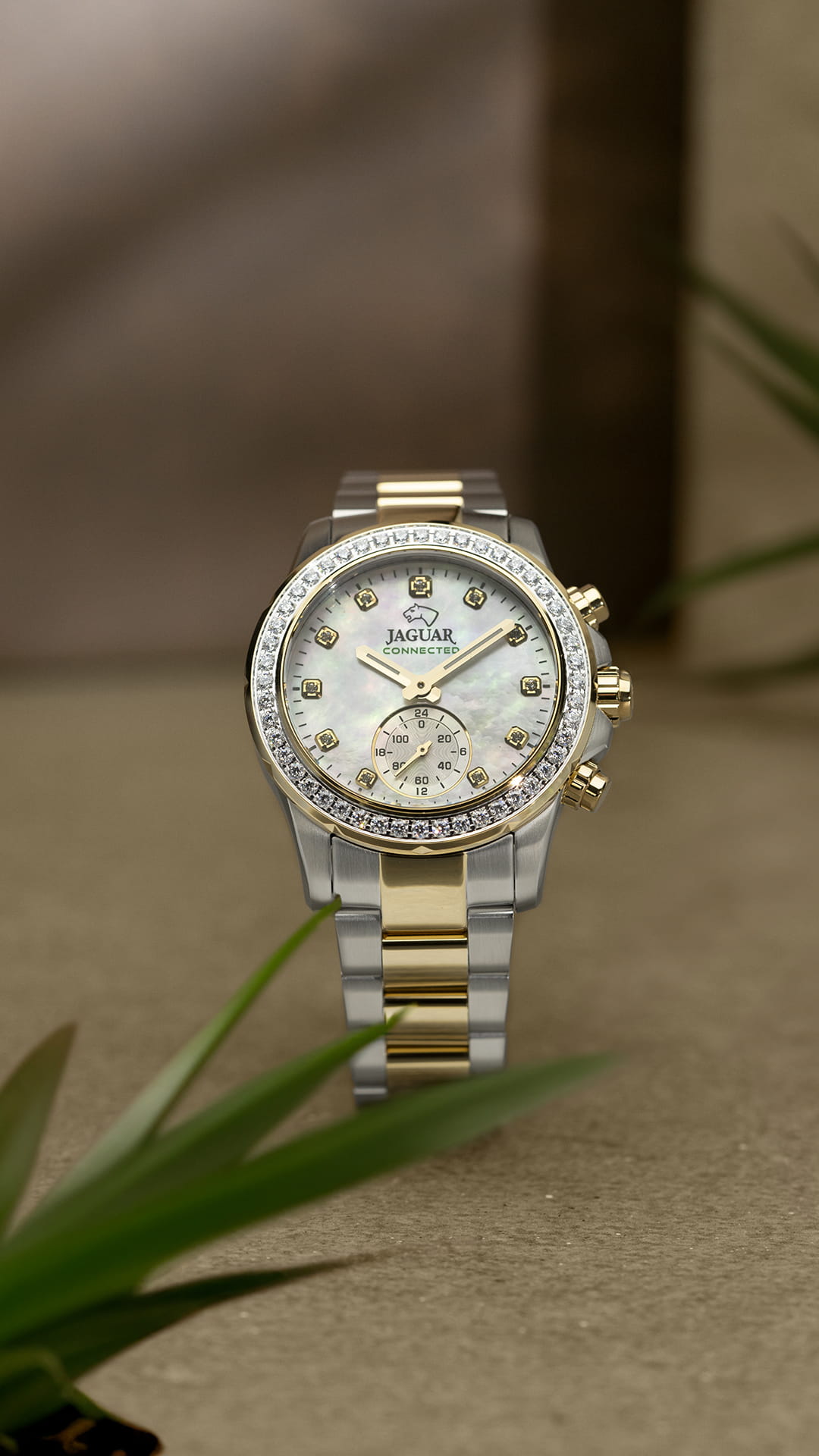 Женские швейцарские часы Jaguar Connected Lady J981/1. Сапфировое стеклоСапфировое стеклоПрочный и надёжный материал из кристалла сапфира синтетического происхождения, характеризующийся особой твёрдостью и устойчивостью к царапинам и повреждениям. устойчивое к мелким механическим повреждениям. Корпус часов изготовлен из нержавеющей стали. Стрелки и метки с люминесцентным покрытиемЛюминесцентное покрытиеПозволяет считывать показания времени в темноте. Производители наносят на стрелки, часовые индексы, безель или поверхность циферблата светонакопительный состав, дающий холодное свечение.. Класс водозащиты: 50 метров, позволит защитить корпус от случайных брызг или капель дождя. БезельБезельВнешний ободок, закрепляющий стекло. В спортивных часах так называется поворотное кольцо с делениями на циферблате, выполняет роль таймера – замеряет отрезки времени на шкале. Неподвижный безель – элемент декора. Однонаправленно вращающийся безель на дайверских часах позволяет фиксировать моменты погружения и выныривания на поверхность. с PVD-покрытиемPVDУльтратонкое покрытие наносится в технике вакуумного напыления, сочетает в себе нитрид титана особой прочности со слоем золота или оксида хрома. Несёт в себе декоративную или защитную функцию. и циферблат инкрустированы цирконием. Стальной браслет с частичным  PVD-покрытиемPVDУльтратонкое покрытие наносится в технике вакуумного напыления, сочетает в себе нитрид титана особой прочности со слоем золота или оксида хрома. Несёт в себе декоративную или защитную функцию. на раскладной застёжкеРаскладная застёжкаТакой тип застёжки используется только на браслетах из металла. Она никогда не раскрывается полностью, происходит разделение на 2 и более частей. Раскладывающая застёжка снизит вероятность потери часов к минимуму.. За точный ход работы часов, из коллекции Connected, отвечает кварцевый гибридный механизм швейцарского производства со Смарт-Модулем. Данный тип механизма обеспечивает возможность подключить часы к телефону через Bluetooth и управлять большим рядом дополнительных функций на выбор с помошью приложения Jaguar. Дополнительные функции: отображение даты и дня недели, секундомер, таймер, GMT, шагомер, поиск телефона, включение/выключение звука телефона при входящих вызовах, переключение музыки, вибро-уведомления.