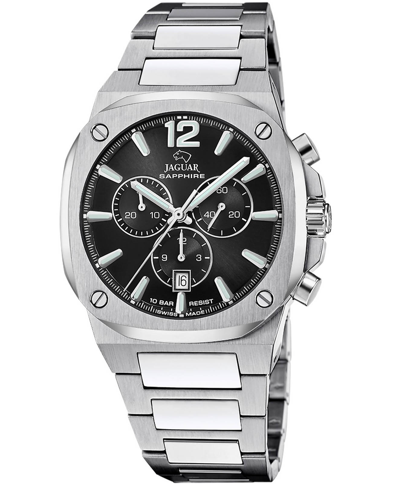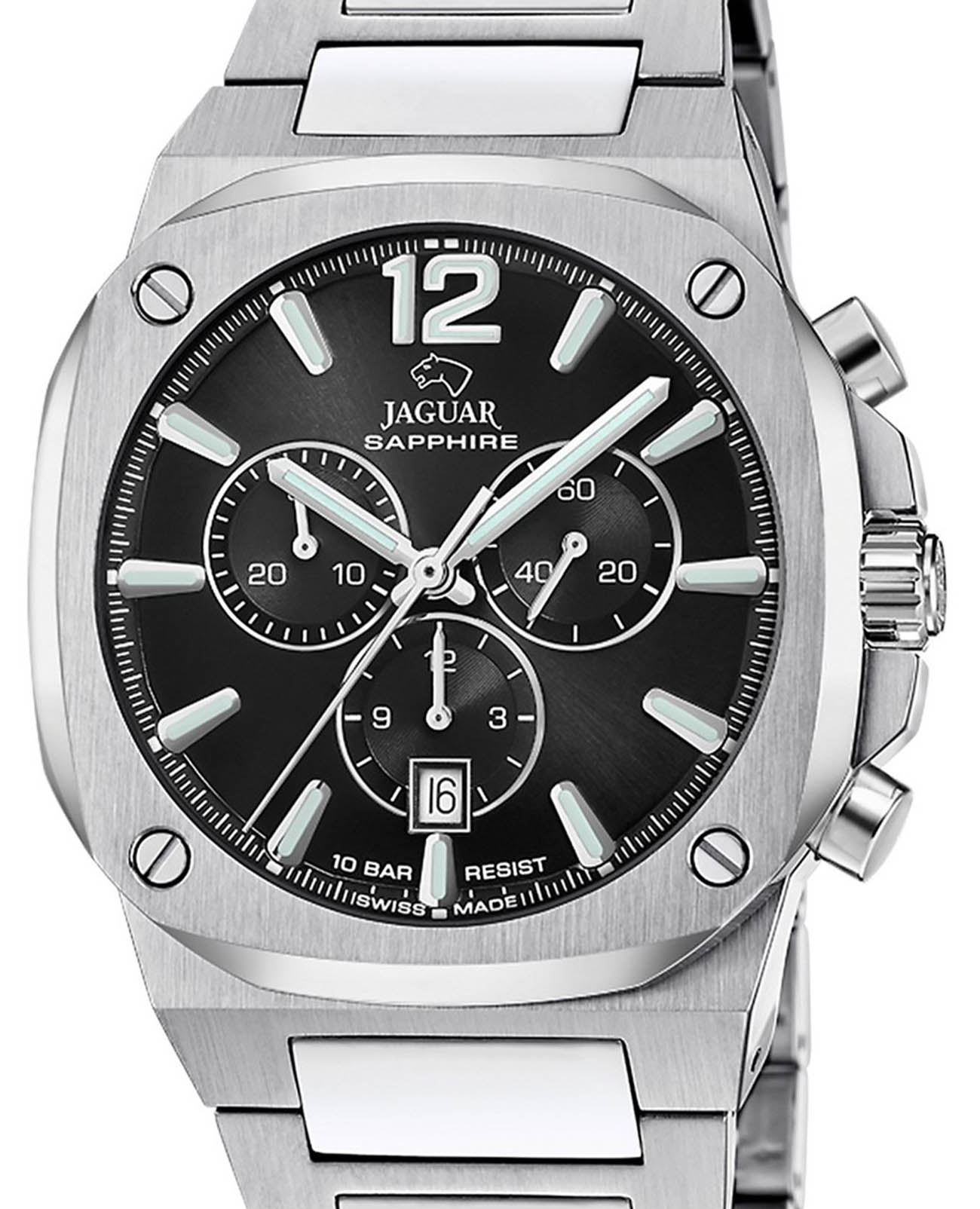 Мужские швейцарские часы-хронографХронографФункция позволяет измерять отрезки времени с особой точностью: часы, минуты, секунды. Верным признаком хронографа является наличие на циферблате 3 дополнительных окошек-счётчиков. Jaguar Rond Carre J1025/3. Кварцевый швейцарский калибр Ronda 5030d. Сапфировое стеклоСапфировое стеклоПрочный и надёжный материал из кристалла сапфира синтетического происхождения, характеризующийся особой твёрдостью и устойчивостью к царапинам и повреждениям. устойчивое к мелким механическим повреждениям. Корпус и браслет часов изготовлены из нержавеющей стали. Стрелки и метки с люминесцентным покрытиемЛюминесцентное покрытиеПозволяет считывать показания времени в темноте. Производители наносят на стрелки, часовые индексы, безель или поверхность циферблата светонакопительный состав, дающий холодное свечение.. Окошко даты находится в положении 6 часов. Класс водозащиты: 100 метров, позволит плавать, нырять и заниматься другими водными видами спорта. Стальной браслет на раскладной застёжкеРаскладная застёжкаТакой тип застёжки используется только на браслетах из металла. Она никогда не раскрывается полностью, происходит разделение на 2 и более частей. Раскладывающая застёжка снизит вероятность потери часов к минимуму..