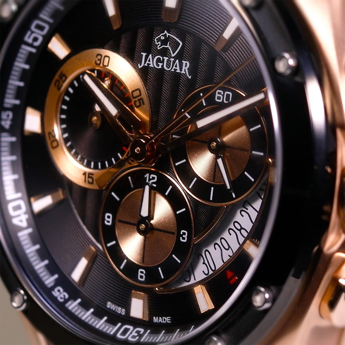 Мужские швейцарские часы-хронографХронографФункция позволяет измерять отрезки времени с особой точностью: часы, минуты, секунды. Верным признаком хронографа является наличие на циферблате 3 дополнительных окошек-счётчиков. Jaguar Special Edition J691/1. Кварцевый швейцарский калибр Ronda 5030.D. Сапфировое стеклоСапфировое стеклоПрочный и надёжный материал из кристалла сапфира синтетического происхождения, характеризующийся особой твёрдостью и устойчивостью к царапинам и повреждениям. устойчивое к мелким механическим повреждениям. Корпус часов изготовлен из нержавеющей стали с PVD-покрытиемPVDУльтратонкое покрытие наносится в технике вакуумного напыления, сочетает в себе нитрид титана особой прочности со слоем золота или оксида хрома. Несёт в себе декоративную или защитную функцию.. Стрелки и метки с люминесцентным покрытиемЛюминесцентное покрытиеПозволяет считывать показания времени в темноте. Производители наносят на стрелки, часовые индексы, безель или поверхность циферблата светонакопительный состав, дающий холодное свечение.. Окошко даты находится в положении между «3» и «6 часами». Класс водозащиты: 100 метров, позволит плавать, нырять и заниматься другими водными видами спорта. Силиконовый ремешок на стандартной застёжке. БезельБезельВнешний ободок, закрепляющий стекло. В спортивных часах так называется поворотное кольцо с делениями на циферблате, выполняет роль таймера – замеряет отрезки времени на шкале. Неподвижный безель – элемент декора. Однонаправленно вращающийся безель на дайверских часах позволяет фиксировать моменты погружения и выныривания на поверхность. с PVD-покрытиемPVDУльтратонкое покрытие наносится в технике вакуумного напыления, сочетает в себе нитрид титана особой прочности со слоем золота или оксида хрома. Несёт в себе декоративную или защитную функцию..