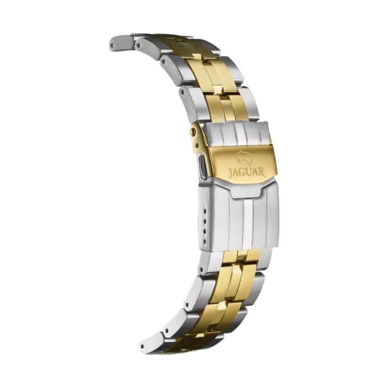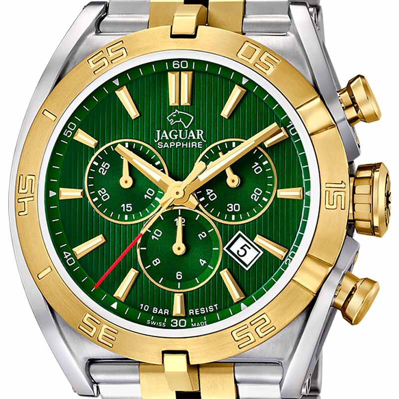 Мужские швейцарские часы-хронографХронографФункция позволяет измерять отрезки времени с особой точностью: часы, минуты, секунды. Верным признаком хронографа является наличие на циферблате 3 дополнительных окошек-счётчиков. Jaguar Executive J855/B. Кварцевый швейцарский калибр Ronda 5030d. Сапфировое стеклоСапфировое стеклоПрочный и надёжный материал из кристалла сапфира синтетического происхождения, характеризующийся особой твёрдостью и устойчивостью к царапинам и повреждениям. устойчивое к мелким механическим повреждениям. Корпус и браслет часов изготовлены из нержавеющей стали. Стрелки и метки с люминесцентным покрытиемЛюминесцентное покрытиеПозволяет считывать показания времени в темноте. Производители наносят на стрелки, часовые индексы, безель или поверхность циферблата светонакопительный состав, дающий холодное свечение.. Окошко даты находится в положении между «4» и «5 часами». Класс водозащиты: 100 метров, позволит плавать, нырять и заниматься другими водными видами спорта. Стальной браслет с частичным PVD-покрытиемPVDУльтратонкое покрытие наносится в технике вакуумного напыления, сочетает в себе нитрид титана особой прочности со слоем золота или оксида хрома. Несёт в себе декоративную или защитную функцию. на раскладной застёжкеРаскладная застёжкаТакой тип застёжки используется только на браслетах из металла. Она никогда не раскрывается полностью, происходит разделение на 2 и более частей. Раскладывающая застёжка снизит вероятность потери часов к минимуму.. БезельБезельВнешний ободок, закрепляющий стекло. В спортивных часах так называется поворотное кольцо с делениями на циферблате, выполняет роль таймера – замеряет отрезки времени на шкале. Неподвижный безель – элемент декора. Однонаправленно вращающийся безель на дайверских часах позволяет фиксировать моменты погружения и выныривания на поверхность. с PVD-покрытиемPVDУльтратонкое покрытие наносится в технике вакуумного напыления, сочетает в себе нитрид титана особой прочности со слоем золота или оксида хрома. Несёт в себе декоративную или защитную функцию..