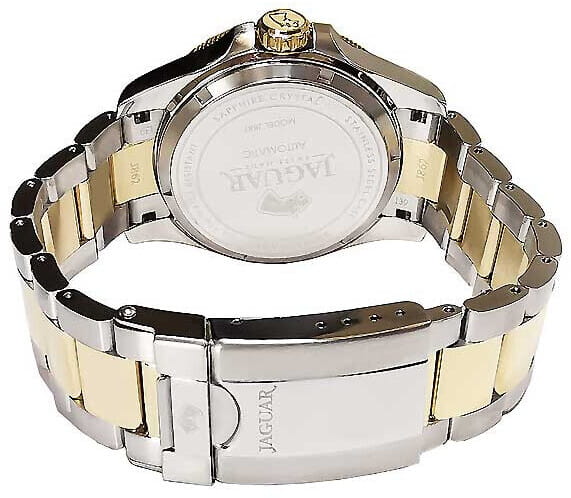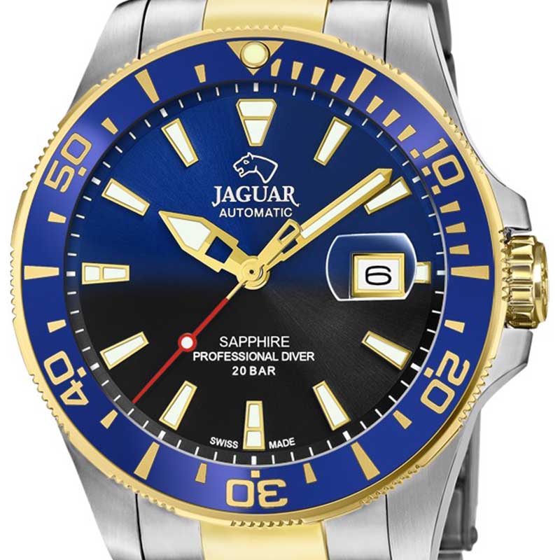 Мужские швейцарские часы Jaguar Automatic Diver J887/3. Автоматический швейцарский калибр ETA 2824-2. Сапфировое стеклоСапфировое стеклоПрочный и надёжный материал из кристалла сапфира синтетического происхождения, характеризующийся особой твёрдостью и устойчивостью к царапинам и повреждениям. устойчивое к мелким механическим повреждениям. Корпус часов изготовлен из нержавеющей стали. Стрелки и метки с люминесцентным покрытиемЛюминесцентное покрытиеПозволяет считывать показания времени в темноте. Производители наносят на стрелки, часовые индексы, безель или поверхность циферблата светонакопительный состав, дающий холодное свечение.. Окошко даты находится в положении 3 часа. Класс водозащиты: 200 метров, позволит плавать, нырять и заниматься другими водными видами спорта. Стальной браслет с частичным PVD-покрытиемPVDУльтратонкое покрытие наносится в технике вакуумного напыления, сочетает в себе нитрид титана особой прочности со слоем золота или оксида хрома. Несёт в себе декоративную или защитную функцию. на раскладной застёжкеРаскладная застёжкаТакой тип застёжки используется только на браслетах из металла. Она никогда не раскрывается полностью, происходит разделение на 2 и более частей. Раскладывающая застёжка снизит вероятность потери часов к минимуму.. БезельБезельВнешний ободок, закрепляющий стекло. В спортивных часах так называется поворотное кольцо с делениями на циферблате, выполняет роль таймера – замеряет отрезки времени на шкале. Неподвижный безель – элемент декора. Однонаправленно вращающийся безель на дайверских часах позволяет фиксировать моменты погружения и выныривания на поверхность. с PVD-покрытиемPVDУльтратонкое покрытие наносится в технике вакуумного напыления, сочетает в себе нитрид титана особой прочности со слоем золота или оксида хрома. Несёт в себе декоративную или защитную функцию..