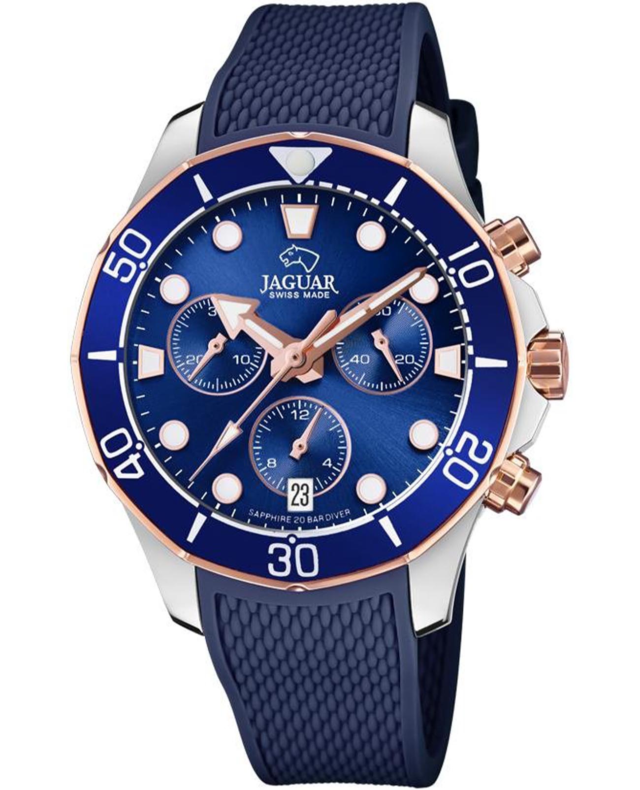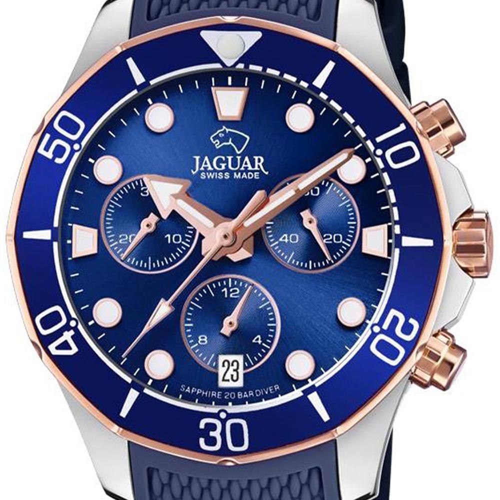 Женские швейцарские часы-хронографХронографФункция позволяет измерять отрезки времени с особой точностью: часы, минуты, секунды. Верным признаком хронографа является наличие на циферблате 3 дополнительных окошек-счётчиков. Jaguar Woman J890/4. Кварцевый швейцарский калибр Ronda 5030D. Сапфировое стеклоСапфировое стеклоПрочный и надёжный материал из кристалла сапфира синтетического происхождения, характеризующийся особой твёрдостью и устойчивостью к царапинам и повреждениям. устойчивое к мелким механическим повреждениям. Корпус часов изготовлен из нержавеющей стали. Стрелки и метки с люминесцентным покрытиемЛюминесцентное покрытиеПозволяет считывать показания времени в темноте. Производители наносят на стрелки, часовые индексы, безель или поверхность циферблата светонакопительный состав, дающий холодное свечение.. Окошко даты находится в положении 6 часов. Класс водозащиты: 200 метров, позволит плавать, нырять и заниматься другими водными видами спорта. Силиконовый ремешок на стандартной застёжке. БезельБезельВнешний ободок, закрепляющий стекло. В спортивных часах так называется поворотное кольцо с делениями на циферблате, выполняет роль таймера – замеряет отрезки времени на шкале. Неподвижный безель – элемент декора. Однонаправленно вращающийся безель на дайверских часах позволяет фиксировать моменты погружения и выныривания на поверхность. с PVD-покрытиемPVDУльтратонкое покрытие наносится в технике вакуумного напыления, сочетает в себе нитрид титана особой прочности со слоем золота или оксида хрома. Несёт в себе декоративную или защитную функцию..