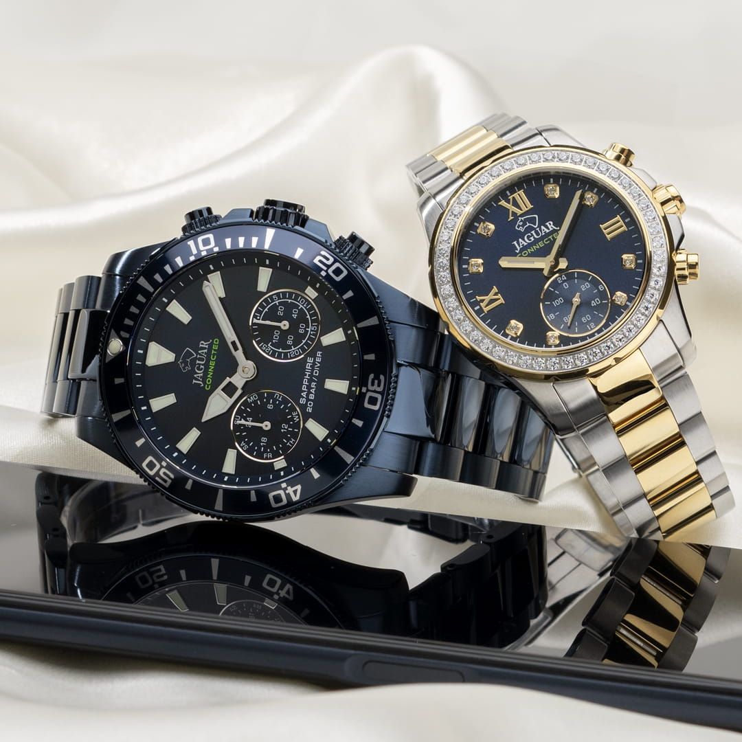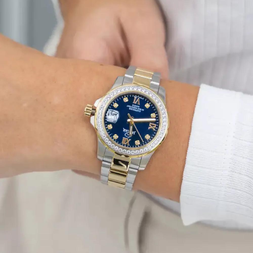 Женские швейцарские часы Jaguar Woman J893/2. Кварцевый швейцарский калибр Ronda 705. Сапфировое стеклоСапфировое стеклоПрочный и надёжный материал из кристалла сапфира синтетического происхождения, характеризующийся особой твёрдостью и устойчивостью к царапинам и повреждениям. устойчивое к мелким механическим повреждениям. Корпус и браслет часов изготовлены из нержавеющей стали, с безелем, инкрустированным цирконием. Стрелки с люминесцентным покрытиемЛюминесцентное покрытиеПозволяет считывать показания времени в темноте. Производители наносят на стрелки, часовые индексы, безель или поверхность циферблата светонакопительный состав, дающий холодное свечение.. Окошко даты находится в положении 3 часа. Класс водозащиты: 200 метров, позволит плавать, нырять и заниматься другими водными видами спорта. Стальной браслет с частичным PVD-покрытиемPVDУльтратонкое покрытие наносится в технике вакуумного напыления, сочетает в себе нитрид титана особой прочности со слоем золота или оксида хрома. Несёт в себе декоративную или защитную функцию. на раскладной застёжкеРаскладная застёжкаТакой тип застёжки используется только на браслетах из металла. Она никогда не раскрывается полностью, происходит разделение на 2 и более частей. Раскладывающая застёжка снизит вероятность потери часов к минимуму.. Циферблат украшен кристаллами в роли часовых индексов. БезельБезельВнешний ободок, закрепляющий стекло. В спортивных часах так называется поворотное кольцо с делениями на циферблате, выполняет роль таймера – замеряет отрезки времени на шкале. Неподвижный безель – элемент декора. Однонаправленно вращающийся безель на дайверских часах позволяет фиксировать моменты погружения и выныривания на поверхность. с PVD-покрытиемPVDУльтратонкое покрытие наносится в технике вакуумного напыления, сочетает в себе нитрид титана особой прочности со слоем золота или оксида хрома. Несёт в себе декоративную или защитную функцию. инкрустирован кристаллами.