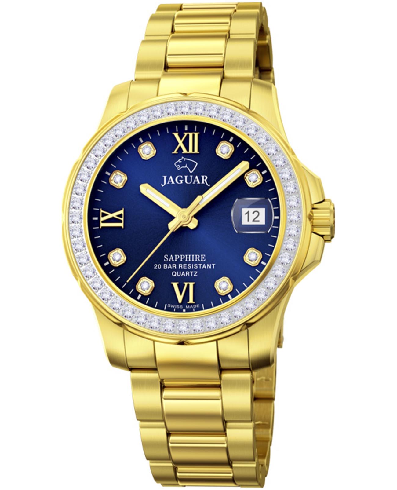 Женские швейцарские часы Jaguar Woman J895/3. Кварцевый швейцарский калибр Ronda 705. Сапфировое стеклоСапфировое стеклоПрочный и надёжный материал из кристалла сапфира синтетического происхождения, характеризующийся особой твёрдостью и устойчивостью к царапинам и повреждениям. устойчивое к мелким механическим повреждениям. Корпус и браслет часов изготовлены из нержавеющей стали с PVD-покрытиемPVDУльтратонкое покрытие наносится в технике вакуумного напыления, сочетает в себе нитрид титана особой прочности со слоем золота или оксида хрома. Несёт в себе декоративную или защитную функцию.. Стрелки с люминесцентным покрытиемЛюминесцентное покрытиеПозволяет считывать показания времени в темноте. Производители наносят на стрелки, часовые индексы, безель или поверхность циферблата светонакопительный состав, дающий холодное свечение.. Окошко даты находится в положении 3 часа. Класс водозащиты: 200 метров, позволит плавать, нырять и заниматься другими водными видами спорта. Стальной браслет с частичным PVD-покрытиемPVDУльтратонкое покрытие наносится в технике вакуумного напыления, сочетает в себе нитрид титана особой прочности со слоем золота или оксида хрома. Несёт в себе декоративную или защитную функцию. на раскладной застёжкеРаскладная застёжкаТакой тип застёжки используется только на браслетах из металла. Она никогда не раскрывается полностью, происходит разделение на 2 и более частей. Раскладывающая застёжка снизит вероятность потери часов к минимуму.. Циферблат украшен кристаллами в роли часовых индексов. БезельБезельВнешний ободок, закрепляющий стекло. В спортивных часах так называется поворотное кольцо с делениями на циферблате, выполняет роль таймера – замеряет отрезки времени на шкале. Неподвижный безель – элемент декора. Однонаправленно вращающийся безель на дайверских часах позволяет фиксировать моменты погружения и выныривания на поверхность. с PVD-покрытиемPVDУльтратонкое покрытие наносится в технике вакуумного напыления, сочетает в себе нитрид титана особой прочности со слоем золота или оксида хрома. Несёт в себе декоративную или защитную функцию. инкрустирован кристаллами.