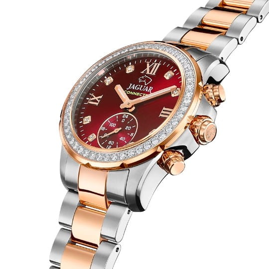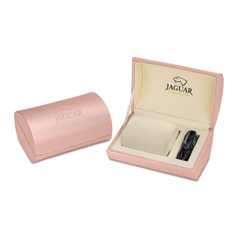 Женские швейцарские часы Jaguar Connected Lady J981/3. Сапфировое стеклоСапфировое стеклоПрочный и надёжный материал из кристалла сапфира синтетического происхождения, характеризующийся особой твёрдостью и устойчивостью к царапинам и повреждениям. устойчивое к мелким механическим повреждениям. Корпус часов изготовлен из нержавеющей стали. Стрелки и метки с люминесцентным покрытиемЛюминесцентное покрытиеПозволяет считывать показания времени в темноте. Производители наносят на стрелки, часовые индексы, безель или поверхность циферблата светонакопительный состав, дающий холодное свечение.. Класс водозащиты: 50 метров, позволит защитить корпус от случайных брызг или капель дождя. БезельБезельВнешний ободок, закрепляющий стекло. В спортивных часах так называется поворотное кольцо с делениями на циферблате, выполняет роль таймера – замеряет отрезки времени на шкале. Неподвижный безель – элемент декора. Однонаправленно вращающийся безель на дайверских часах позволяет фиксировать моменты погружения и выныривания на поверхность. с PVD-покрытиемPVDУльтратонкое покрытие наносится в технике вакуумного напыления, сочетает в себе нитрид титана особой прочности со слоем золота или оксида хрома. Несёт в себе декоративную или защитную функцию. и циферблат инкрустированы цирконием. Стальной браслет с частичным PVD-покрытиемPVDУльтратонкое покрытие наносится в технике вакуумного напыления, сочетает в себе нитрид титана особой прочности со слоем золота или оксида хрома. Несёт в себе декоративную или защитную функцию. на раскладной застёжкеРаскладная застёжкаТакой тип застёжки используется только на браслетах из металла. Она никогда не раскрывается полностью, происходит разделение на 2 и более частей. Раскладывающая застёжка снизит вероятность потери часов к минимуму.. За точный ход работы часов, из коллекции Connected, отвечает кварцевый гибридный механизм швейцарского производства со Смарт-Модулем. Данный тип механизма обеспечивает возможность подключить часы к телефону через Bluetooth и управлять большим рядом дополнительных функций на выбор с помошью приложения Jaguar. Дополнительные функции: отображение даты и дня недели, секундомер, таймер, GMT, шагомер, поиск телефона, включение/выключение звука телефона при входящих вызовах, переключение музыки, вибро-уведомления.