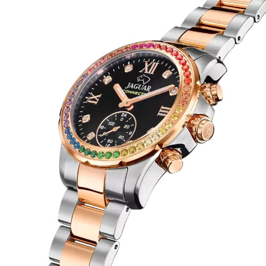 Женские швейцарские часы Jaguar Connected Lady J981/5. Сапфировое стеклоСапфировое стеклоПрочный и надёжный материал из кристалла сапфира синтетического происхождения, характеризующийся особой твёрдостью и устойчивостью к царапинам и повреждениям. устойчивое к мелким механическим повреждениям. Корпус часов изготовлен из нержавеющей стали. Стрелки и метки с люминесцентным покрытиемЛюминесцентное покрытиеПозволяет считывать показания времени в темноте. Производители наносят на стрелки, часовые индексы, безель или поверхность циферблата светонакопительный состав, дающий холодное свечение.. Класс водозащиты: 50 метров, позволит защитить корпус от случайных брызг или капель дождя. БезельБезельВнешний ободок, закрепляющий стекло. В спортивных часах так называется поворотное кольцо с делениями на циферблате, выполняет роль таймера – замеряет отрезки времени на шкале. Неподвижный безель – элемент декора. Однонаправленно вращающийся безель на дайверских часах позволяет фиксировать моменты погружения и выныривания на поверхность. с PVD-покрытиемPVDУльтратонкое покрытие наносится в технике вакуумного напыления, сочетает в себе нитрид титана особой прочности со слоем золота или оксида хрома. Несёт в себе декоративную или защитную функцию. и циферблат инкрустированы цирконием. Стальной браслет с частичным PVD-покрытиемPVDУльтратонкое покрытие наносится в технике вакуумного напыления, сочетает в себе нитрид титана особой прочности со слоем золота или оксида хрома. Несёт в себе декоративную или защитную функцию. на раскладной застёжкеРаскладная застёжкаТакой тип застёжки используется только на браслетах из металла. Она никогда не раскрывается полностью, происходит разделение на 2 и более частей. Раскладывающая застёжка снизит вероятность потери часов к минимуму.. За точный ход работы часов, из коллекции Connected, отвечает кварцевый гибридный механизм швейцарского производства со Смарт-Модулем. Данный тип механизма обеспечивает возможность подключить часы к телефону через Bluetooth и управлять большим рядом дополнительных функций на выбор с помошью приложения Jaguar. Дополнительные функции: отображение даты и дня недели, секундомер, таймер, GMT, шагомер, поиск телефона, включение/выключение звука телефона при входящих вызовах, переключение музыки, вибро-уведомления.