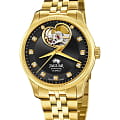 Женские швейцарские часы Jaguar Automatic Open Heart J996/2, механизм — автоподзавод. В часах с автоподзаводом заводная головка практически не используется, что исключает истирание ее материала и материала корпуса. Сапфировое стеклоСапфировое стеклоПрочный и надёжный материал из кристалла сапфира синтетического происхождения, характеризующийся особой твёрдостью и устойчивостью к царапинам и повреждениям. устойчивое к мелким механическим повреждениям. Корпус часов изготовлен из нержавеющей стали с PVD-покрытиемPVDУльтратонкое покрытие наносится в технике вакуумного напыления, сочетает в себе нитрид титана особой прочности со слоем золота или оксида хрома. Несёт в себе декоративную или защитную функцию.. Класс водозащиты: 50 метров, позволит защитить корпус от случайных брызг или капель дождя. Стальной браслет с PVD-покрытиемPVDУльтратонкое покрытие наносится в технике вакуумного напыления, сочетает в себе нитрид титана особой прочности со слоем золота или оксида хрома. Несёт в себе декоративную или защитную функцию. на застёжке-бабочке с кнопкамиЗастёжка "бабочка"Такой вид застёжки дополняется предохранителями, помогающими избежать случайного раскрытия браслета. Обладают изящным исполнением. . Циферблат украшен кристаллами в роли часовых индексов, крупная апертура в виде сердца, открывающая обзор на балансовое колесо механизма. БезельБезельВнешний ободок, закрепляющий стекло. В спортивных часах так называется поворотное кольцо с делениями на циферблате, выполняет роль таймера – замеряет отрезки времени на шкале. Неподвижный безель – элемент декора. Однонаправленно вращающийся безель на дайверских часах позволяет фиксировать моменты погружения и выныривания на поверхность. с PVD-покрытиемPVDУльтратонкое покрытие наносится в технике вакуумного напыления, сочетает в себе нитрид титана особой прочности со слоем золота или оксида хрома. Несёт в себе декоративную или защитную функцию..