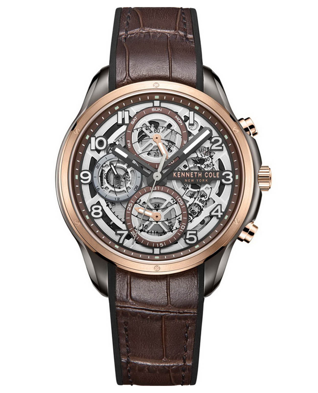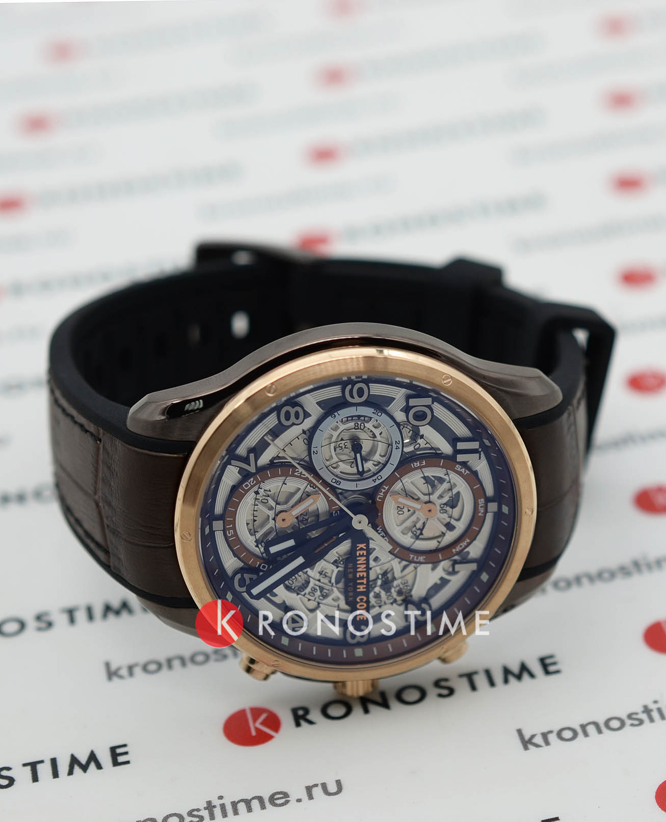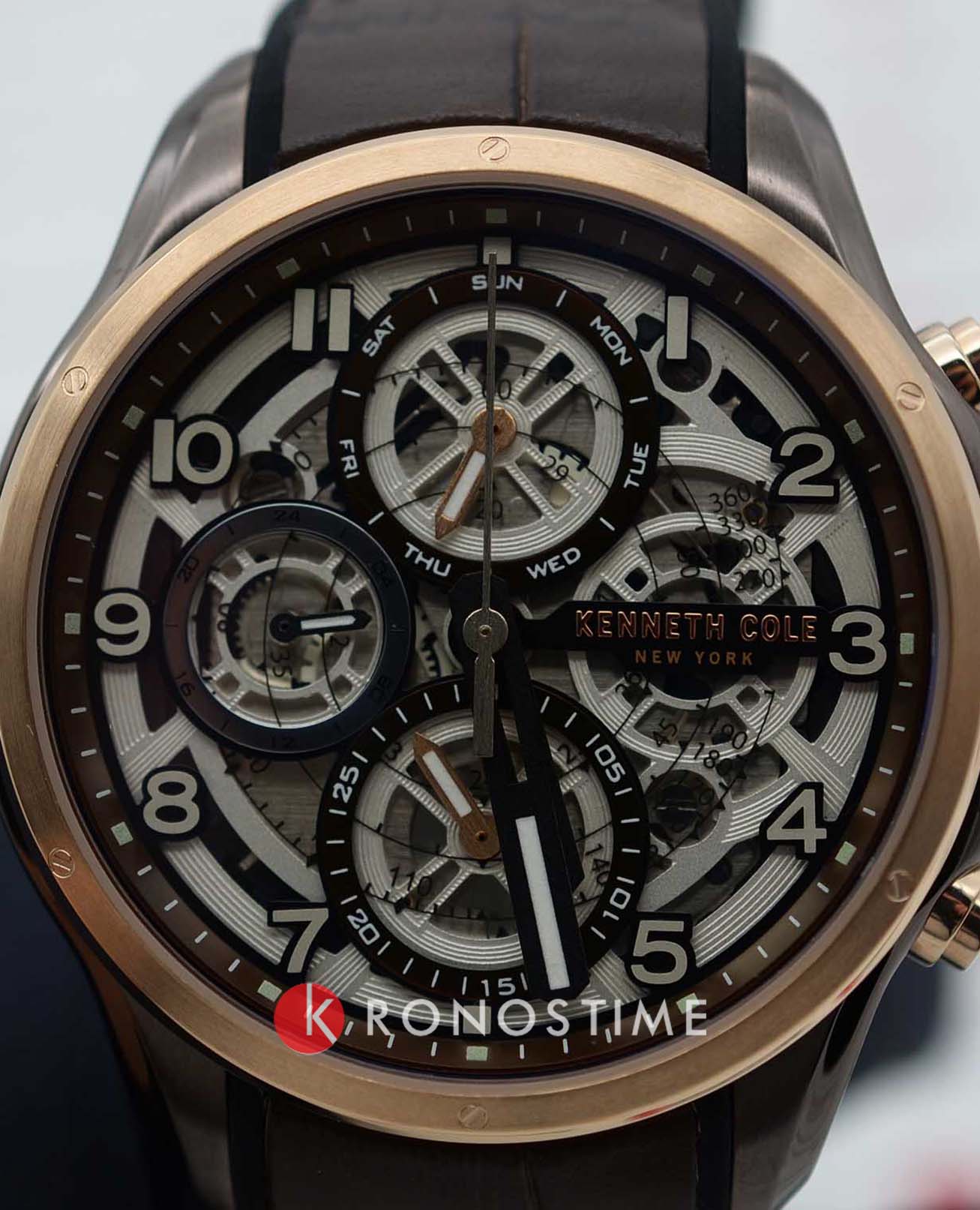 Мужские кварцевые часы-хронографХронографФункция позволяет измерять отрезки времени с особой точностью: часы, минуты, секунды. Верным признаком хронографа является наличие на циферблате 3 дополнительных окошек-счётчиков. с секундомеромСекундомерСекундоме́р — прибор, способный измерять интервалы времени с точностью до долей секунды. Kenneth Cole Dress Sport KCWGQ2218902, кварцевый механизм с высокой точностью. Класс водозащиты: 30 метров, позволит защитить корпус от случайных брызг или капель дождя. Корпус и безельБезельВнешний ободок, закрепляющий стекло. В спортивных часах так называется поворотное кольцо с делениями на циферблате, выполняет роль таймера – замеряет отрезки времени на шкале. Неподвижный безель – элемент декора. Однонаправленно вращающийся безель на дайверских часах позволяет фиксировать моменты погружения и выныривания на поверхность. изготовлен из стали с IP-покрытиемIP-покрытиеМетод ионного напыления. Демонстрирует повышенную устойчивость к истиранию, окислению и химическим веществам. Под воздействием высокого давления и температуры около 1500°C молекулы металла надёжно соединяются с частицами корпуса часов.. Индикация даты и дня недели. Стрелки и метки с люминесцентным покрытиемЛюминесцентное покрытиеПозволяет считывать показания времени в темноте. Производители наносят на стрелки, часовые индексы, безель или поверхность циферблата светонакопительный состав, дающий холодное свечение.. Кожаный ремешок на стандартной застёжке.