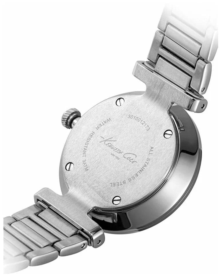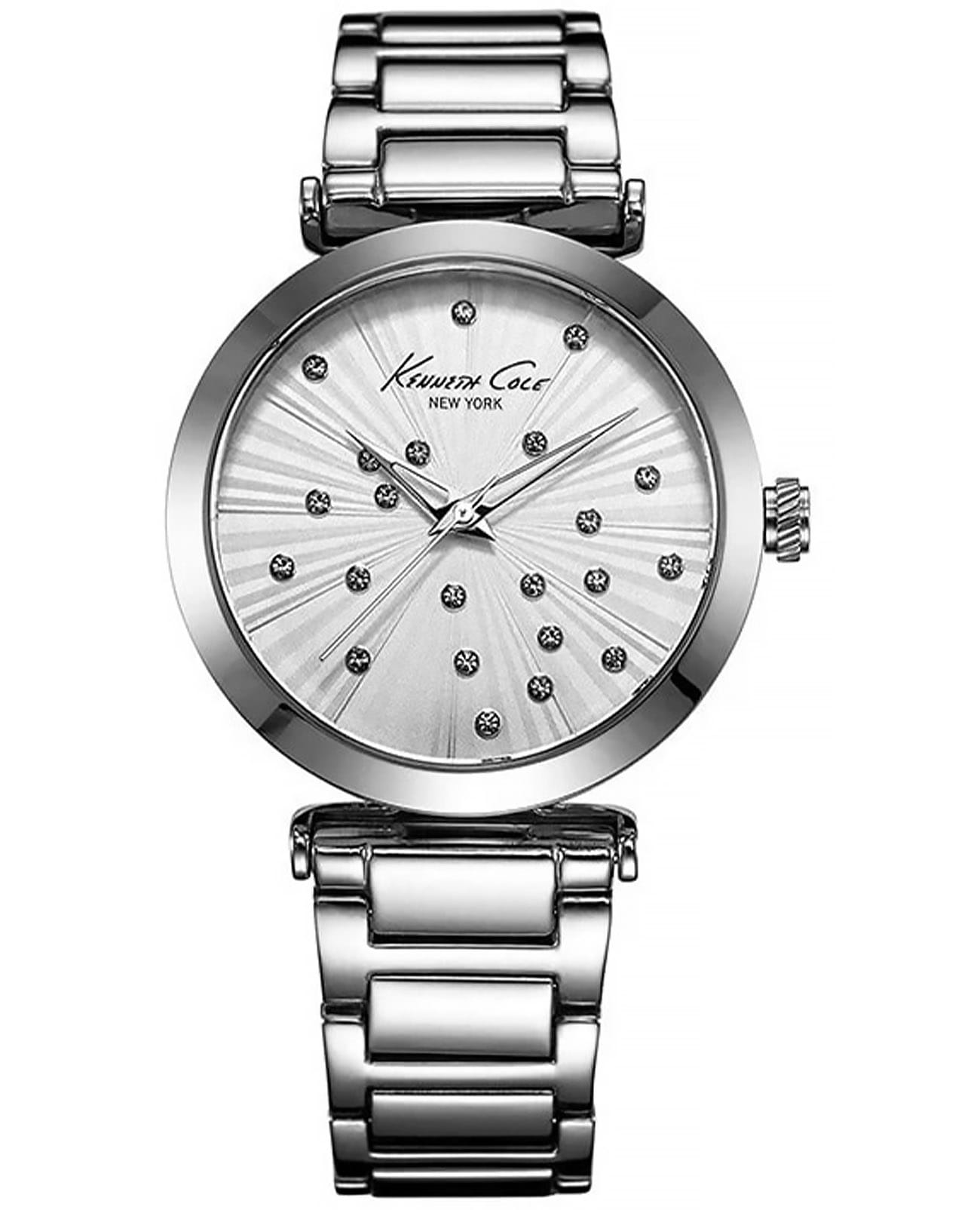 Женские кварцевые часы с минеральным стекломМинеральное стеклоМинеральное стекло представляет собой искусственно выращенный минерал кварца. Такое стекло отличается особой устойчивостью к повреждениям и царапинам. Уступает по некоторым качествам сапфировому стеклу. Kenneth Cole Classic IKC0018, кварцевый механизм с высокой точностью. Класс водозащиты: 30 метров, позволит защитить корпус от случайных брызг или капель дождя. Корпус часов изготовлен из стали. Стальной браслет на раскладной застёжкеРаскладная застёжкаТакой тип застёжки используется только на браслетах из металла. Она никогда не раскрывается полностью, происходит разделение на 2 и более частей. Раскладывающая застёжка снизит вероятность потери часов к минимуму.. Циферблат инкрустирован кристаллами.