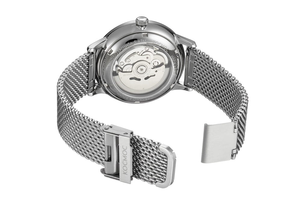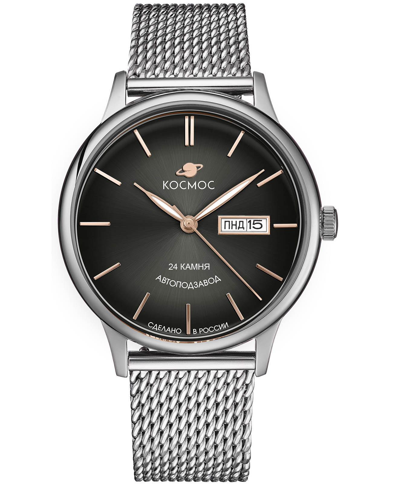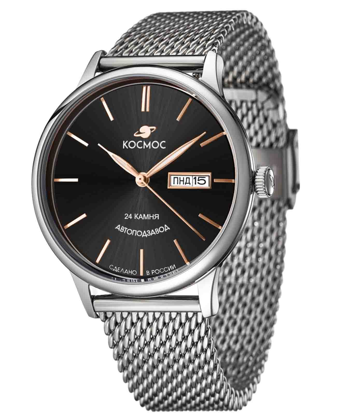Российские мужские механические часы Космос K 043.10.35 с автоподзаводом оснащены корпусом из нержавеющей стали 316L диаметром 41 мм и защищены минеральным стекломМинеральное стеклоМинеральное стекло представляет собой искусственно выращенный минерал кварца. Такое стекло отличается особой устойчивостью к повреждениям и царапинам. Уступает по некоторым качествам сапфировому стеклу.. Дополнен функциями отображения даты и дня недели. Заводная головка декорирована логотипом бренда в виде стилизованного изображения планеты. Часы имеют водонепроницаемость 50 метров, позволит защитить корпус от случайных брызг или капель дождя. Модель комплектуется браслетом из нержавеющей стали 316L с миланским плетением на раскладном замкеРаскладной замокДанный вариант застежки используется только на часах с металлическим браслетом. Отличительная особенность такого крепления в том, что длина браслета становится универсальной и вы можете самостоятельно отрегулировать нужный вам размер – застежка просто двигается по браслету часов.. Специальные крепежи позволяют легко заменить браслет на часах самостоятельно. Прочный корпус и надежный механизм делают эти часы универсальным аксессуаром для повседневного использования. Уникальный дизайн и высокое качество материалов подчеркивают индивидуальность владельца.