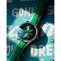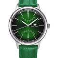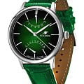 Мужские наручные часы Космос Космопорт K 058.17.38 — это сочетание традиций часового искусства 60-70-х годов и футуристического дизайна, вдохновленного космическими исследованиями. Они не только служат напоминанием о прошлом, но и побуждают задуматься о будущем, позволяя наслаждаться качеством и смыслом, вложенными в каждую деталь. Полированный корпус часов выполнен в виде силуэта летающей тарелки благодаря выпуклым формам стекла и нижней части корпуса. Стальные ушки, которые напоминают опоры летающей тарелки, завершает общий образ. На задней крышке часов выгравирован фантазийный сюжет – космическая станция будущего. Циферблат зеленого цвета выполнен в ретро стиле с закруглёнными краями, что требует применения сложной технологии производства, характерной для часов прошлых лет. Кончик секундной стрелки повторяет эту форму, а на выпуклом градиентном циферблате выполнена шлифовка, напоминающая солнечные лучи. Индексы, изготовленные вручную и закрепленные на двух штифтах, добавляют изысканности. Также присутствуют ретроградные индикаторы даты и второго времени (24 часа), которые возвращаются в исходное положение одним движением.  Люминесцентное покрытиеЛюминесцентное покрытиеПозволяет считывать показания времени в темноте. Производители наносят на стрелки, часовые индексы, безель или поверхность циферблата светонакопительный состав, дающий холодное свечение. на часовой и минутной стрелках, а также на стрелках ретроградных индикаторов и окантовке циферблата создает эффект светящегося ореола в темноте. Форма минерального стеклаМинеральное стеклоМинеральное стекло представляет собой искусственно выращенный минерал кварца. Такое стекло отличается особой устойчивостью к повреждениям и царапинам. Уступает по некоторым качествам сапфировому стеклу., представляющего собой двояковыпуклую конструкцию, тщательно проработана. Такое стекло не искажает изображение на циферблате, потому что внутренняя поверхность остаётся плоской, создавая эффект линзы. Производственный процесс для достижения двух параллельно изогнутых поверхностей очень сложен, и требуется высокая точность, чтобы избежать повреждения стекла. Ремешок из зеленой натуральной кожи оснащён креплениями, которые позволяют легко снимать и надевать его без использования дополнительных инструментов. Заводная головка, застежка и ремешок украшены фирменным логотипом, что подчеркивает индивидуальность и стиль этих часов.