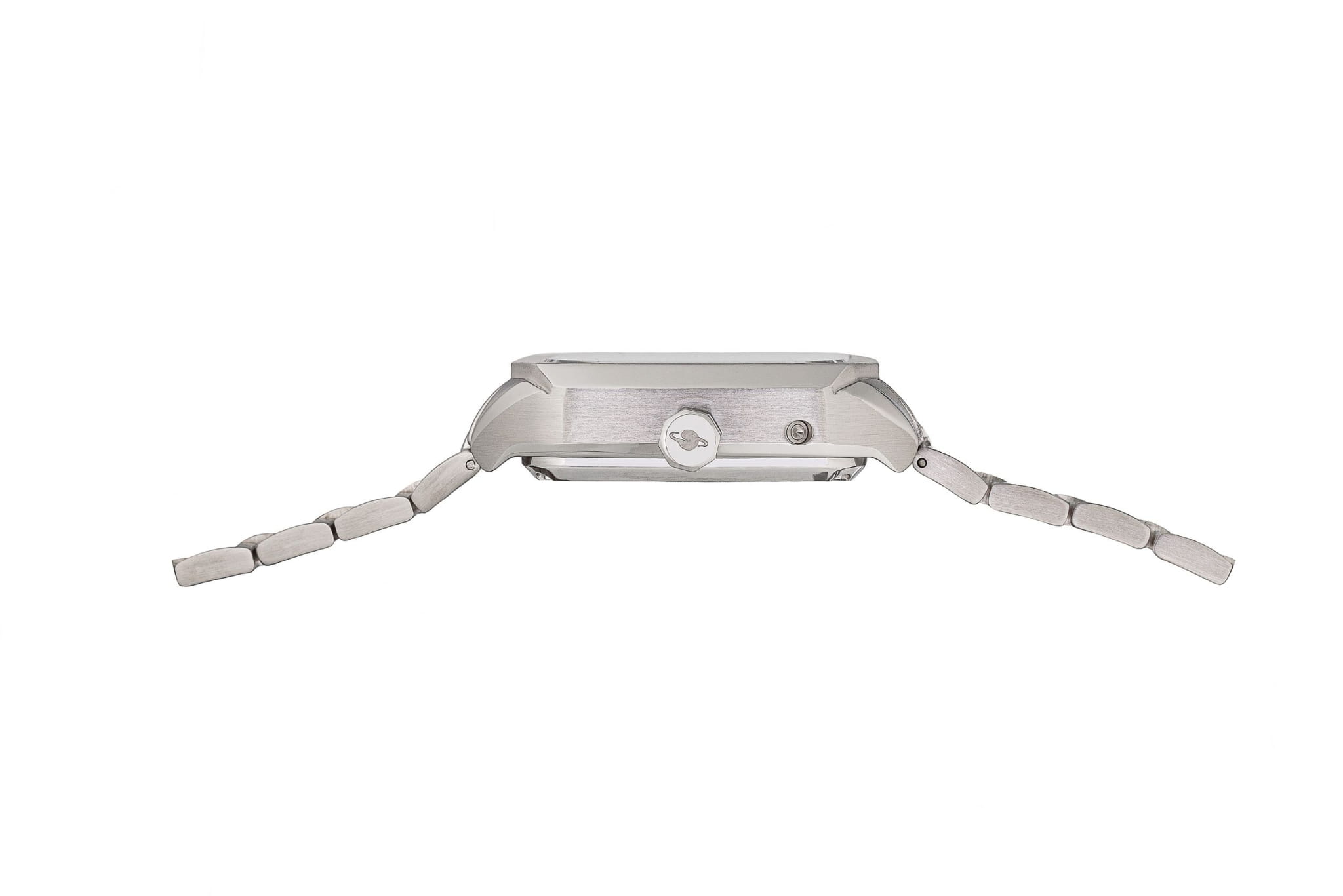 Мужские наручные часы Космос Марсоход II K 219.10.34 — это уникальная лимитированная серия, посвященная аппарату, способному передвигаться по поверхности Красной планеты. Марсоход ассоциируется с брутальностью, мастерством и технической сложностью. Наша страна дважды запускала подобные аппараты еще в 70-х годах прошлого века. Дизайн часов серии Марсоход вдохновлен лучшими работами советских мастеров, сочетая современные технологии часового искусства с обаянием стиля ретро. Корпус в форме квадрата с закругленными углами выполнен из нержавеющей стали украшенной зеркальной полировкой и сатинированием. Удобная заводная головка имеет форму гайки, что добавляет модели индустриальный шарм. Задняя крышка прозрачная, закрепленная на четырех винтах, и позволяет увидеть работу механизма TMI с подвижным ротором, на котором гравируется надпись «Сделано в России». Также здесь представлена гравировка с изображением космонавта, придающая часам особую значимость. Водостойкость достигает 10 атм (WR100), что позволяет использовать часы при плавании и других водных видах спорта. На задней крышке указан индивидуальный номер модели в формате от 01/50 до 50/50. Объемный циферблат состоит из двух уровней. В центре движутся три стрелки, часовая и минутная из которых имеют люминесцентное покрытиеЛюминесцентное покрытиеПозволяет считывать показания времени в темноте. Производители наносят на стрелки, часовые индексы, безель или поверхность циферблата светонакопительный состав, дающий холодное свечение., позволяющее определять время даже в темноте. Также, здесь расположили три дополнительных индикатора: день недели, месяц и время в формате 24-х часов. Для обозначения дня недели и месяца используется кириллица. Окошко даты между 4 и 5 часами выделено накладной рамкой. Циферблат защищен прочным сапфировым стеклом с антибликовым покрытиемСапфировое стеклоПрочный и надёжный материал из кристалла сапфира синтетического происхождения, характеризующийся особой твёрдостью и устойчивостью к царапинам и повреждениям., обеспечивающим отличную читаемость показаний в любых условиях. Второй уровень декорирован гильоше в виде солнечных лучей, на нем закреплены накладные индексы. Браслет изготовлен из литых стальных звеньев нержавеющей стали и оснащен удобной застёжкой «бабочка» с кнопкамиЗастёжка "бабочка"Такой вид застёжки дополняется предохранителями, помогающими избежать случайного раскрытия браслета. Обладают изящным исполнением. , которая сводит к минимуму вероятность потери. Заводная головка, застежка и браслет украшены фирменным логотипом бренда. Коллекция Марсоход — идеальный выбор для ценителей истории космических достижений и современных технологий.