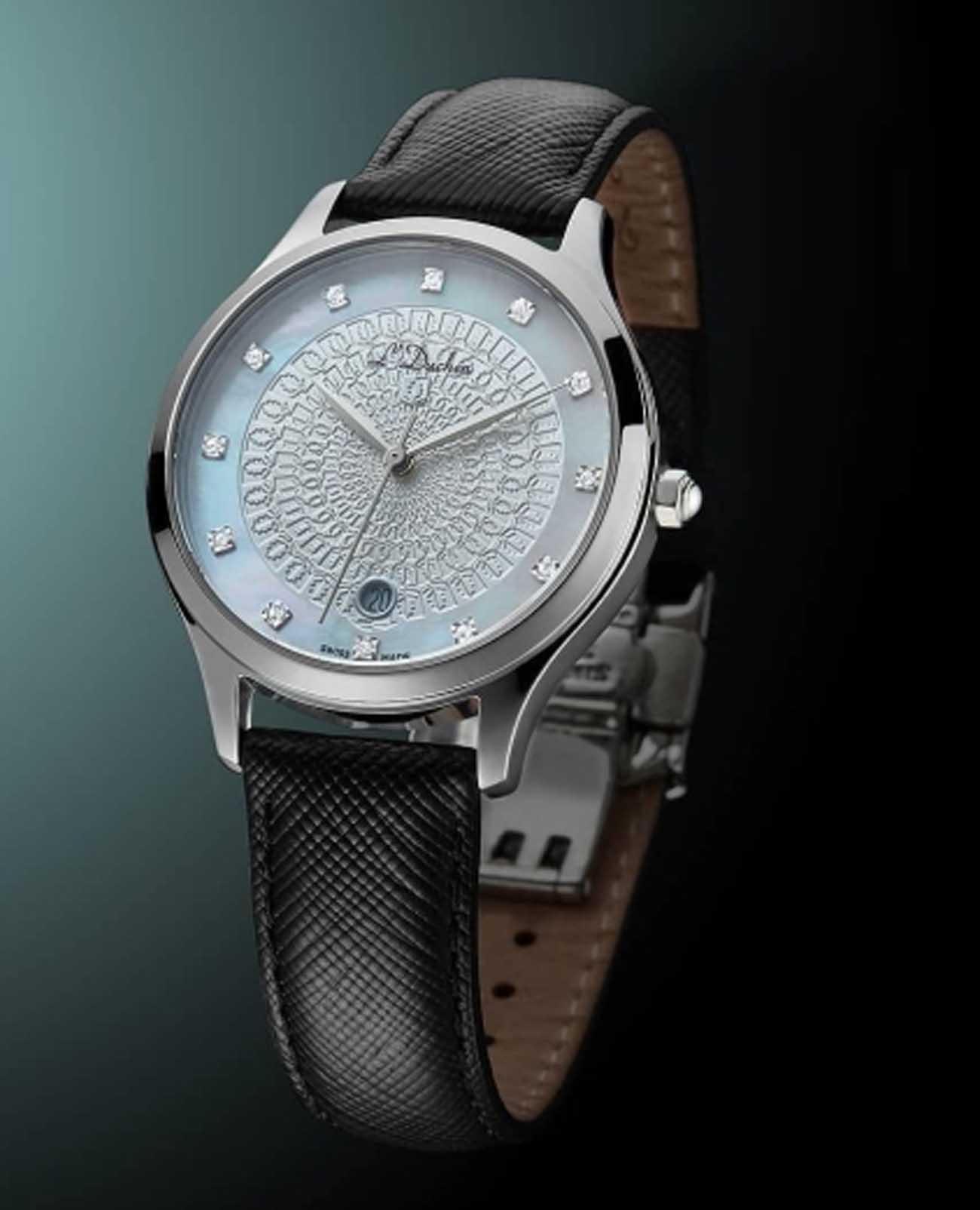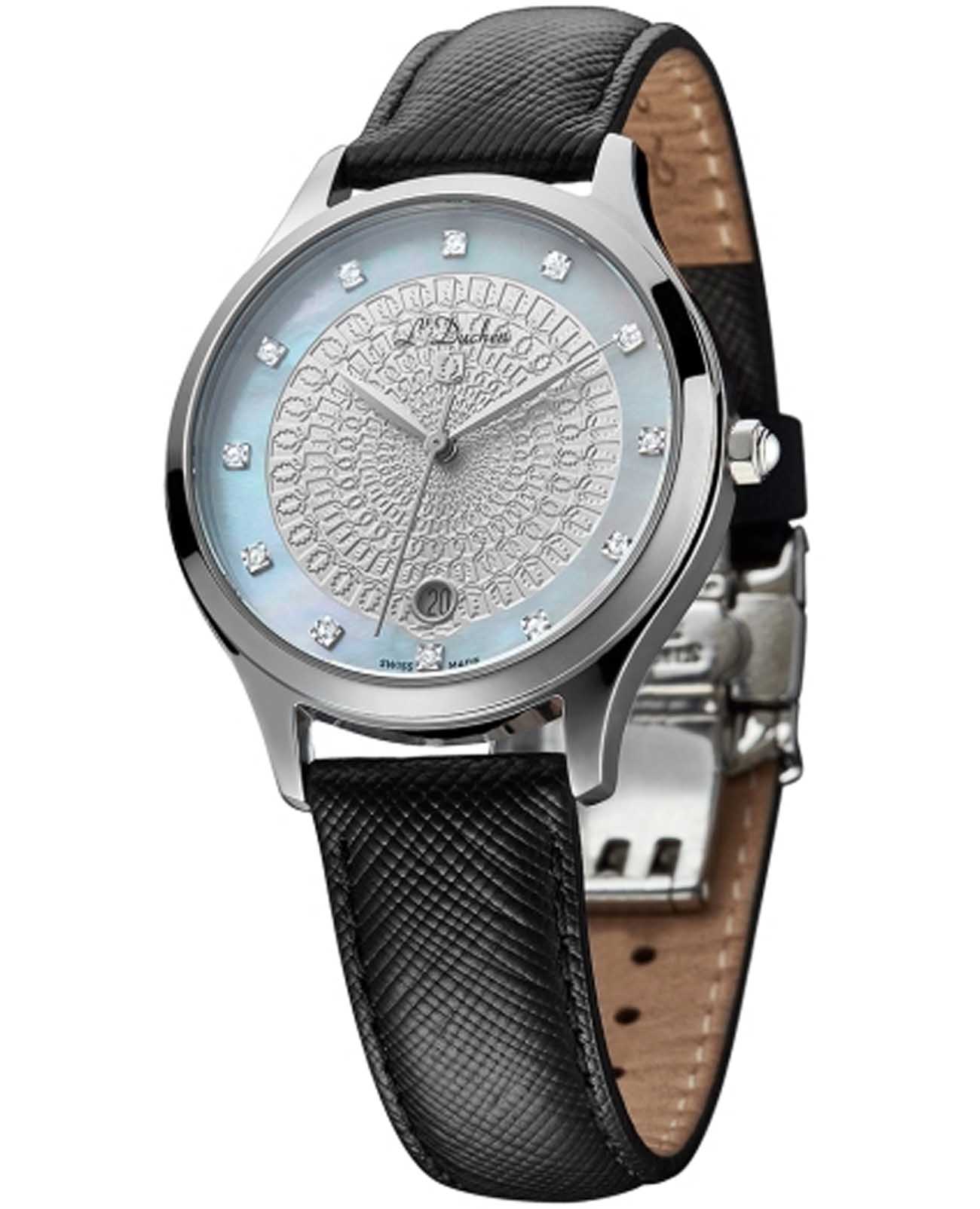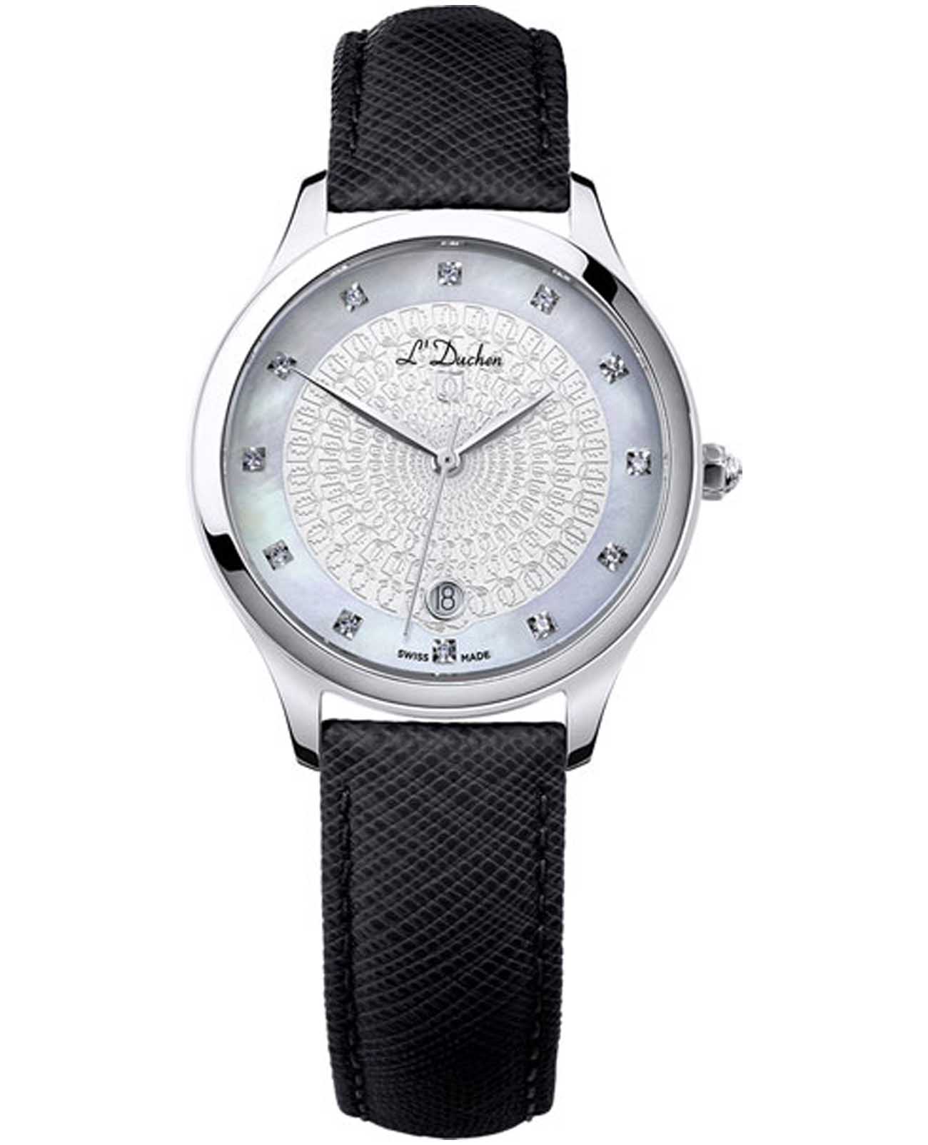Женские швейцарские часы L'Duchen Day & Night D 791.11.33, кварцевый механизм с высокой точностью. Сапфировое стеклоСапфировое стеклоПрочный и надёжный материал из кристалла сапфира синтетического происхождения, характеризующийся особой твёрдостью и устойчивостью к царапинам и повреждениям. устойчивое к появлению царапин, обладающее высокой прозрачностью. Корпус часов выполнен из нержавеющей стали. Окошко даты находится в положении 6 часов. Класс водозащиты: 50 метров, позволит защитить корпус от случайных брызг или капель дождя. Кожаный ремешок на застёжке «бабочка» с кнопкамиЗастёжка "бабочка"Такой вид застёжки дополняется предохранителями, помогающими избежать случайного раскрытия браслета. Обладают изящным исполнением. .
