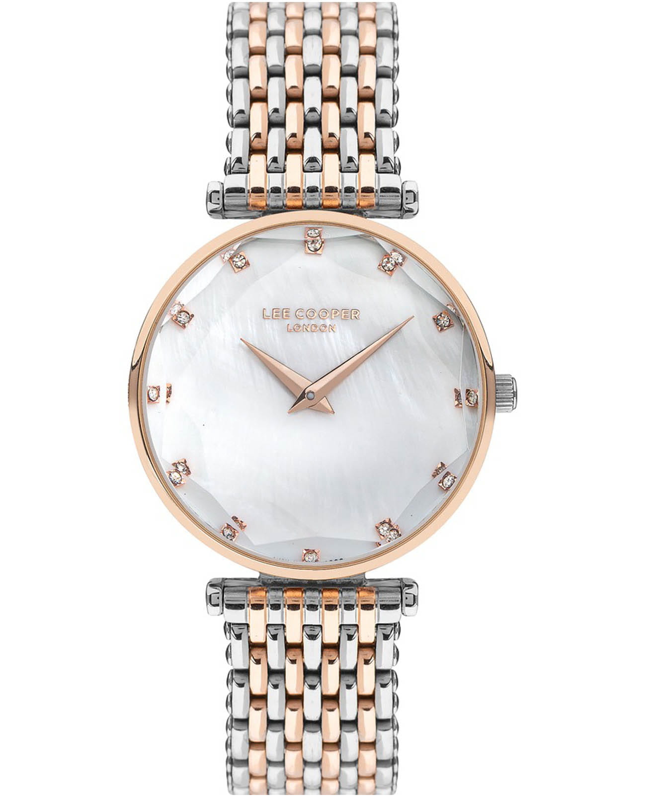 Женские наручные часы Lee Cooper LC07410.520 — это элегантная модель с утончённым дизайном. Корпус диаметром 33 мм выполнен из нержавеющей стали с IP-покрытиемIP-покрытиеМетод ионного напыления. Демонстрирует повышенную устойчивость к истиранию, окислению и химическим веществам. Под воздействием высокого давления и температуры около 1500°C молекулы металла надёжно соединяются с частицами корпуса часов., что придаёт часам изысканный вид. Перламутровый циферблат украшен изящными метками из кристаллов и стрелками, обеспечивая удобное считывание времени. Циферблат защищён минеральным стекломМинеральное стеклоМинеральное стекло представляет собой искусственно выращенный минерал кварца. Такое стекло отличается особой устойчивостью к повреждениям и царапинам. Уступает по некоторым качествам сапфировому стеклу., устойчивым к царапинам. Часы работают на кварцевом механизме, обеспечивая точность хода. Браслет из нержавеющей стали с раскладной застёжкойРаскладная застёжкаТакой тип застёжки используется только на браслетах из металла. Она никогда не раскрывается полностью, происходит разделение на 2 и более частей. Раскладывающая застёжка снизит вероятность потери часов к минимуму. гарантирует комфортное ношение и надёжную фиксацию на запястье. Водозащита 30 метров защищает часы от случайных брызг и дождя, делая их подходящими для повседневного использования.