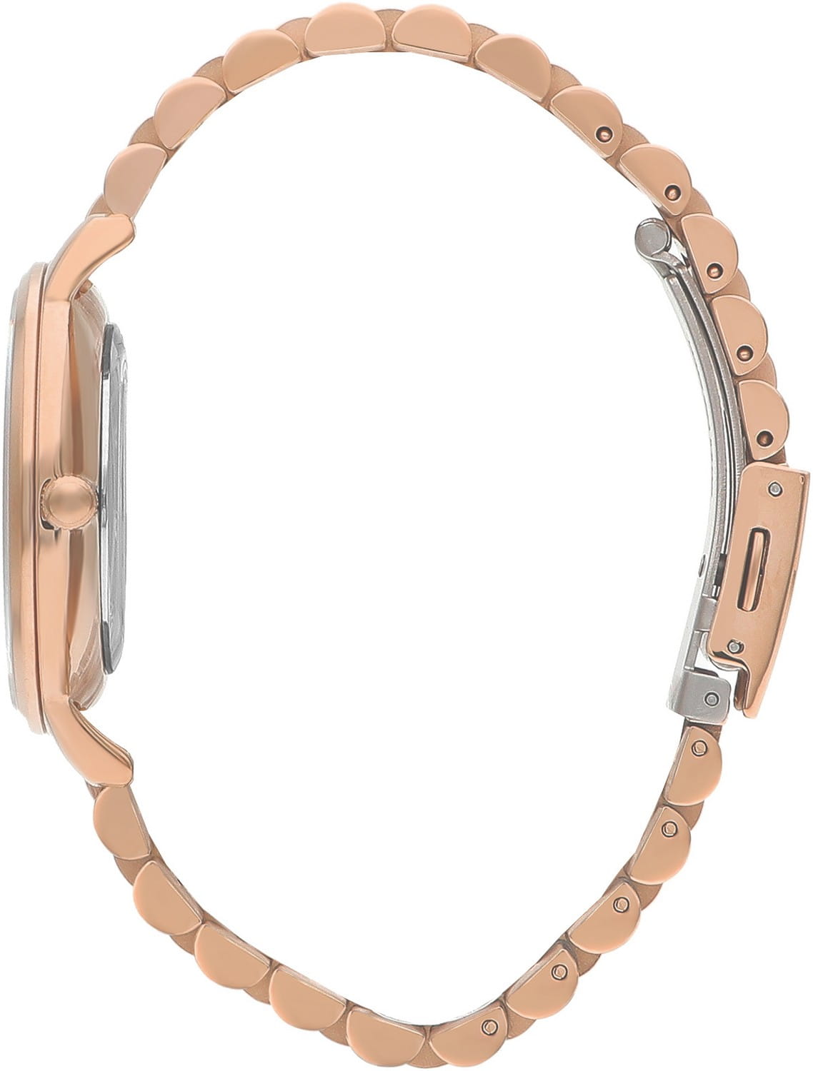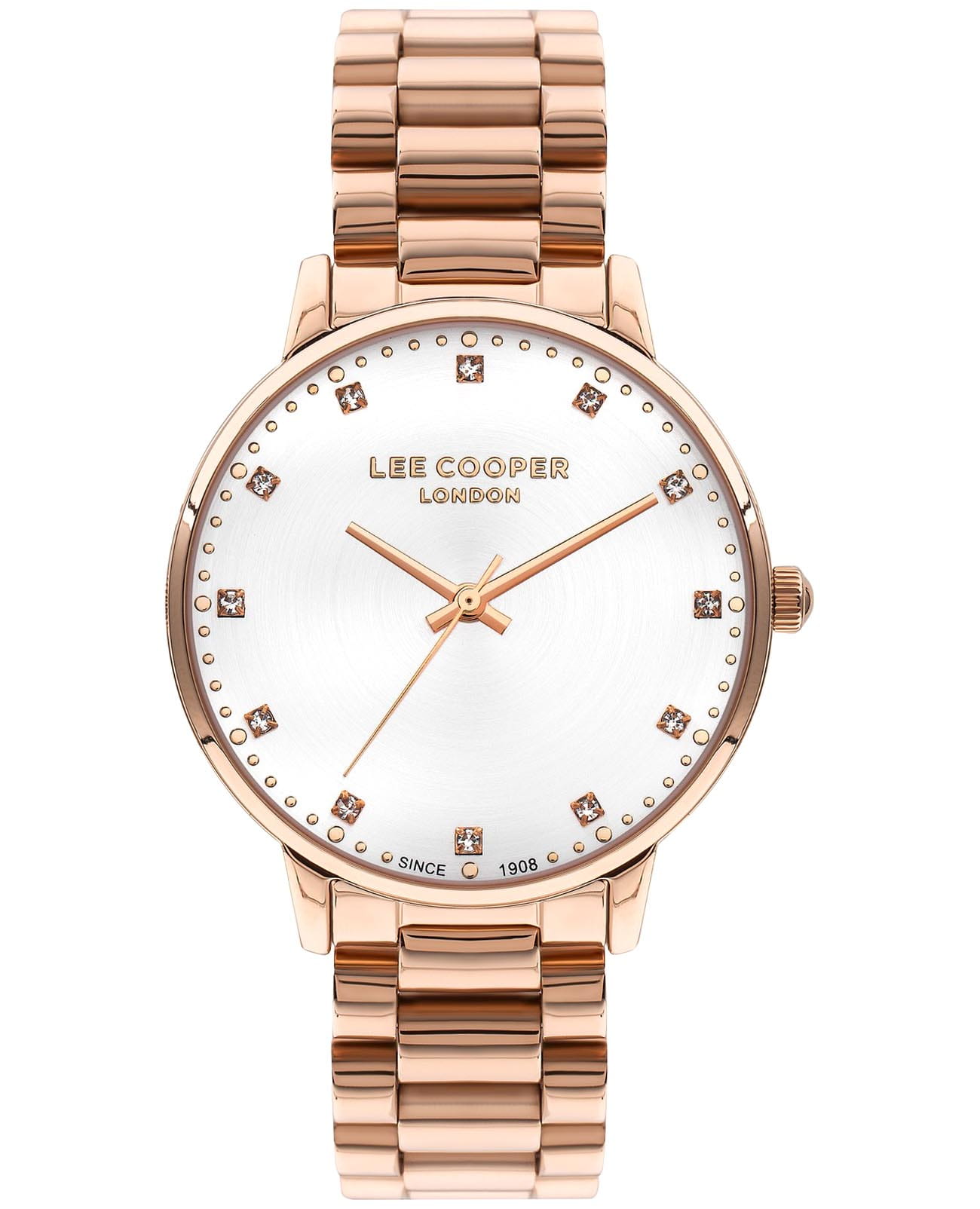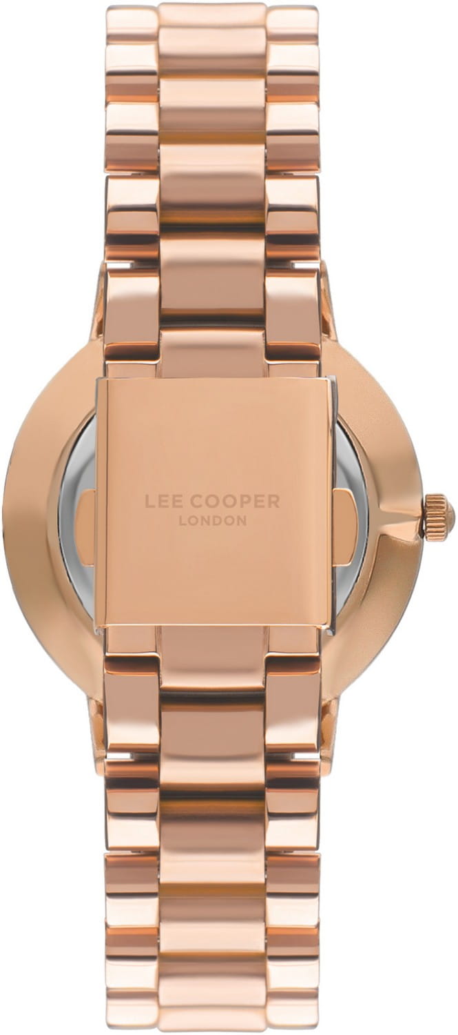 Женские часы Lee Cooper LC07548.430 — это стильное сочетание элегантности и современного дизайна. Круглый корпус диаметром 36 мм выполнен из суперметалла с IP-покрытиемIP-покрытиеМетод ионного напыления. Демонстрирует повышенную устойчивость к истиранию, окислению и химическим веществам. Под воздействием высокого давления и температуры около 1500°C молекулы металла надёжно соединяются с частицами корпуса часов. цвета розового золота, что придает модели особый блеск. Серебристый циферблат защищен минеральным стекломМинеральное стеклоМинеральное стекло представляет собой искусственно выращенный минерал кварца. Такое стекло отличается особой устойчивостью к повреждениям и царапинам. Уступает по некоторым качествам сапфировому стеклу., обеспечивающим устойчивость к царапинам и украшен цирконами в виде меток. Часы оснащены надежным кварцевым механизмом, а металлический браслет с IP-покрытиемIP-покрытиеМетод ионного напыления. Демонстрирует повышенную устойчивость к истиранию, окислению и химическим веществам. Под воздействием высокого давления и температуры около 1500°C молекулы металла надёжно соединяются с частицами корпуса часов. на раскладной застёжкеРаскладная застёжкаТакой тип застёжки используется только на браслетах из металла. Она никогда не раскрывается полностью, происходит разделение на 2 и более частей. Раскладывающая застёжка снизит вероятность потери часов к минимуму. гарантирует комфортную посадку на запястье. Водозащита 30 метров защищает модель от случайных брызг и дождя. Lee Cooper  — отличный выбор для тех, кто ценит утонченность и качество.