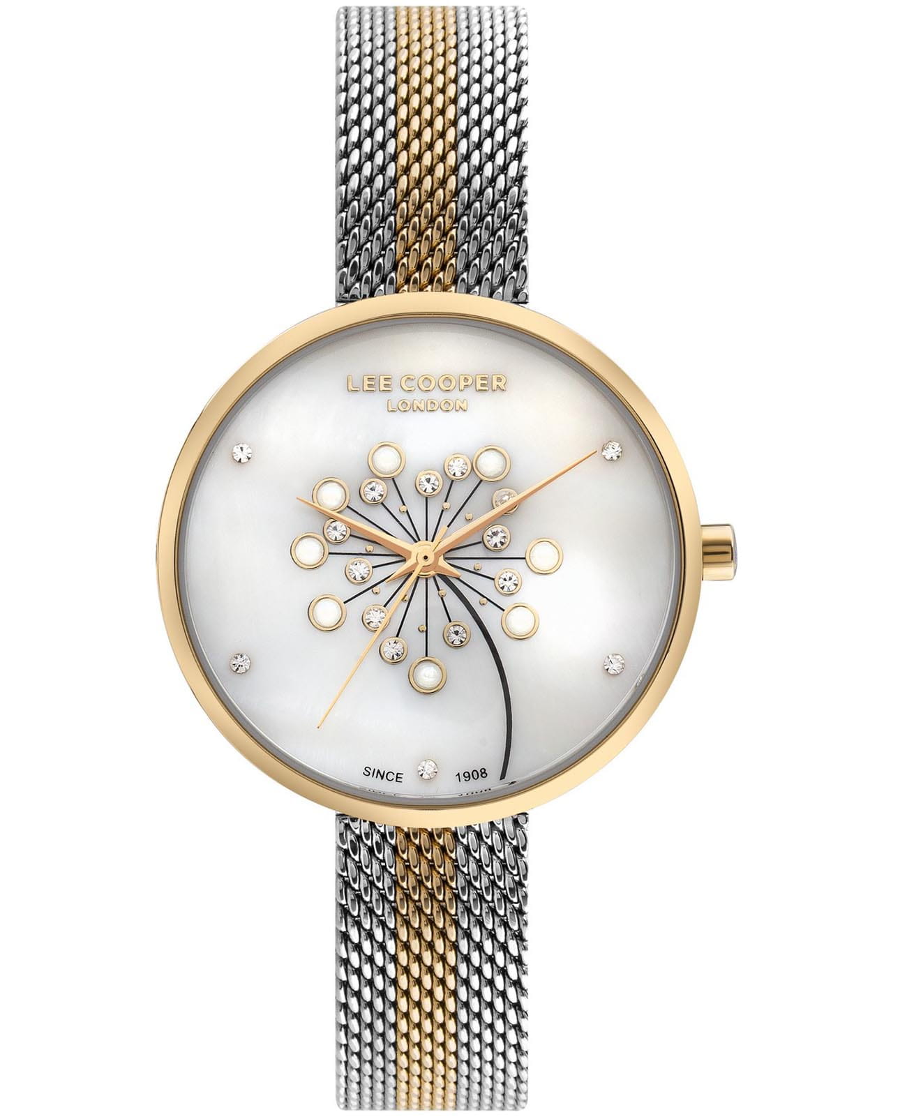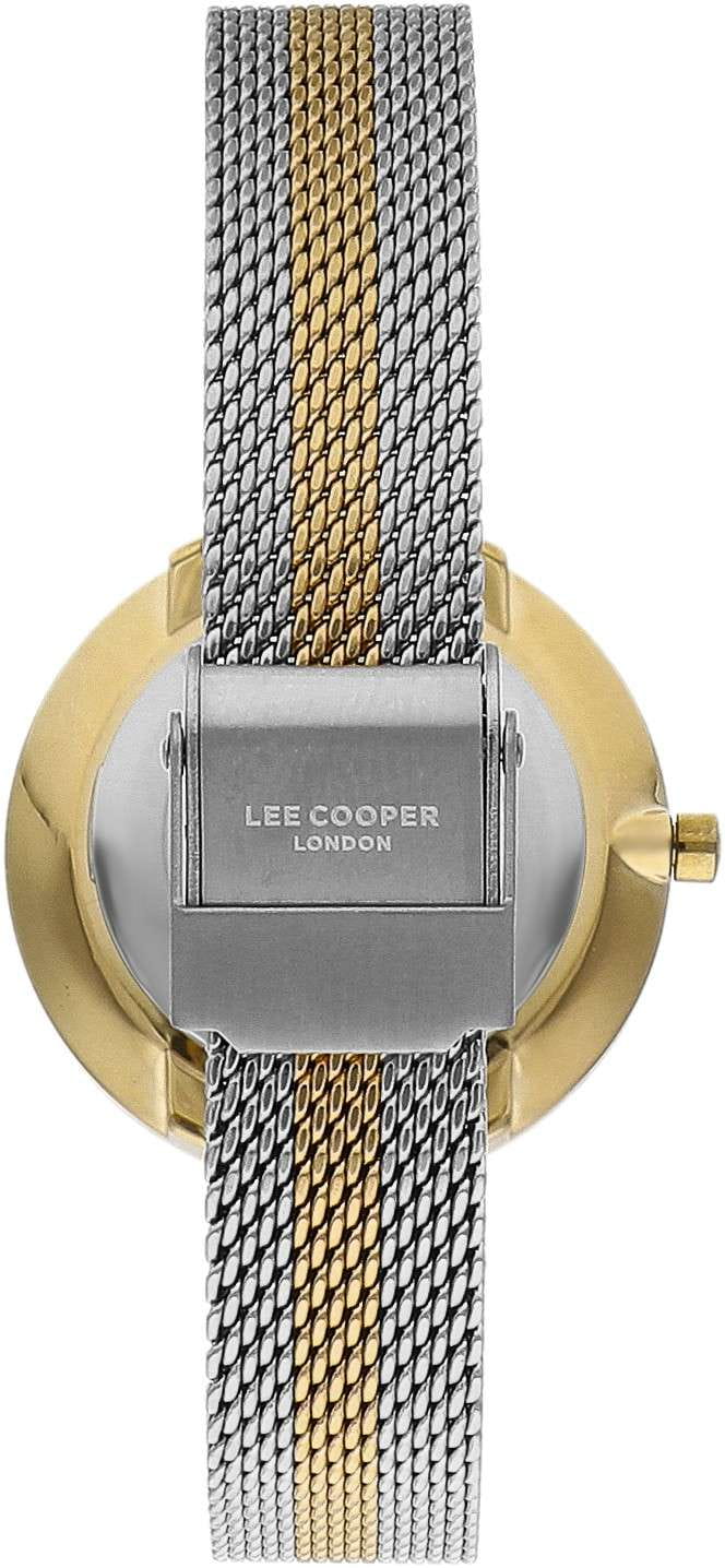 Женские часы Lee Cooper LC07601.220 — это стильное сочетание элегантности и современного дизайна. Круглый корпус диаметром 32 мм выполнен из суперметалла с IP-покрытиемIP-покрытиеМетод ионного напыления. Демонстрирует повышенную устойчивость к истиранию, окислению и химическим веществам. Под воздействием высокого давления и температуры около 1500°C молекулы металла надёжно соединяются с частицами корпуса часов. золотистого цвета. Циферблат украшен цирконами и защищен минеральным стекломМинеральное стеклоМинеральное стекло представляет собой искусственно выращенный минерал кварца. Такое стекло отличается особой устойчивостью к повреждениям и царапинам. Уступает по некоторым качествам сапфировому стеклу., обеспечивающий устойчивость к царапинам. Центральные часовая, минутная и секундная стрелки. Часы оснащены надежным кварцевым механизмом, источник питания - батарейка. Металлический браслет миланского плетения с частичным IP-покрытиемIP-покрытиеМетод ионного напыления. Демонстрирует повышенную устойчивость к истиранию, окислению и химическим веществам. Под воздействием высокого давления и температуры около 1500°C молекулы металла надёжно соединяются с частицами корпуса часов. на раскладном замкеРаскладная застёжкаТакой тип застёжки используется только на браслетах из металла. Она никогда не раскрывается полностью, происходит разделение на 2 и более частей. Раскладывающая застёжка снизит вероятность потери часов к минимуму. гарантирует комфортную посадку на запястье. Водозащита 30 метров защищает модель от случайных брызг и дождя. Lee Cooper  — отличный выбор для тех, кто ценит утонченность и качество.
