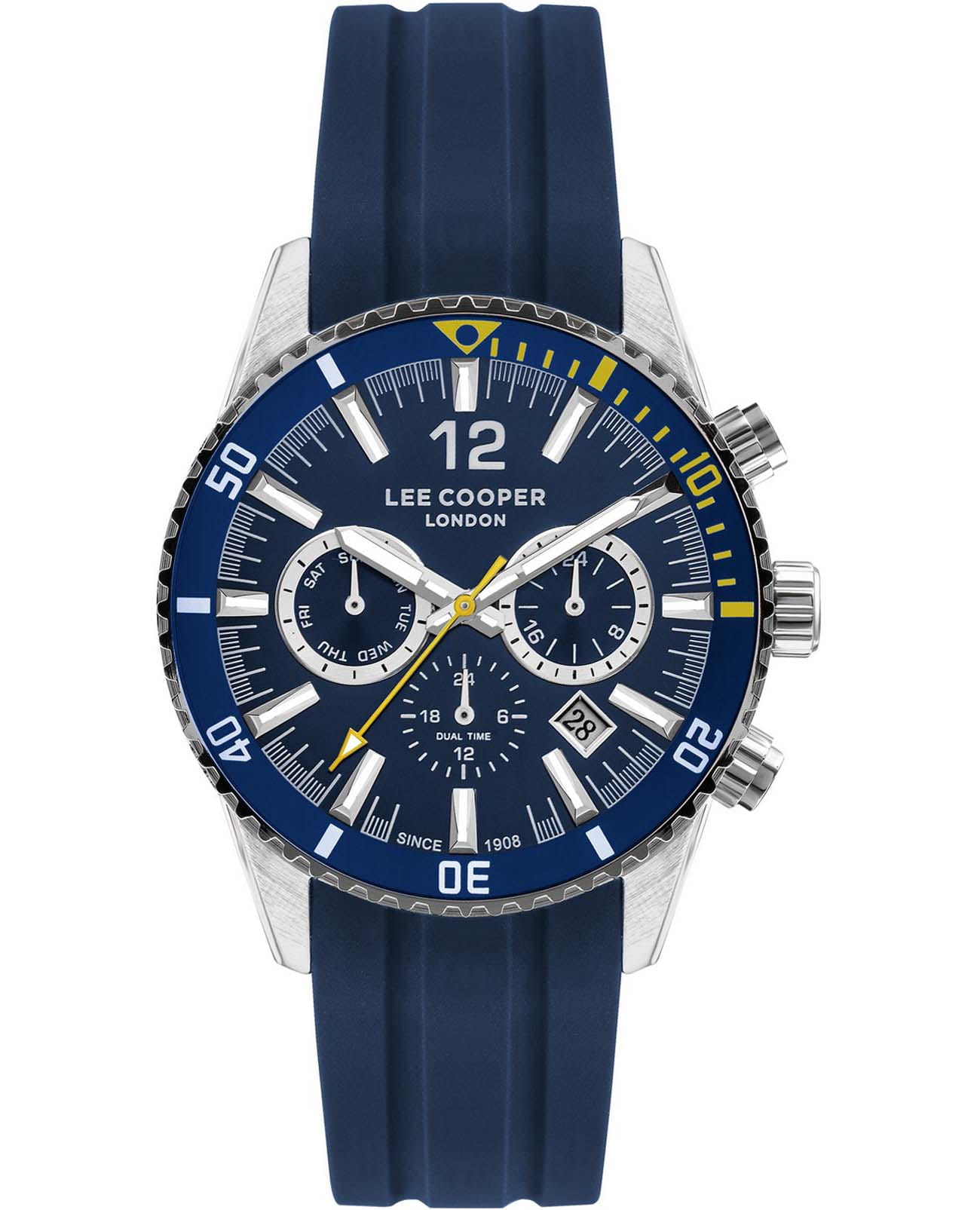 Мужские кварцевые часы Lee Cooper LC07628.399 — это мультифункциональный аксессуар с лаконичным дизайном. Изысканный корпус диаметром 44 мм выполнен из суперметалла серебристого цвета с поворотным безелемБезельВнешний ободок, закрепляющий стекло. В спортивных часах так называется поворотное кольцо с делениями на циферблате, выполняет роль таймера – замеряет отрезки времени на шкале. Неподвижный безель – элемент декора. Однонаправленно вращающийся безель на дайверских часах позволяет фиксировать моменты погружения и выныривания на поверхность. с IP-покрытиемIP-покрытиеМетод ионного напыления. Демонстрирует повышенную устойчивость к истиранию, окислению и химическим веществам. Под воздействием высокого давления и температуры около 1500°C молекулы металла надёжно соединяются с частицами корпуса часов.. Стильный циферблат оформлен изысканными индексами и дополнен окошками даты, дня недели и 24-часового индикатора. Циферблат защищён минеральным стекломМинеральное стеклоМинеральное стекло представляет собой искусственно выращенный минерал кварца. Такое стекло отличается особой устойчивостью к повреждениям и царапинам. Уступает по некоторым качествам сапфировому стеклу.. Стрелки и метки с люминесцентным покрытиемЛюминесцентное покрытиеПозволяет считывать показания времени в темноте. Производители наносят на стрелки, часовые индексы, безель или поверхность циферблата светонакопительный состав, дающий холодное свечение., обеспечивающим хорошую читаемость в темноте. Функция второго часового поясаВторой часовой поясФункция, позволяющая отображать время двух часовых поясов одновременно. делает часы удобными для путешественников. Часы оснащены надежным каучуковым ремешком с классической пряжкой, что обеспечивает удобство и комфорт. Водонепроницаемость 50 м позволяет использовать часы для повседневного ношения. Универсальный выбор для тех, кто ценит функциональность и надёжность.