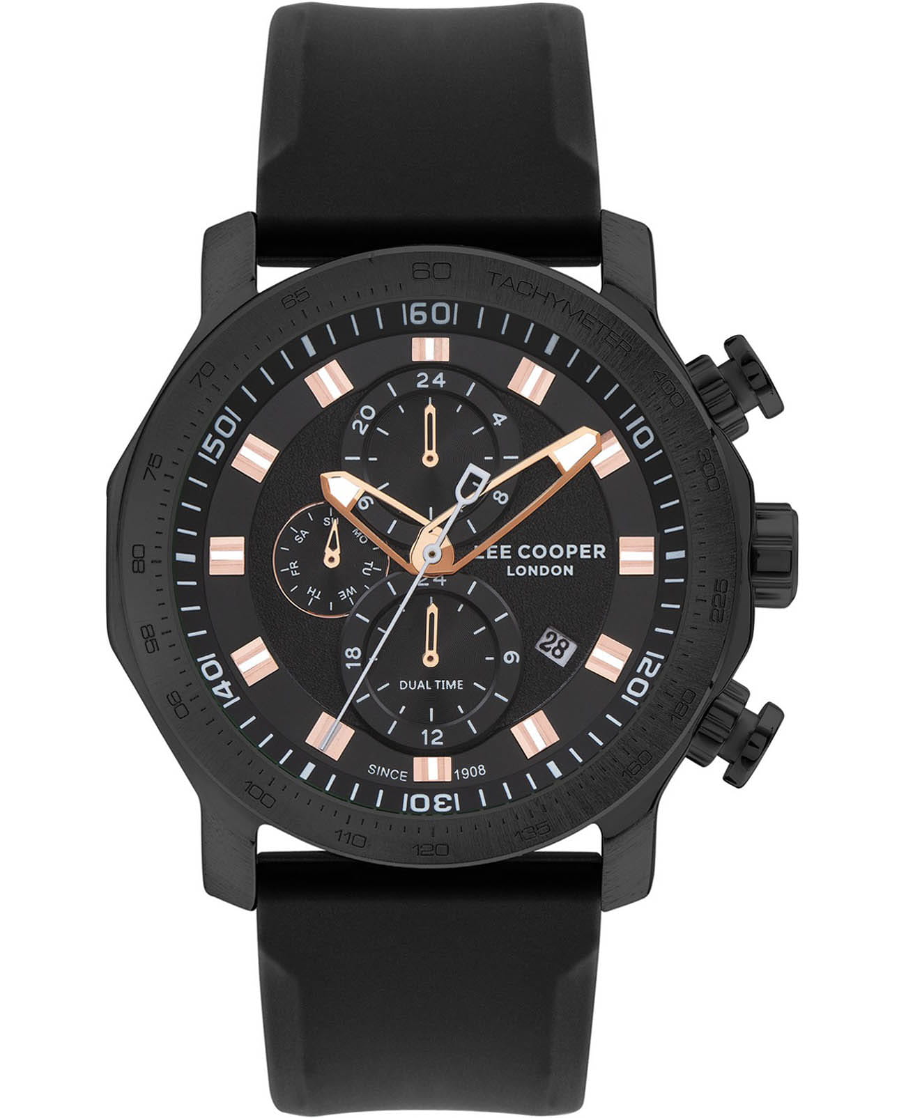 Lee Cooper LC07631.651  — элегантная модель с функциональными возможностями для повседневного использования. Корпус из суперметалла  с IP-покрытиемIP-покрытиеМетод ионного напыления. Демонстрирует повышенную устойчивость к истиранию, окислению и химическим веществам. Под воздействием высокого давления и температуры около 1500°C молекулы металла надёжно соединяются с частицами корпуса часов. черного цвета и диаметром 49 мм придаёт часам классический и современный вид. Циферблат защищён минеральным стекломМинеральное стеклоМинеральное стекло представляет собой искусственно выращенный минерал кварца. Такое стекло отличается особой устойчивостью к повреждениям и царапинам. Уступает по некоторым качествам сапфировому стеклу., устойчивым к царапинам, хорошо может выдержать небольшие удары и падения. Стильный циферблат оформлен изысканными индексами и дополнен окошками даты, дня недели и 24-часового индикатора, а также аккуратными метками и стрелками с люминесцентным покрытиемЛюминесцентное покрытиеПозволяет считывать показания времени в темноте. Производители наносят на стрелки, часовые индексы, безель или поверхность циферблата светонакопительный состав, дающий холодное свечение., что гарантирует читаемость даже в условиях недостаточного освещения. Функция второго часового поясаВторой часовой поясФункция, позволяющая отображать время двух часовых поясов одновременно. делает часы удобными для путешественников. Часы работают на кварцевом механизме, обеспечивающем точность хода. Каучуковый ремешок на стандартной застёжке гарантирует удобную посадку и надёжную фиксацию на запястье. Водозащита 50 метров защищает часы от брызг и дождя, делая их подходящими для повседневного использования.