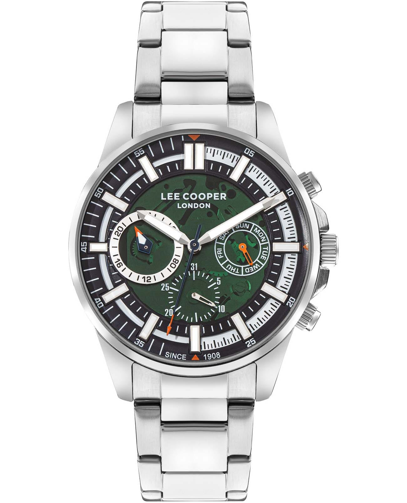 Lee Cooper LC07817.390  — элегантная модель с функциональными возможностями для повседневного использования. Корпус из суперметалла и диаметром 45 мм придаёт часам классический и современный вид. Циферблат защищён минеральным стекломМинеральное стеклоМинеральное стекло представляет собой искусственно выращенный минерал кварца. Такое стекло отличается особой устойчивостью к повреждениям и царапинам. Уступает по некоторым качествам сапфировому стеклу., устойчивым к царапинам, хорошо может выдержать небольшие удары и падения. Стильный циферблат оформлен изысканными индексами и дополнен окошками даты, дня недели и 24-часового индикатора, а также аккуратными метками и стрелками с люминесцентным покрытиемЛюминесцентное покрытиеПозволяет считывать показания времени в темноте. Производители наносят на стрелки, часовые индексы, безель или поверхность циферблата светонакопительный состав, дающий холодное свечение., что гарантирует читаемость даже в условиях недостаточного освещения. Часы работают на кварцевом механизме, обеспечивающем точность хода. Стальной браслет на раскладной застёжкеРаскладная застёжкаТакой тип застёжки используется только на браслетах из металла. Она никогда не раскрывается полностью, происходит разделение на 2 и более частей. Раскладывающая застёжка снизит вероятность потери часов к минимуму. гарантирует удобную посадку и надёжную фиксацию на запястье. Водозащита 50 метров защищает часы от брызг и дождя, делая их подходящими для повседневного использования.